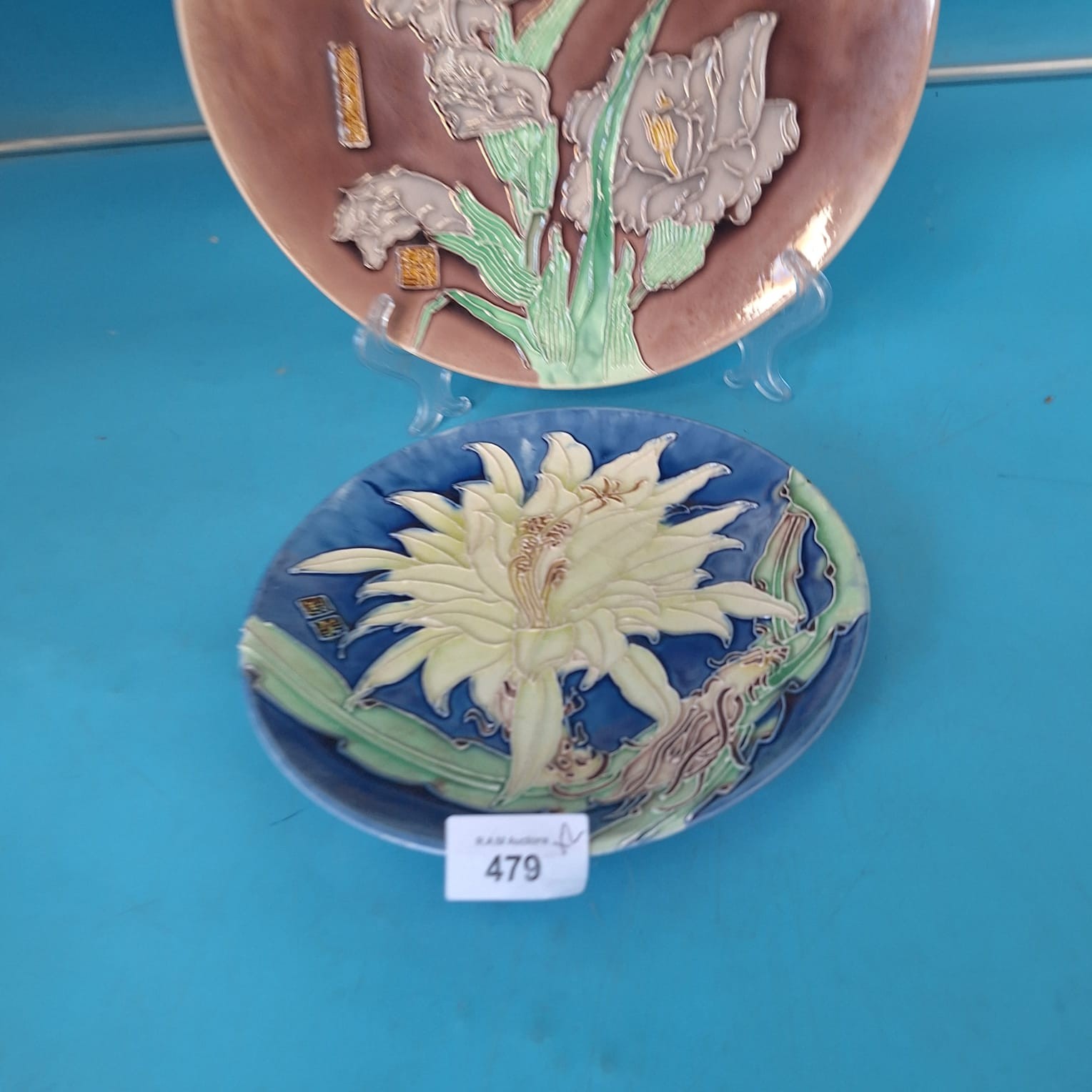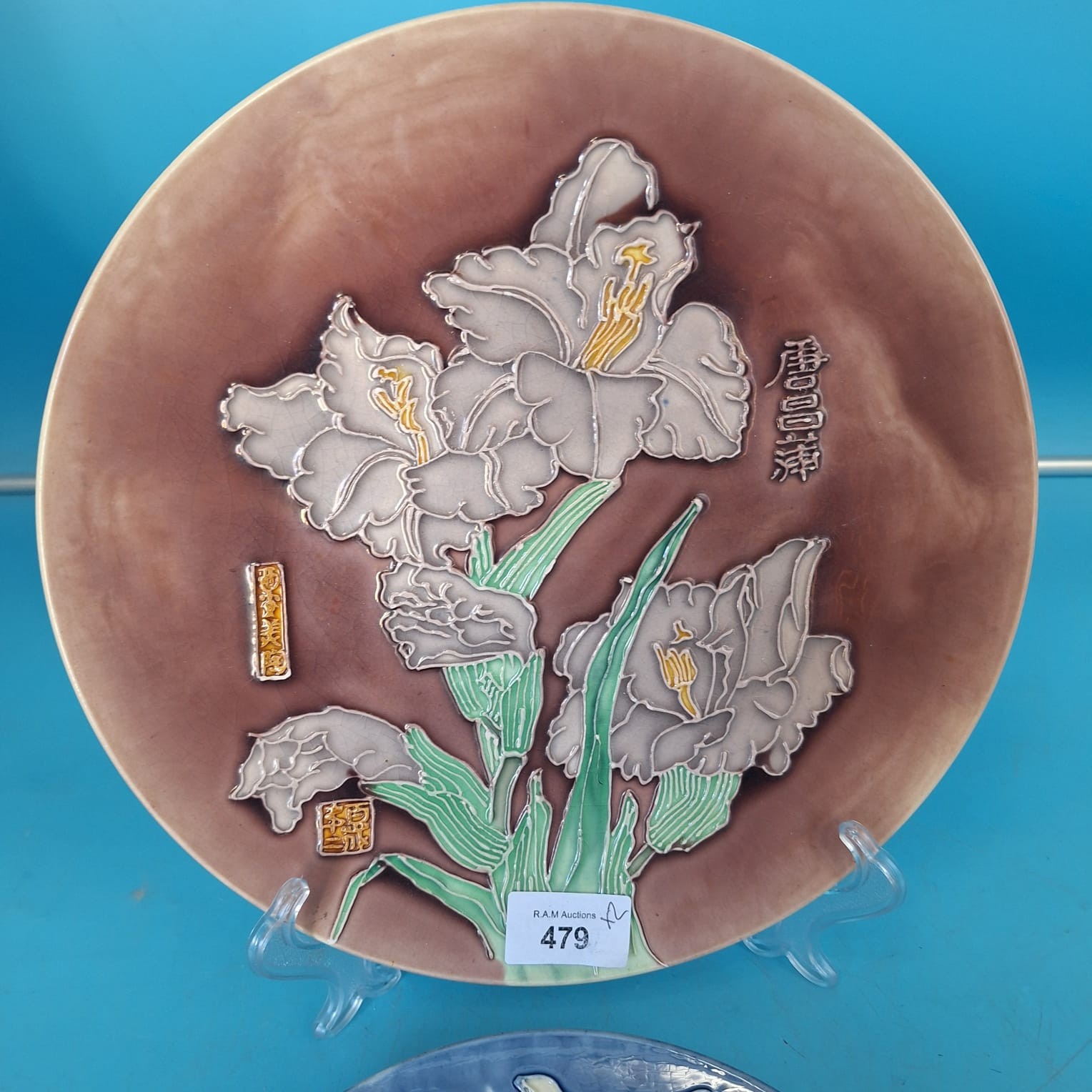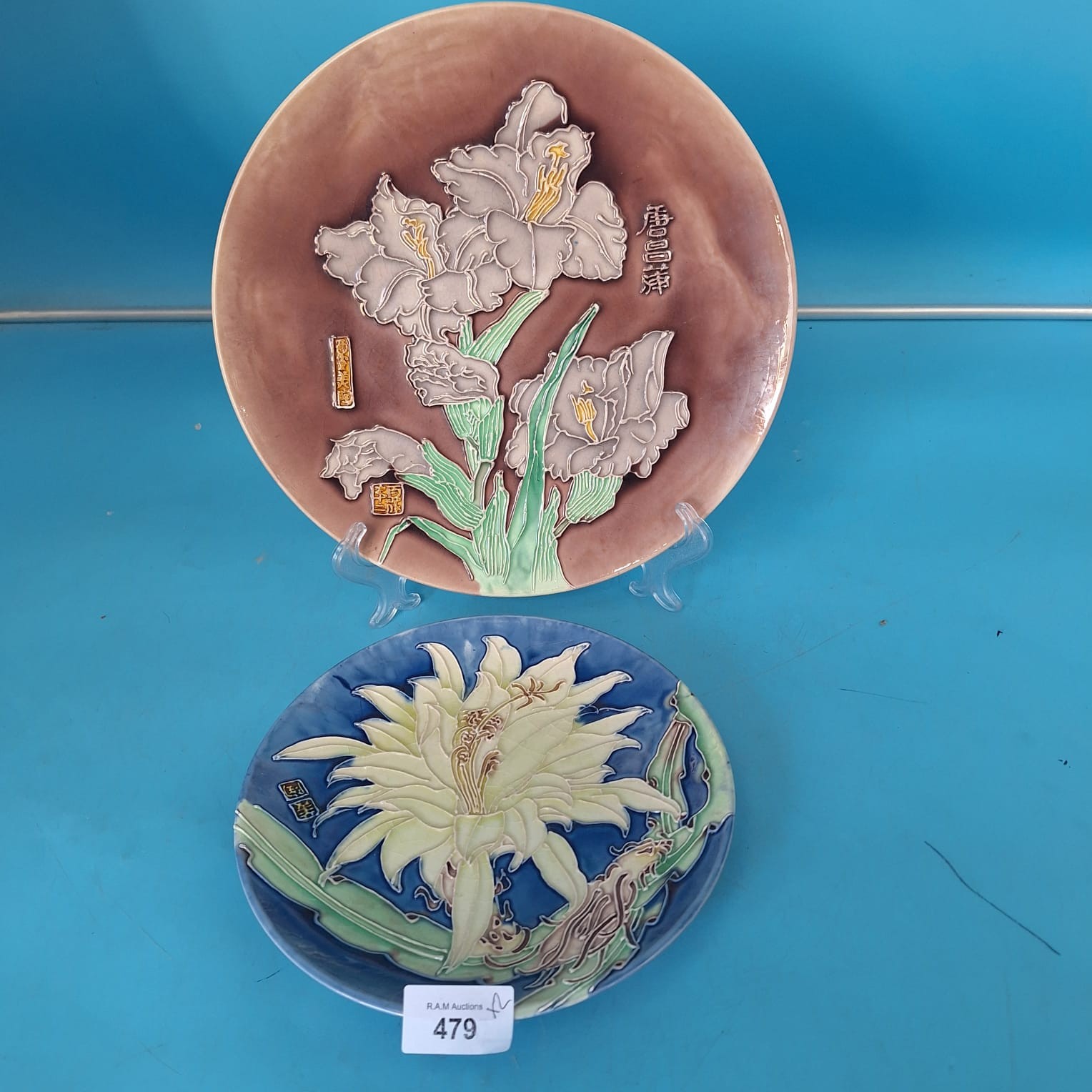 Two decorative plates featuring raised relief floral designs and Asian characters.