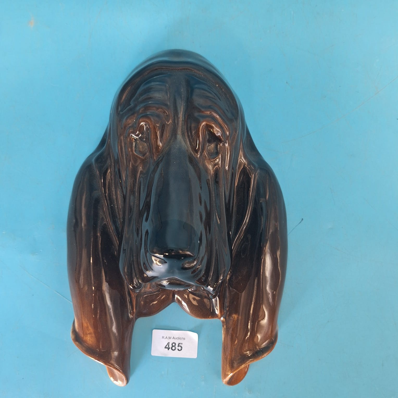 Glossy dark brown/black ceramic wall plaque shaped like a basset hound head, marked “CALDON HAUST MADE IN ENGLAND”.