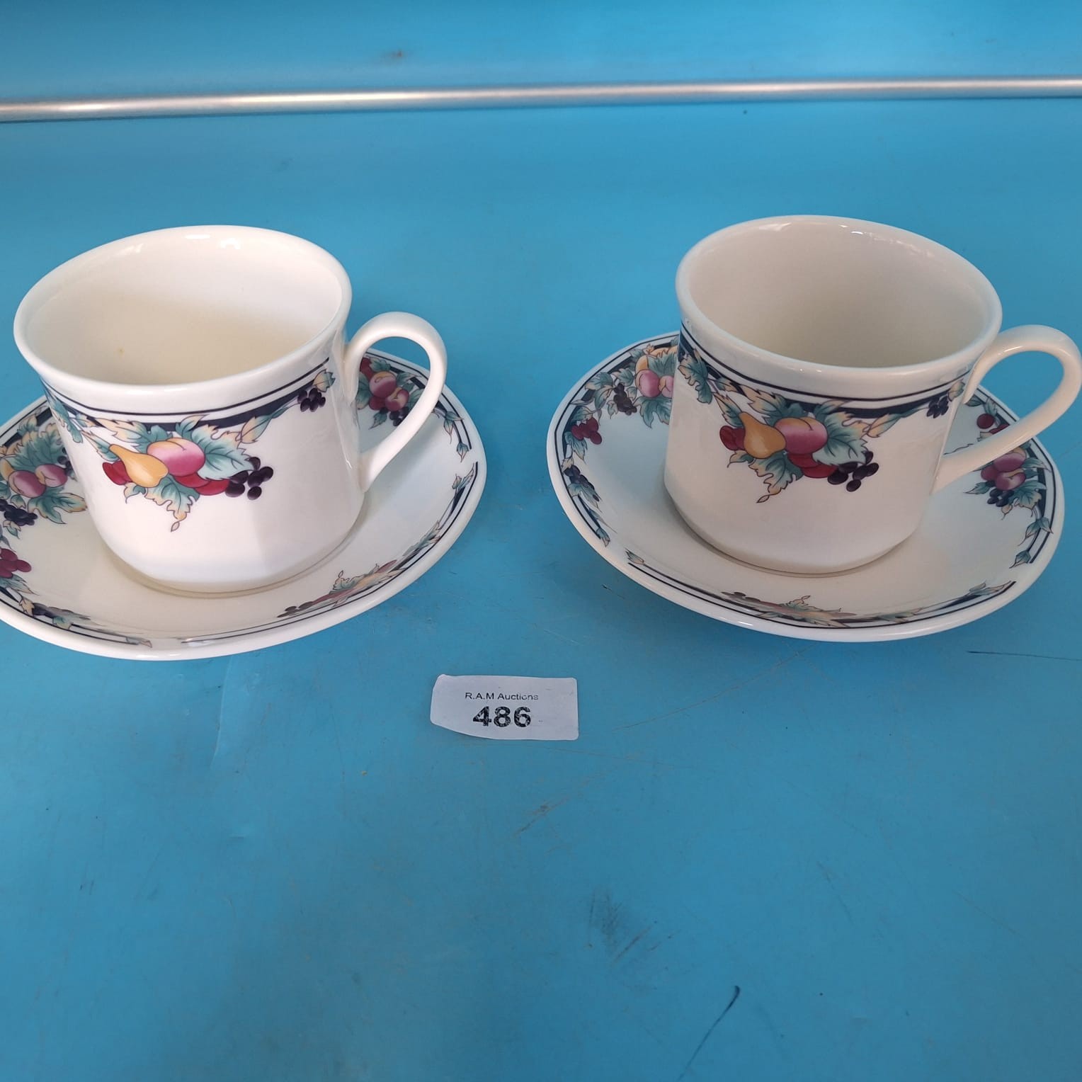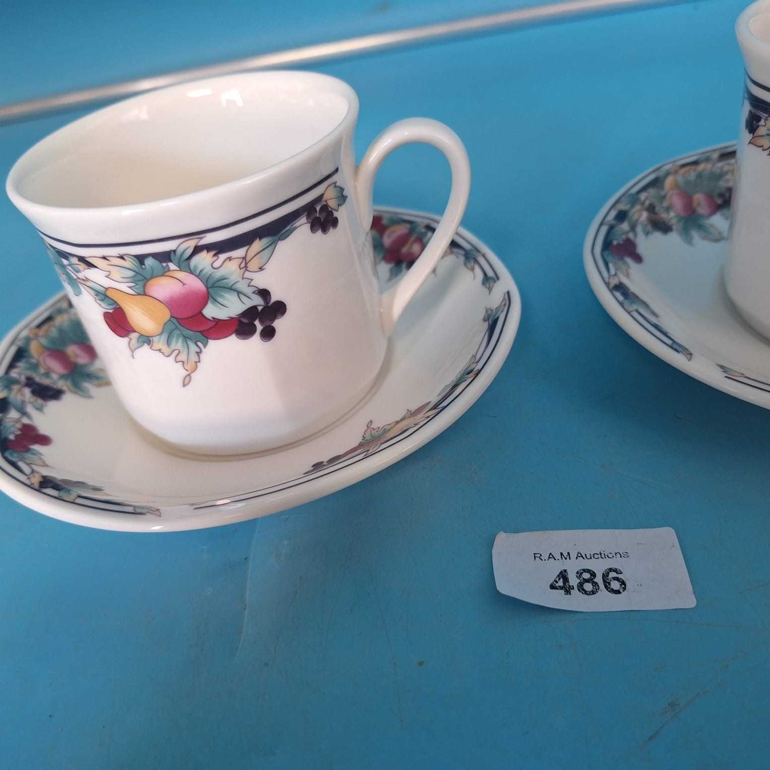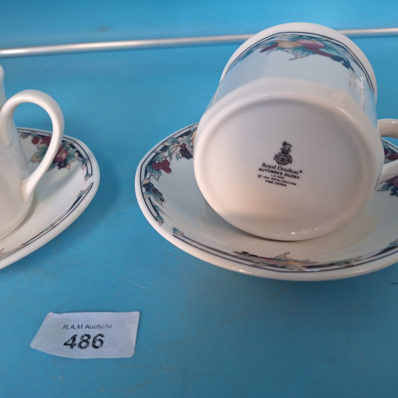 Royal Doulton “Autumn Glory” bone china teacups and saucers with fruit and leaf pattern.