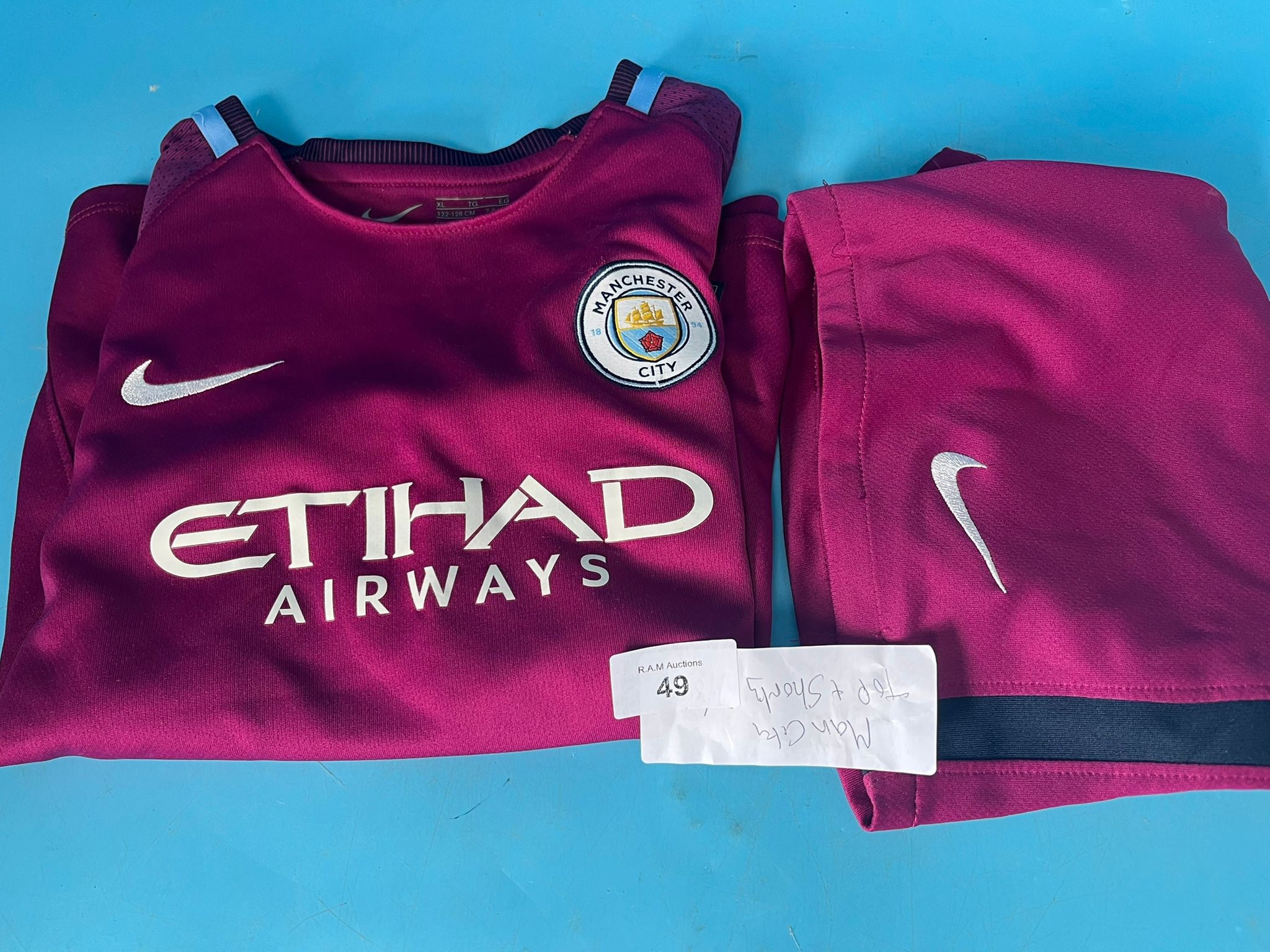 Maroon long-sleeved shirt and pants with Nike branding and Manchester City crest.