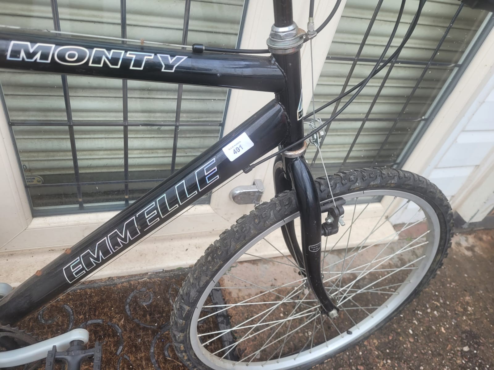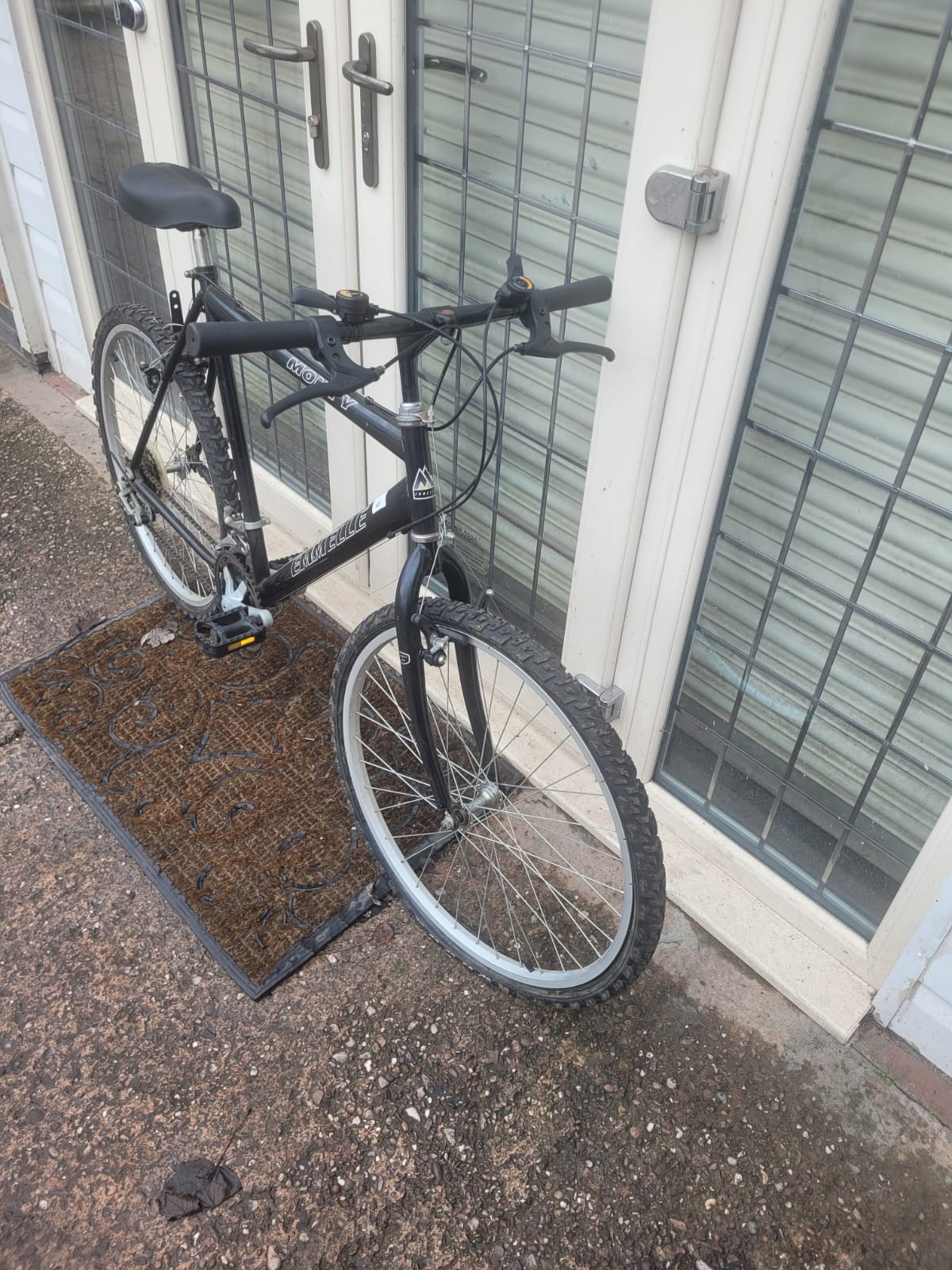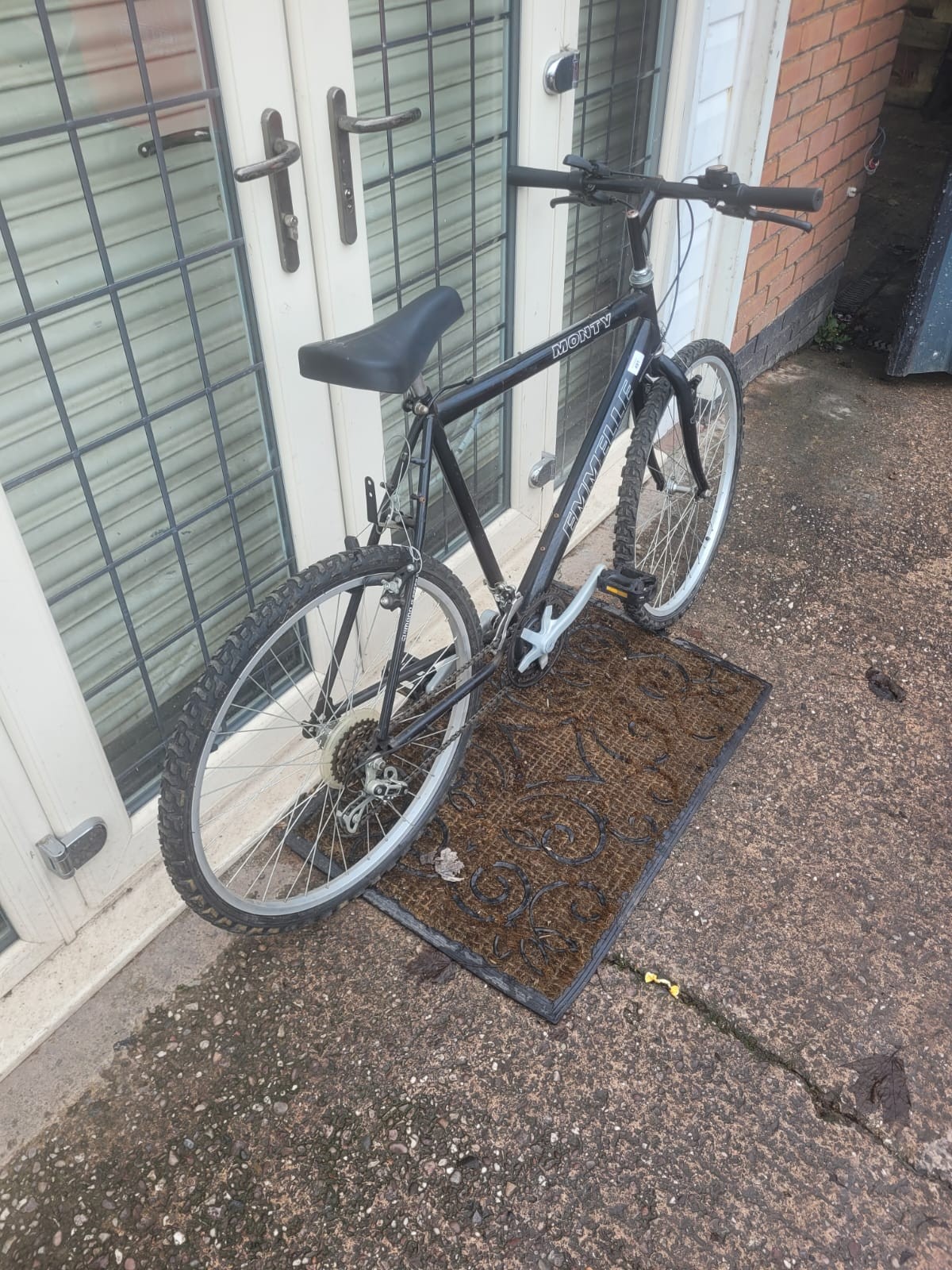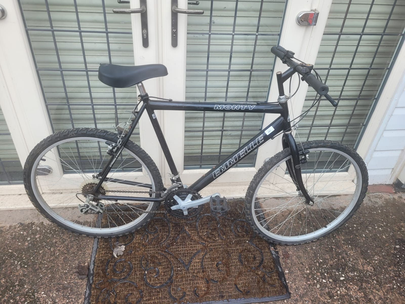 A black mountain bike with silver lettering, front suspension, and worn tires.