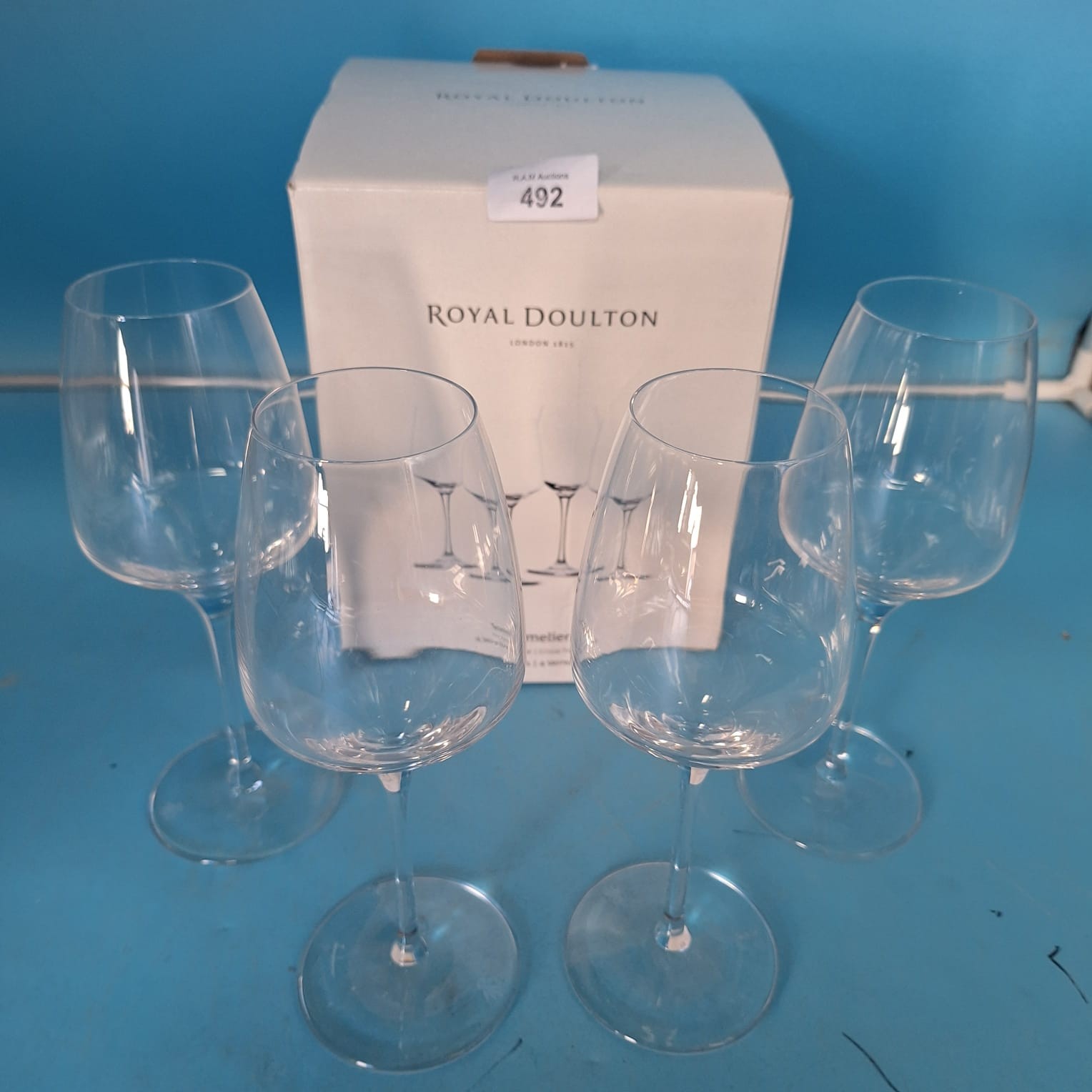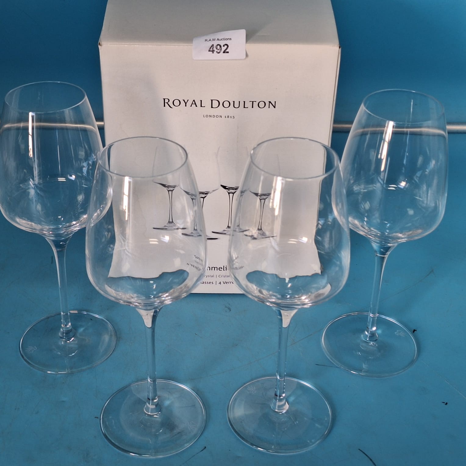 Set of four Royal Doulton Amelie Cristal wine glasses with a subtle etched pattern.