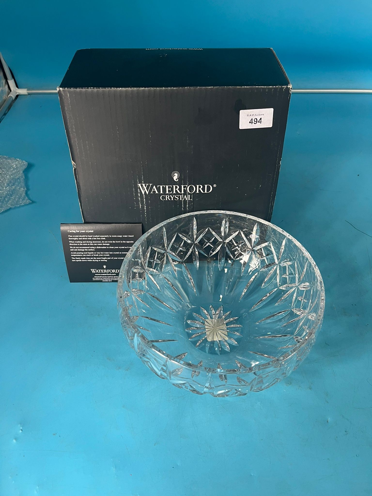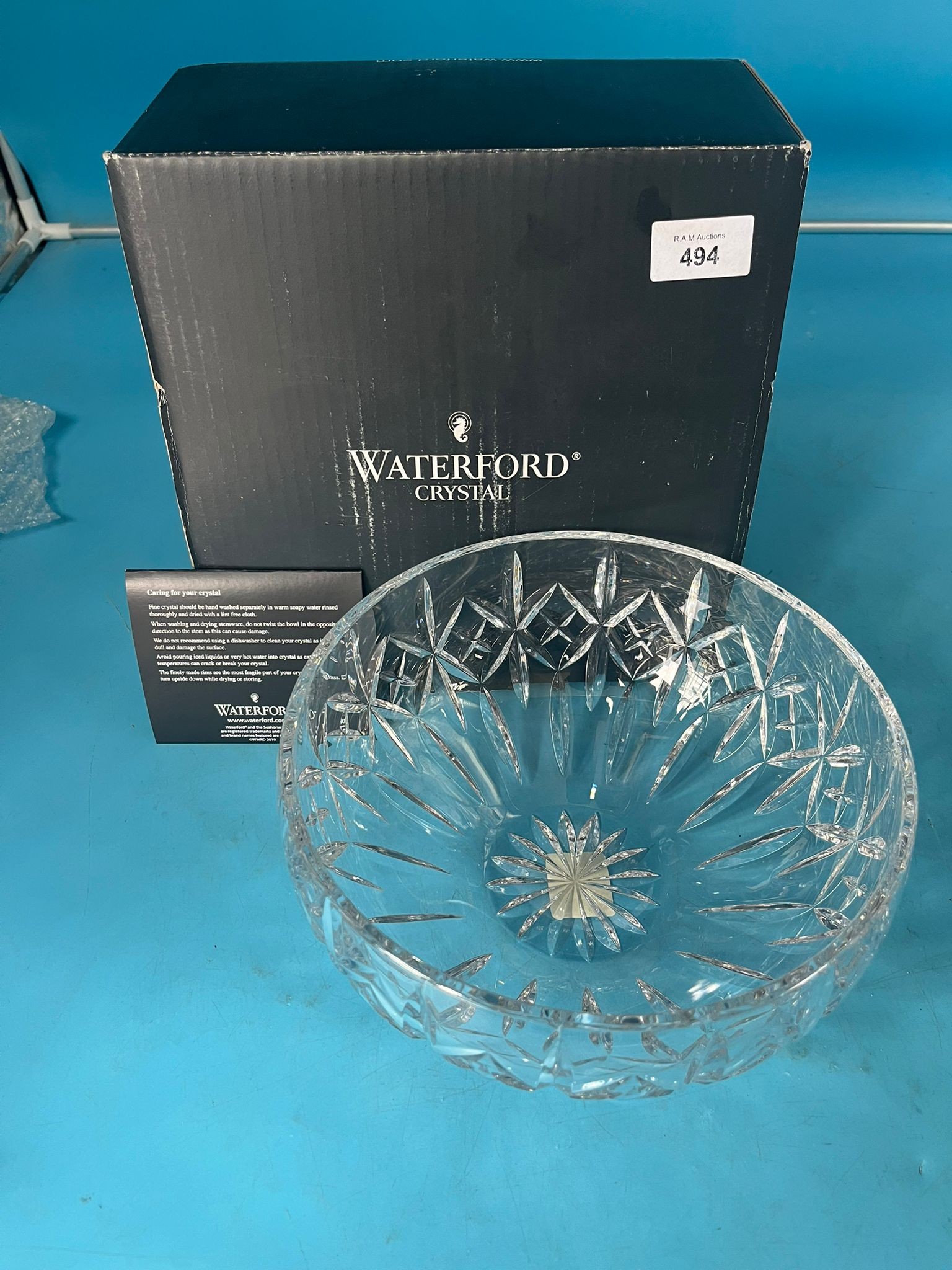 Clear crystal bowl with radiating starburst cut pattern and flared rim, presented in original box.