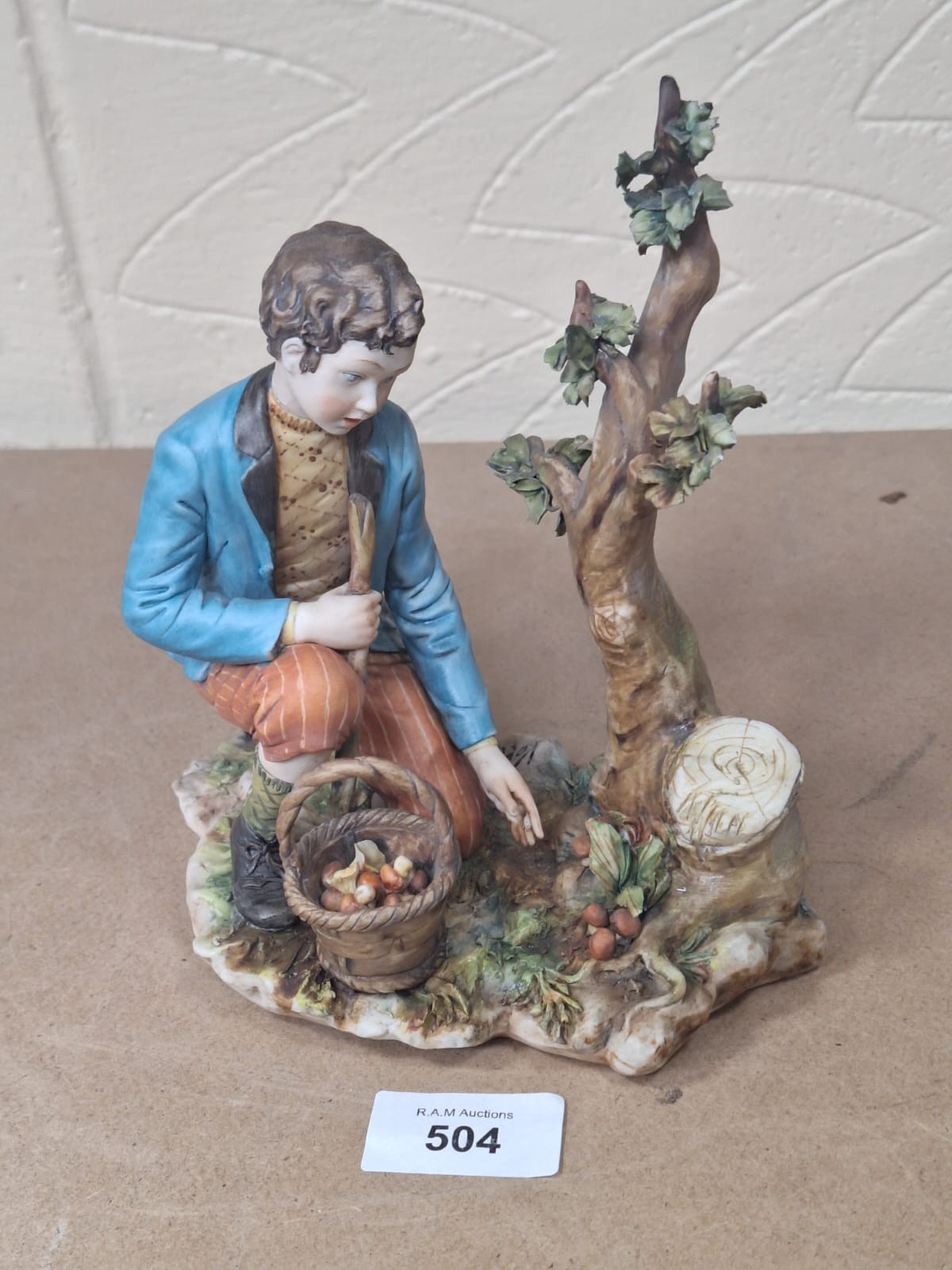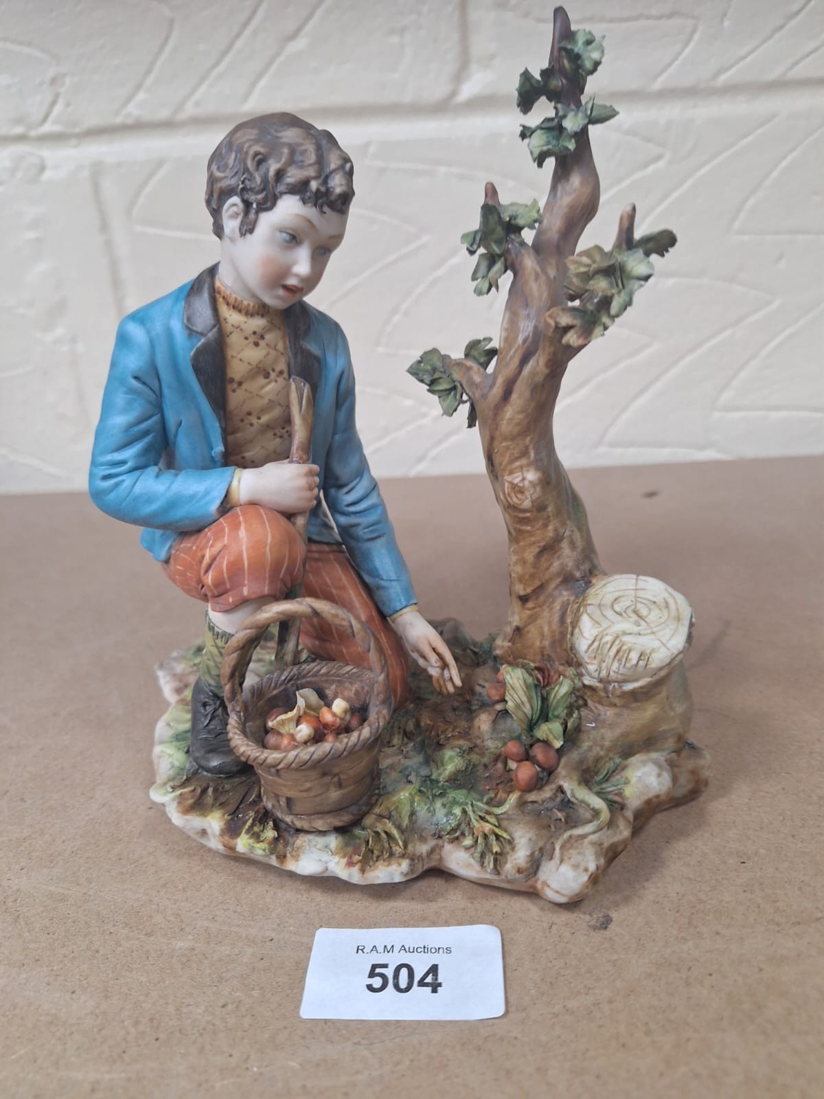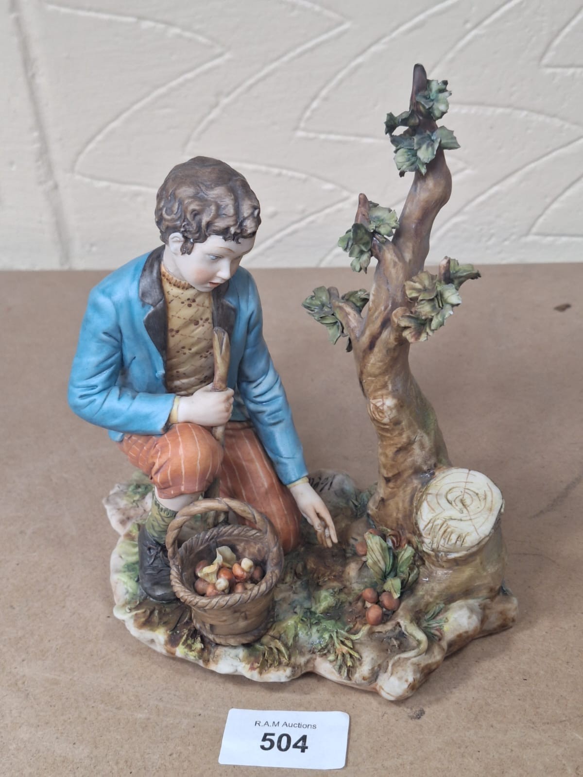 Porcelain figurine of a boy in a teal jacket and striped trousers picking nuts from a tree, with a basket and scattered nuts on a textured base.