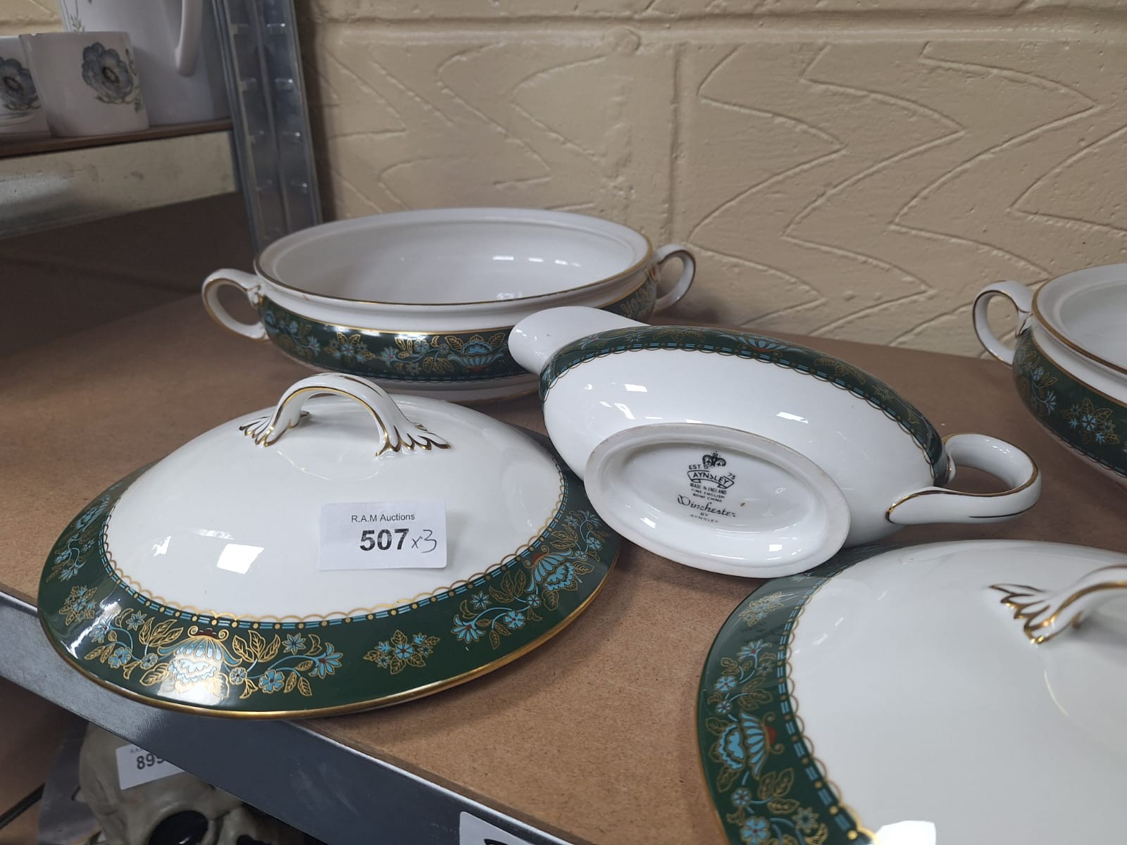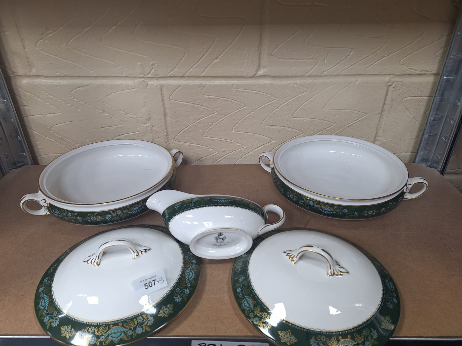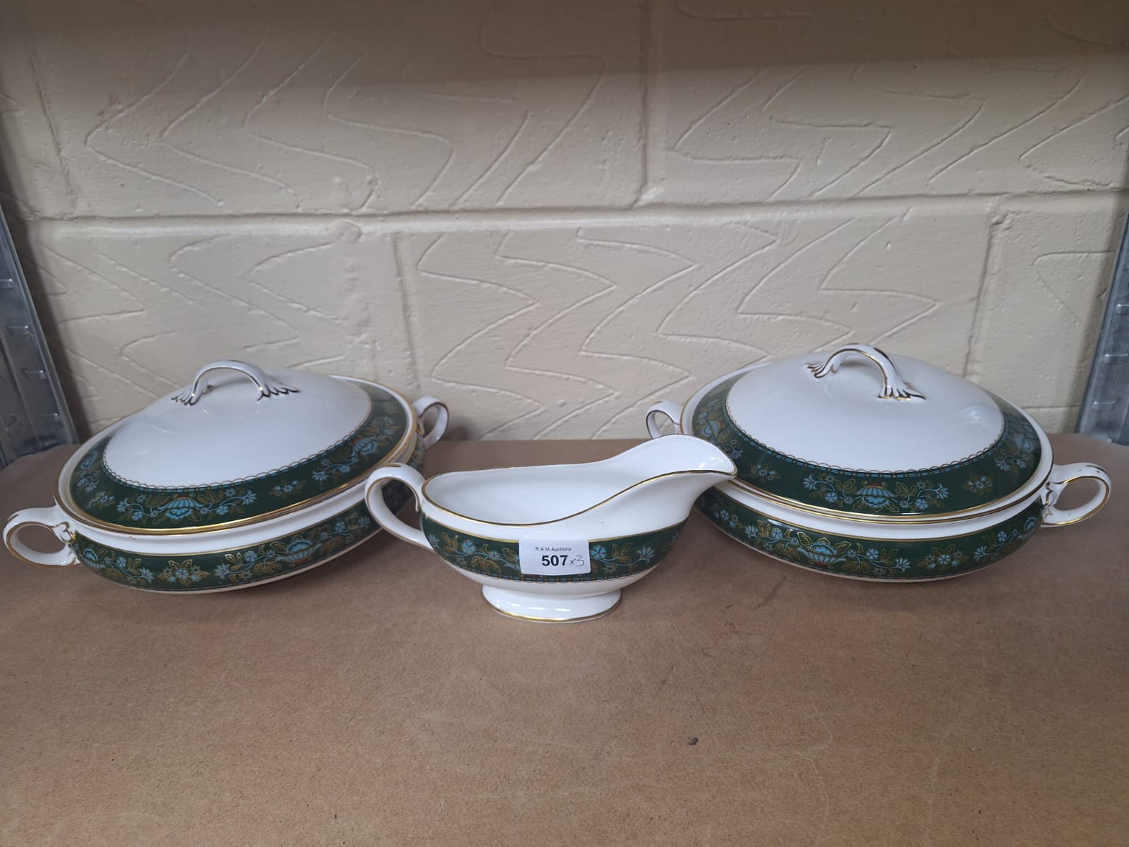 White porcelain serving dishes and gravy boat with a dark green border, gold floral pattern, and gold trim.