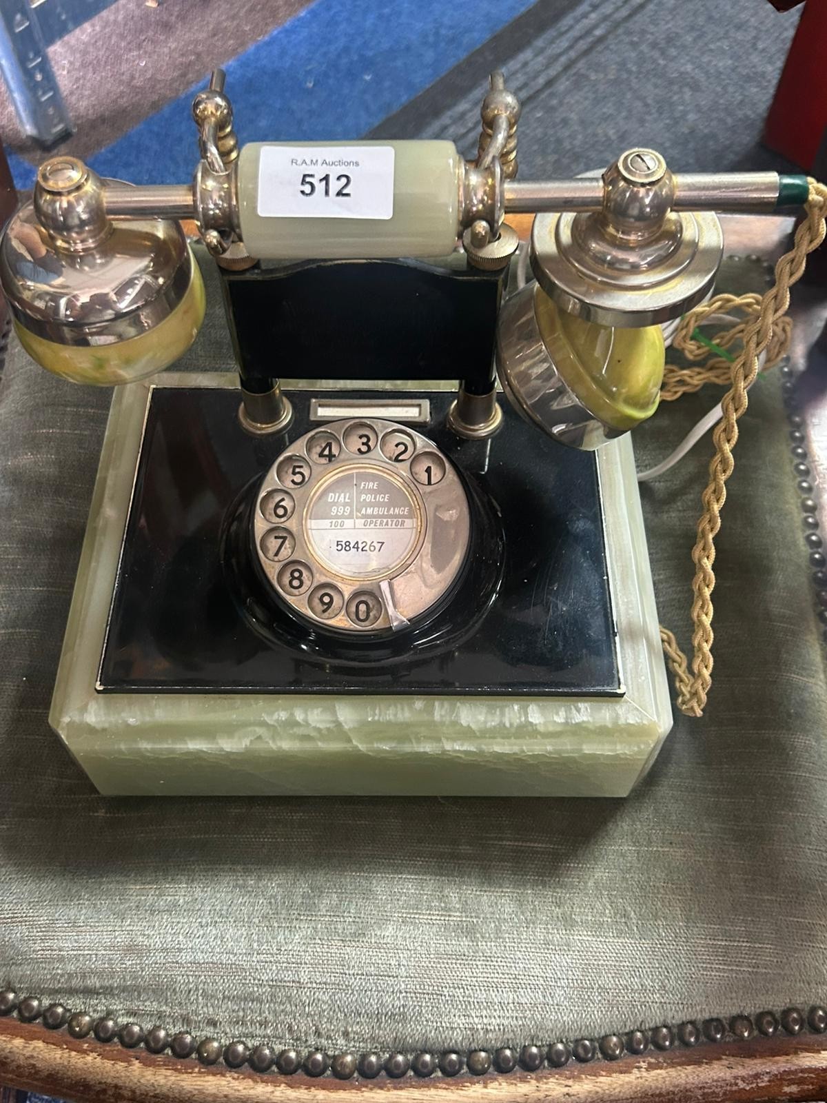 A black Bakelite rotary telephone with a pale green stone base and handset rests, featuring a silver-toned dial with emergency numbers.