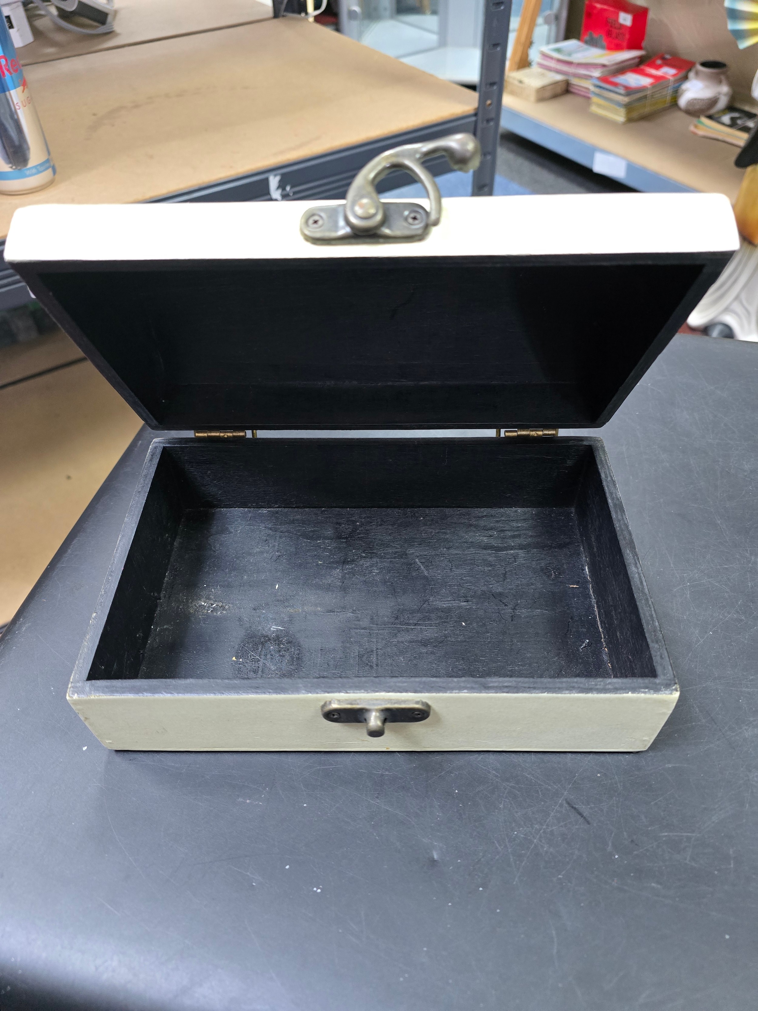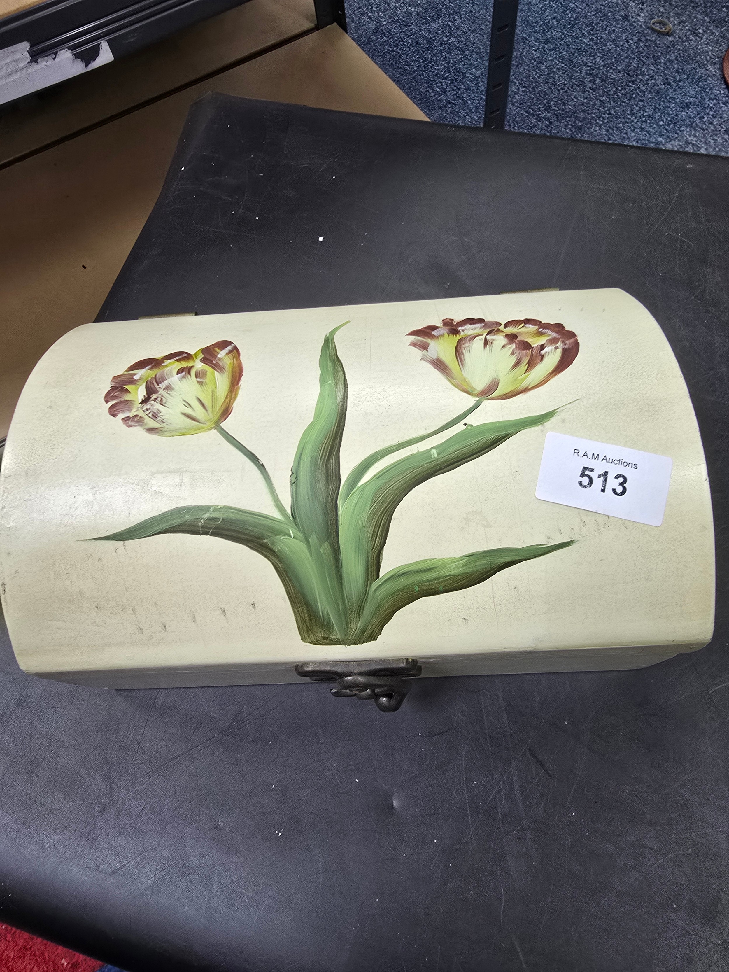 Off-white wooden box with a hinged lid, featuring a hand-painted tulip design.