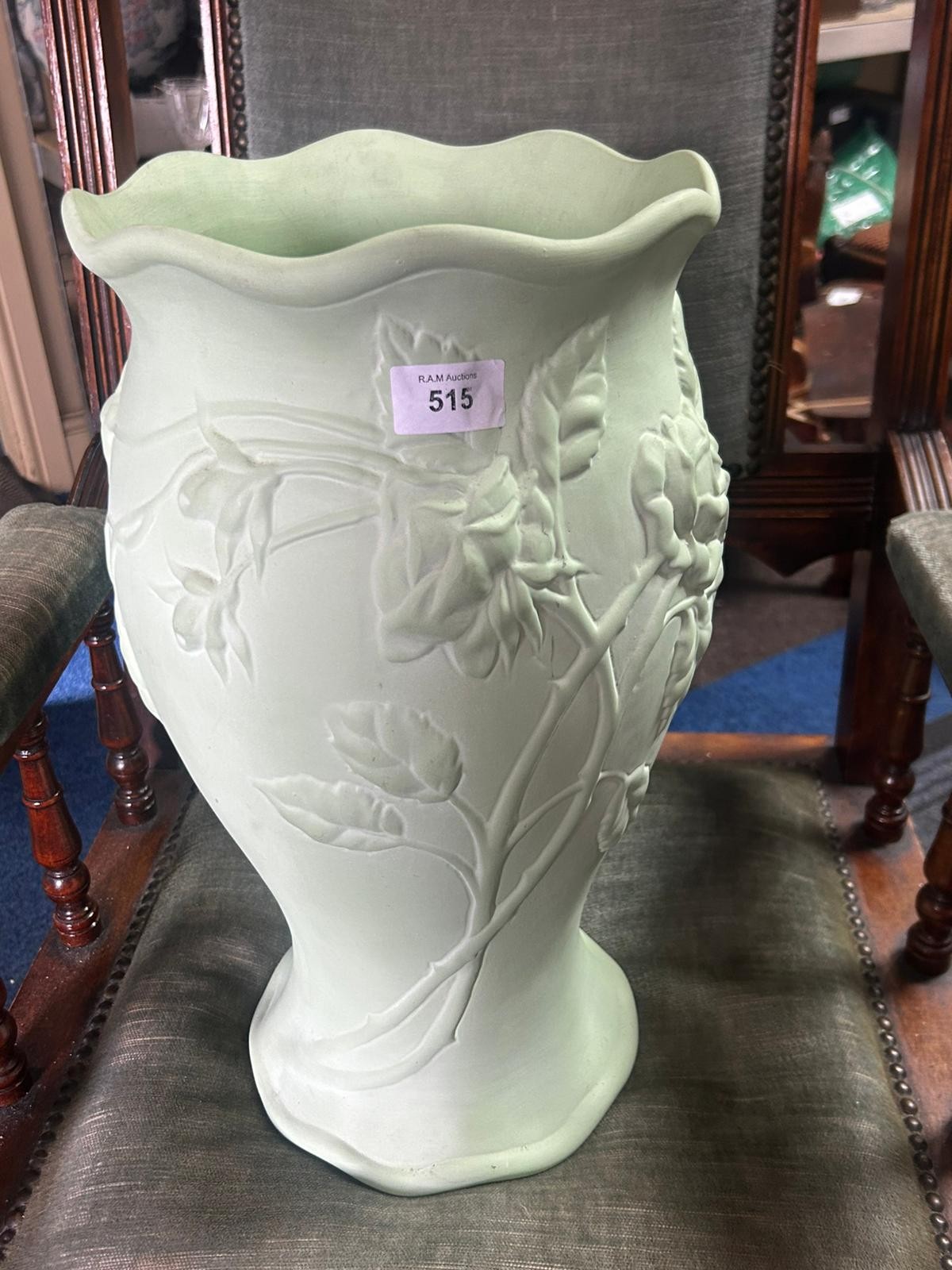 A pale green ceramic vase featuring a wavy rim and raised relief of stylized roses and leaves, with a slightly flared base.
