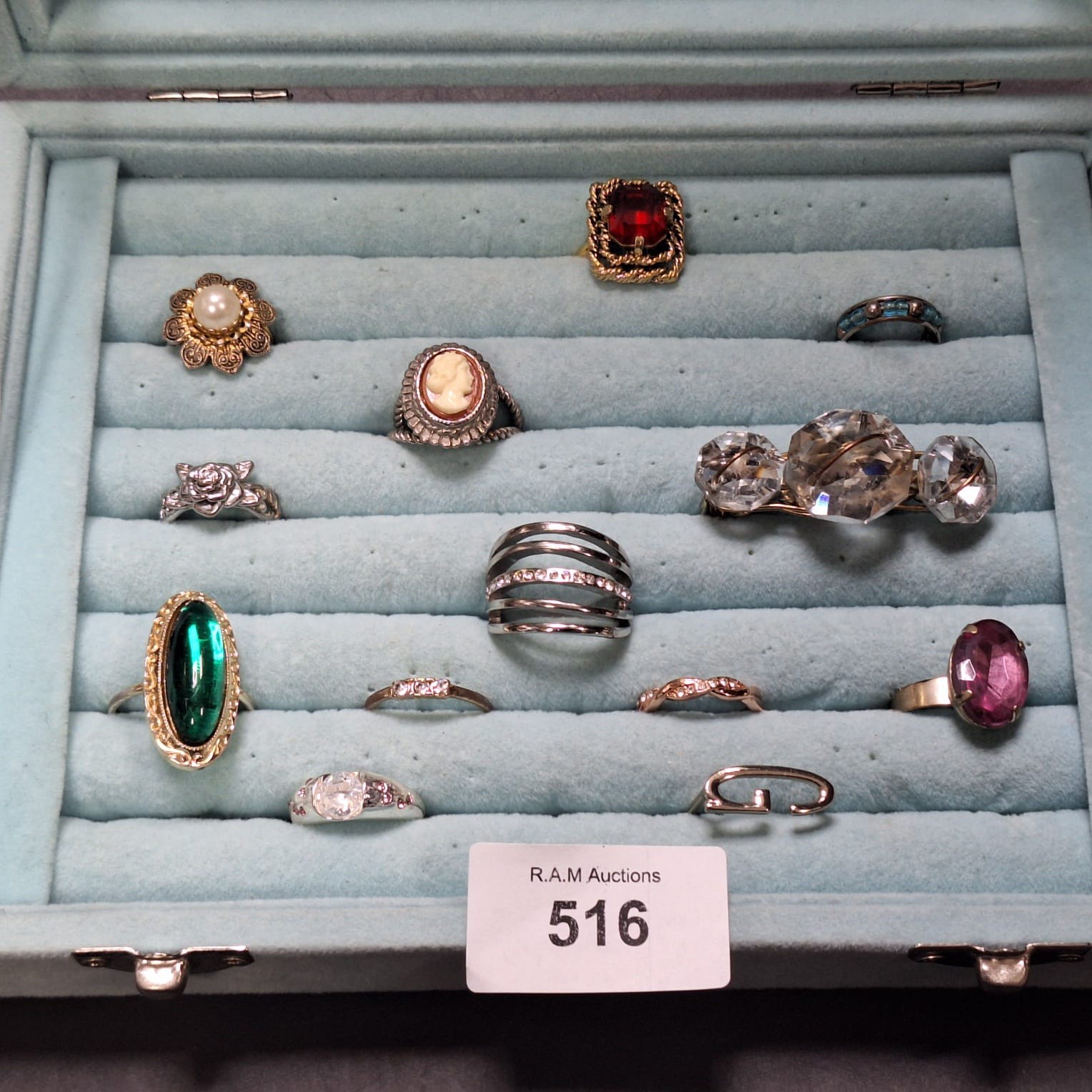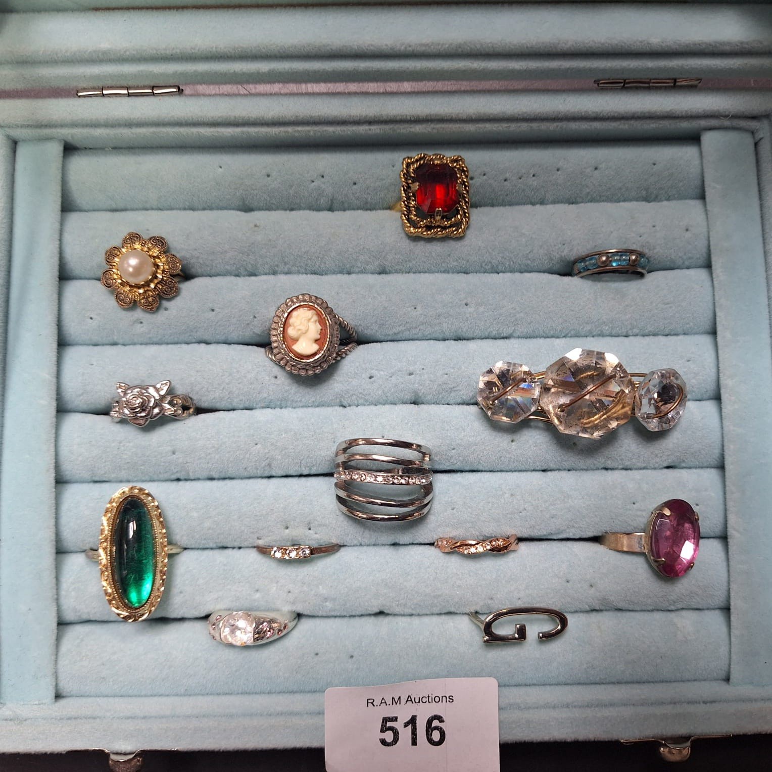 A light blue velvet-lined jewelry box containing assorted rings and a hair clip.