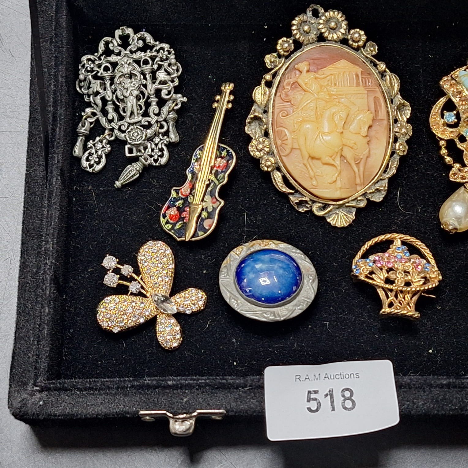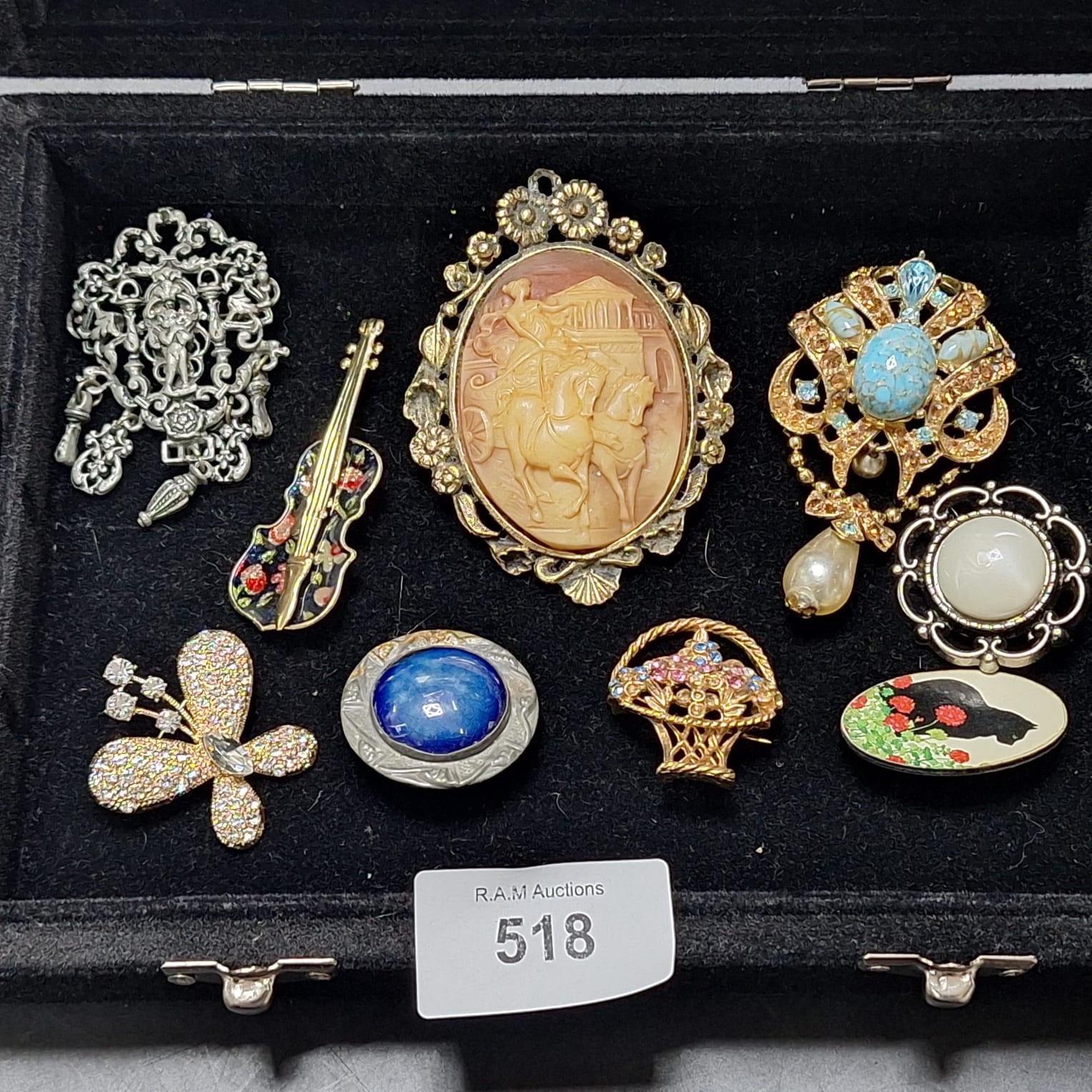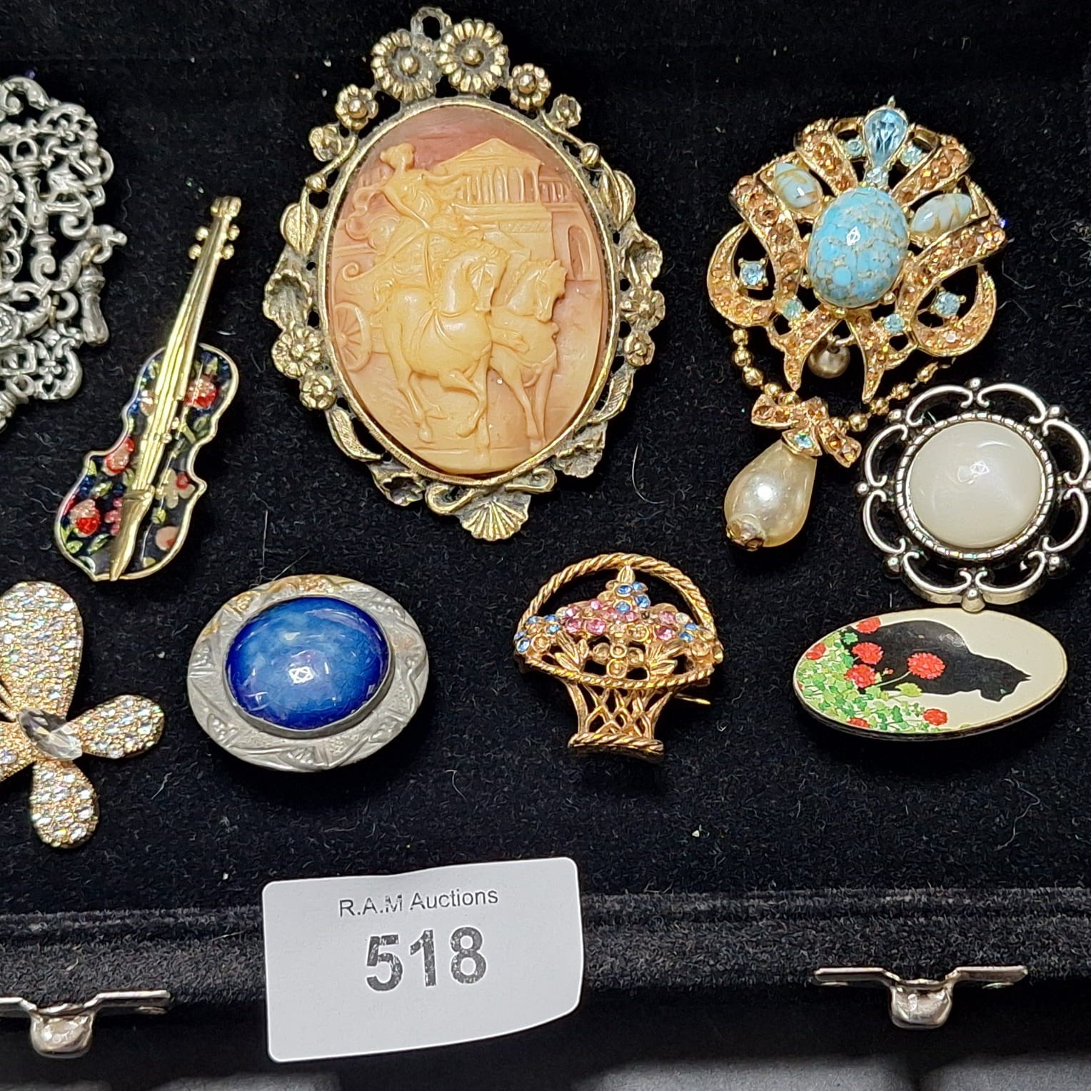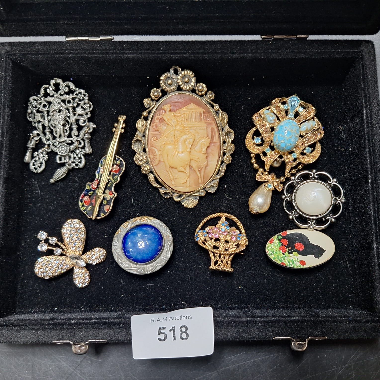 A collection of brooches and pendants including ornate silver-toned, violin, cameo, turquoise, pearl, cabochon, basket, butterfly, and floral designs.