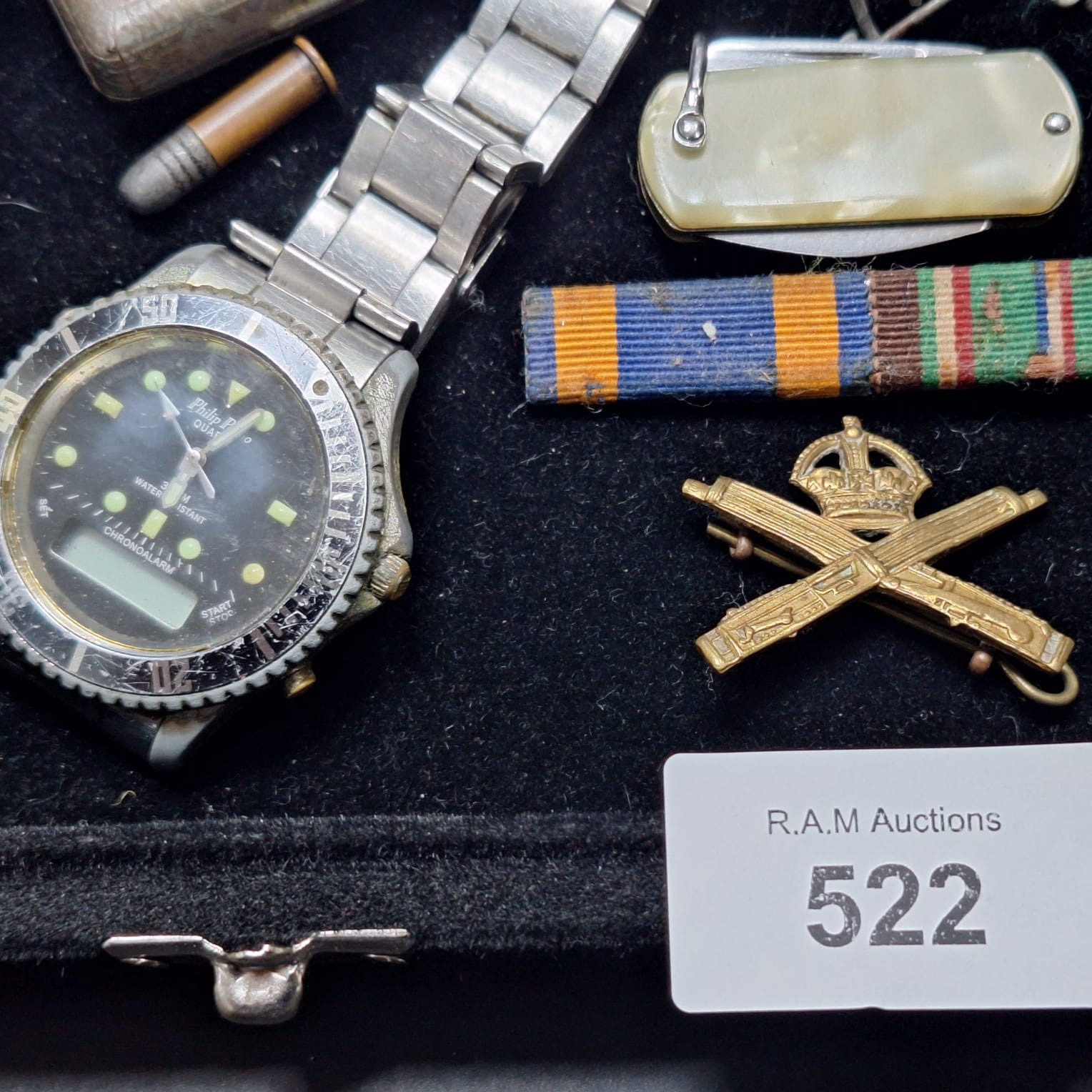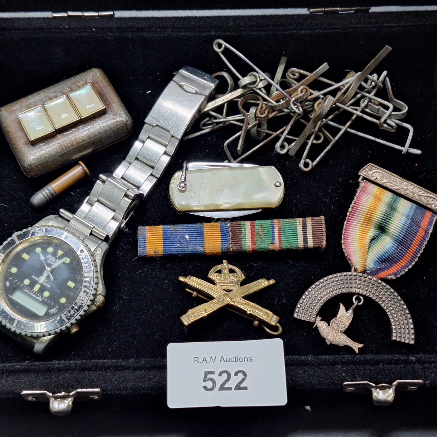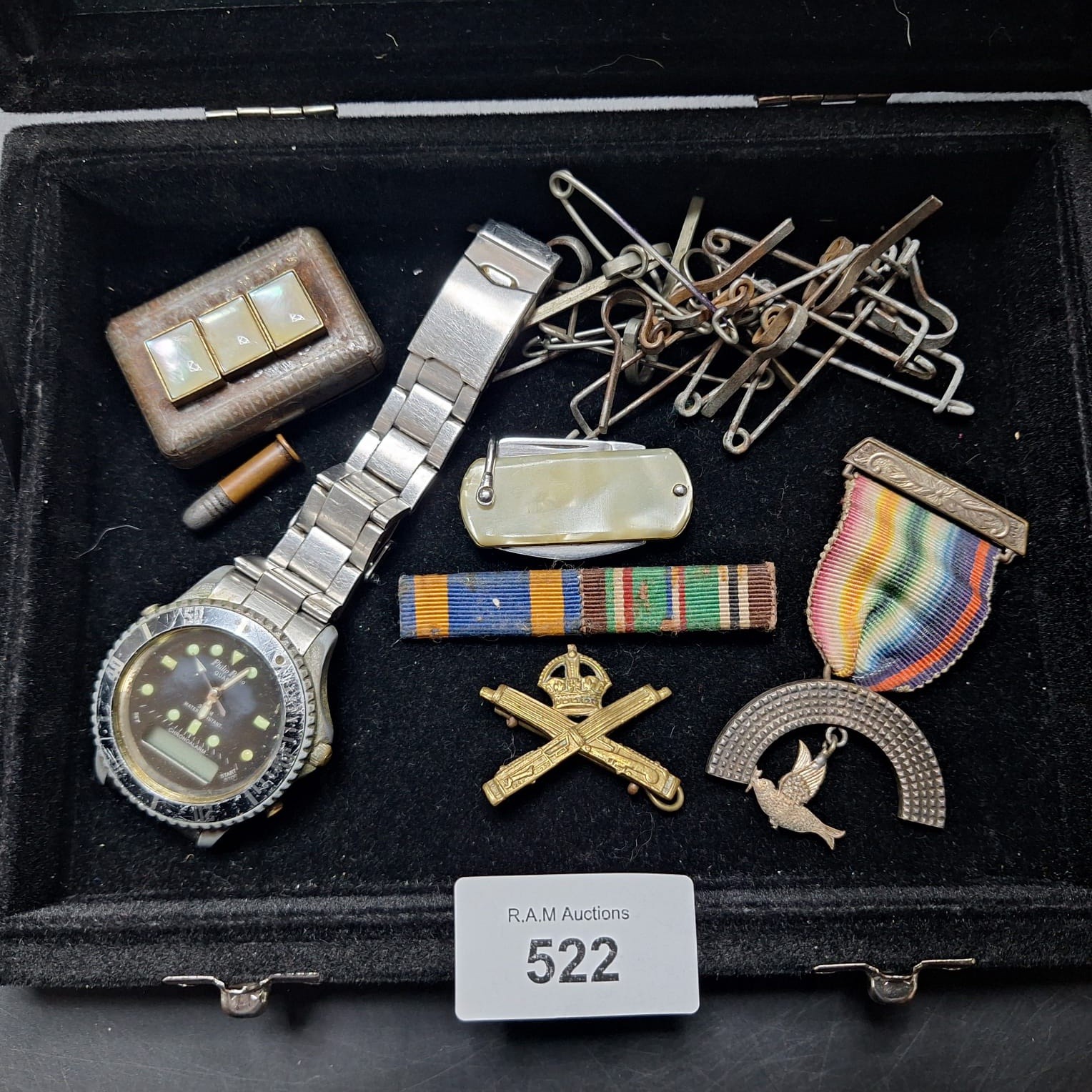 A Philip Stein wristwatch, metal box with inlay, brass bullet, pocketknife, safety pins, military medal, ribbon bar, badge, and pendant.