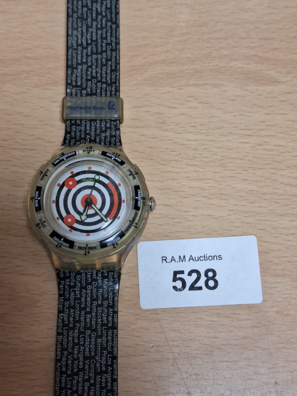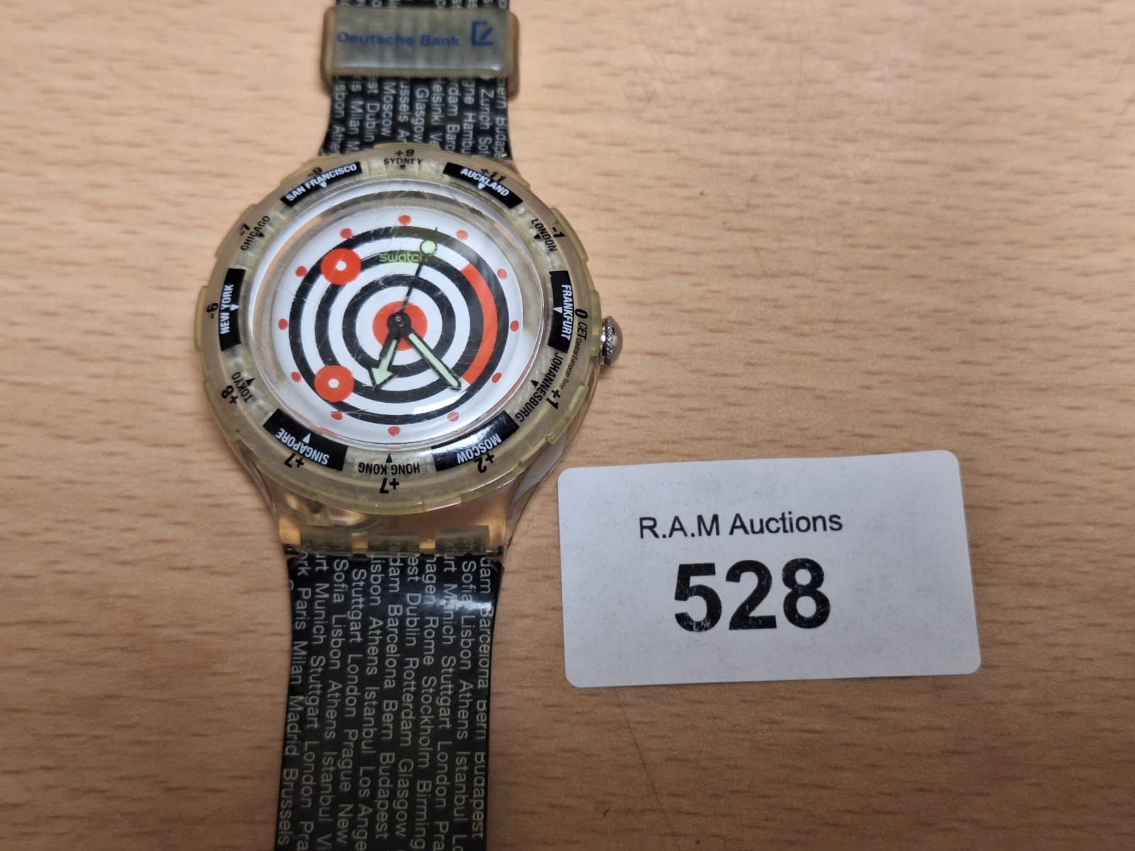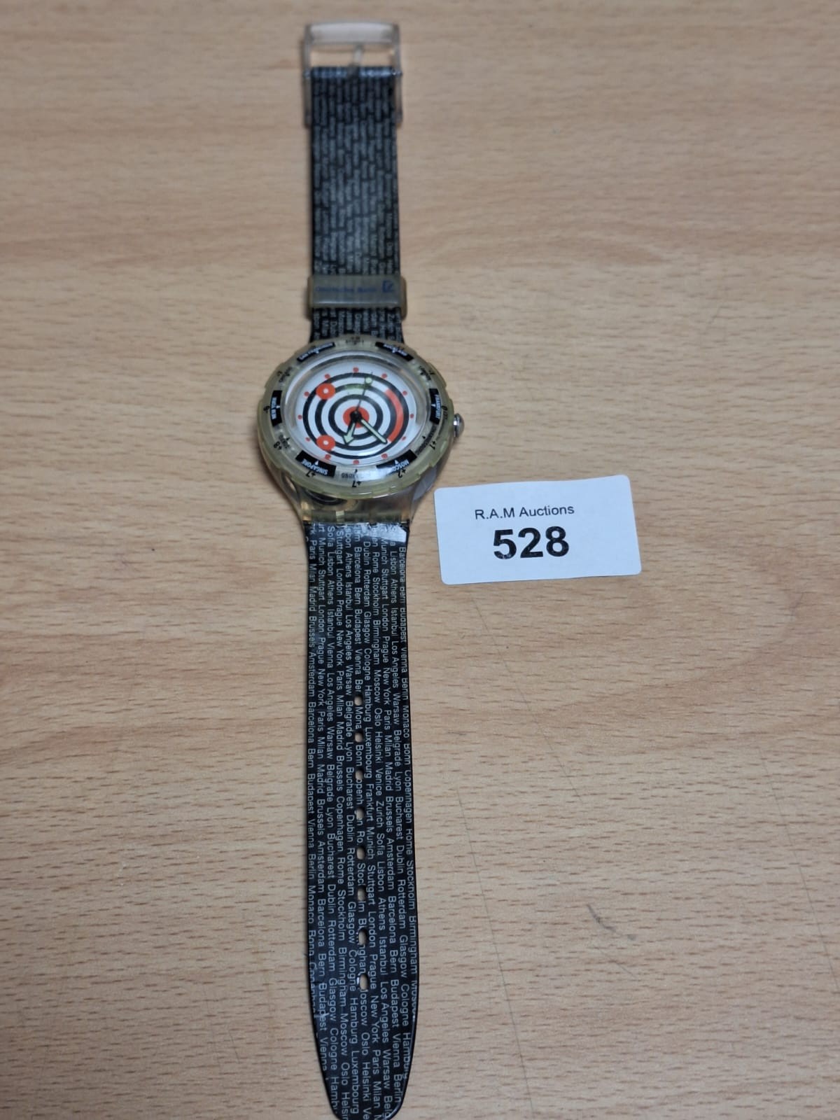 Translucent Swatch wristwatch with a concentric circle design and city names on the face.