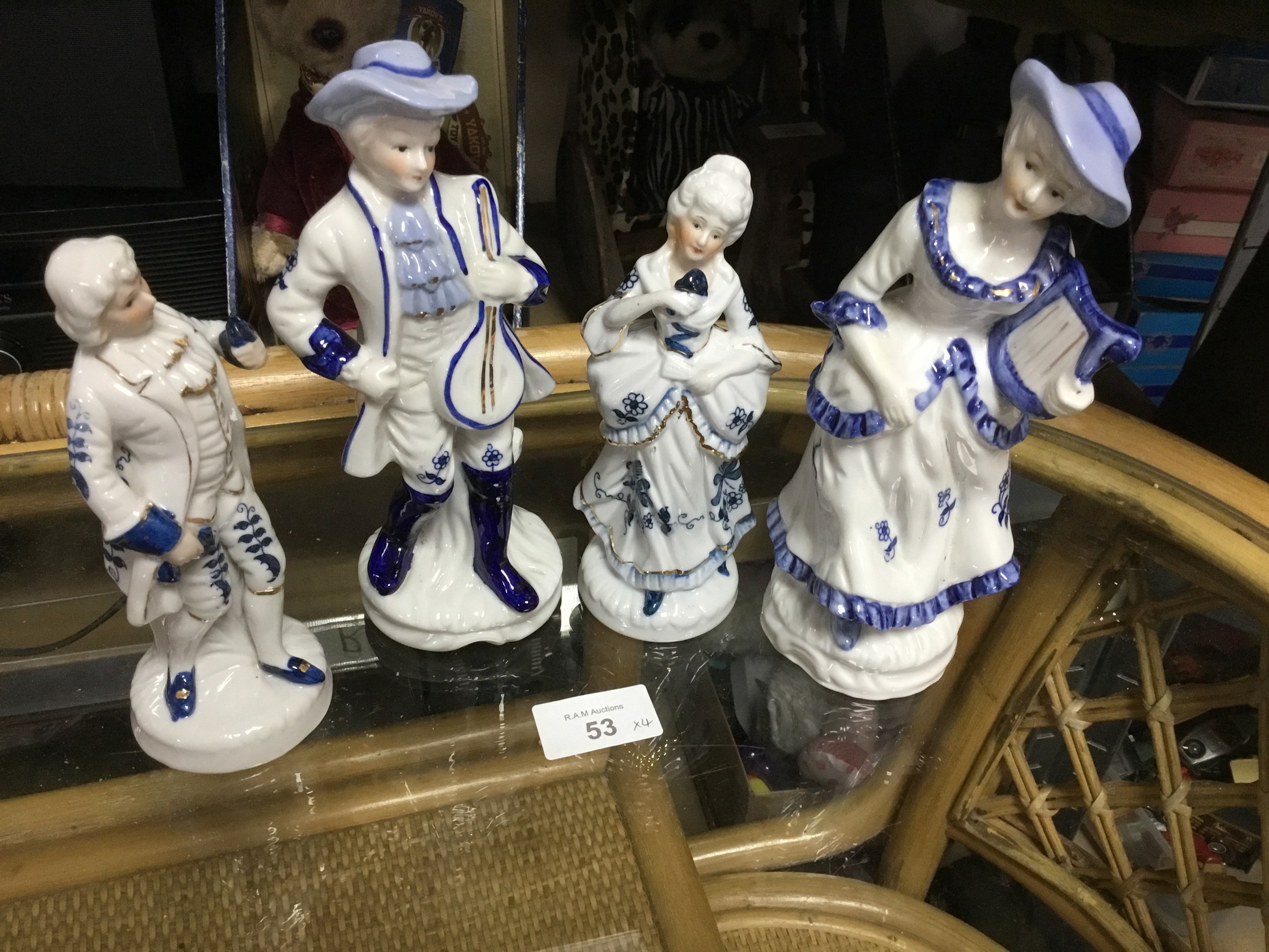 Porcelain figurines in 18th-century style clothing with blue trim and floral patterns.