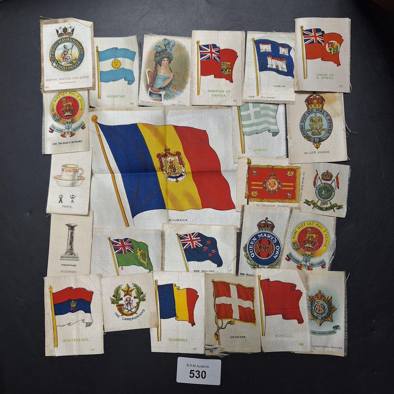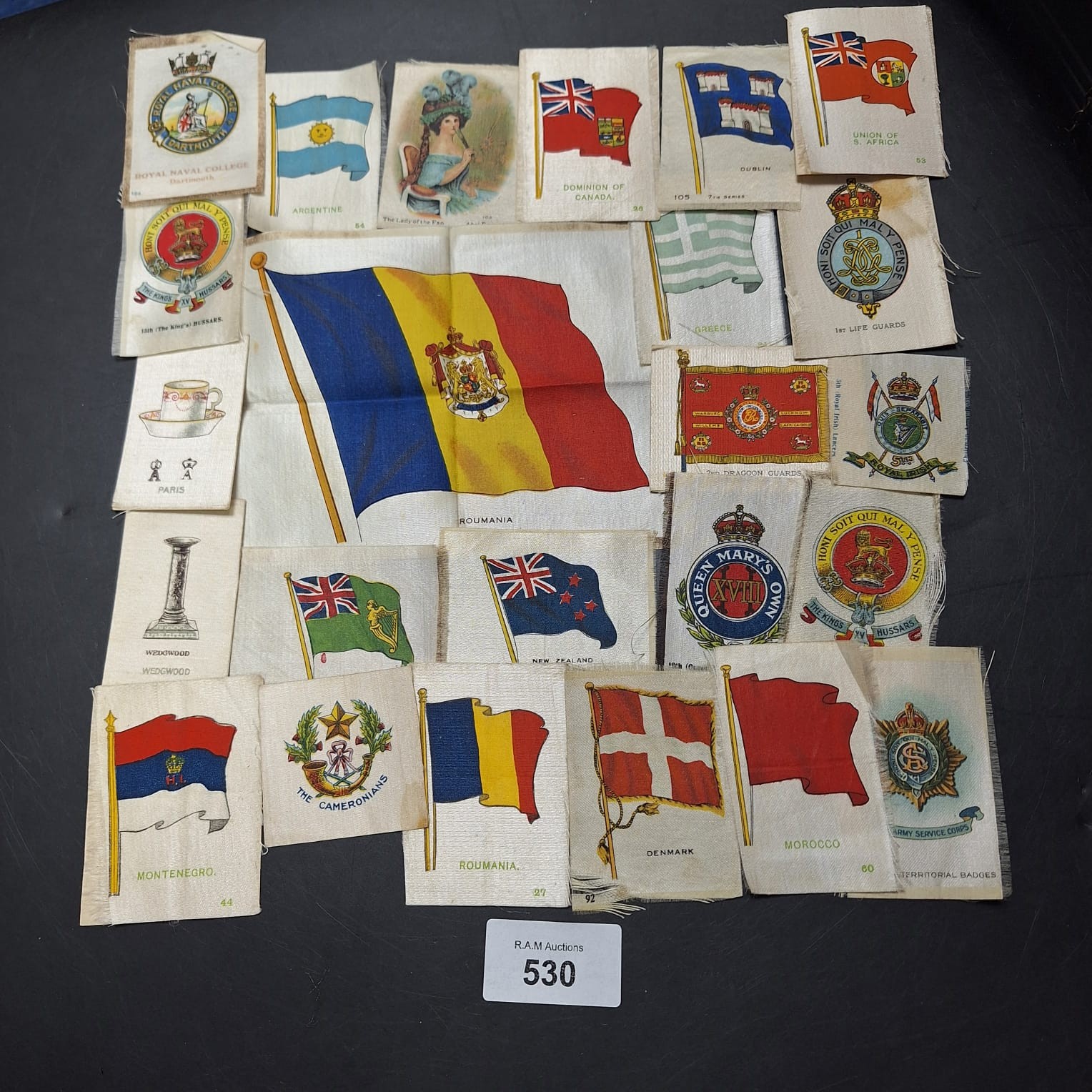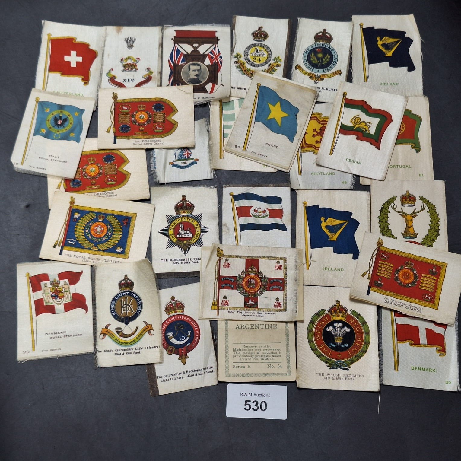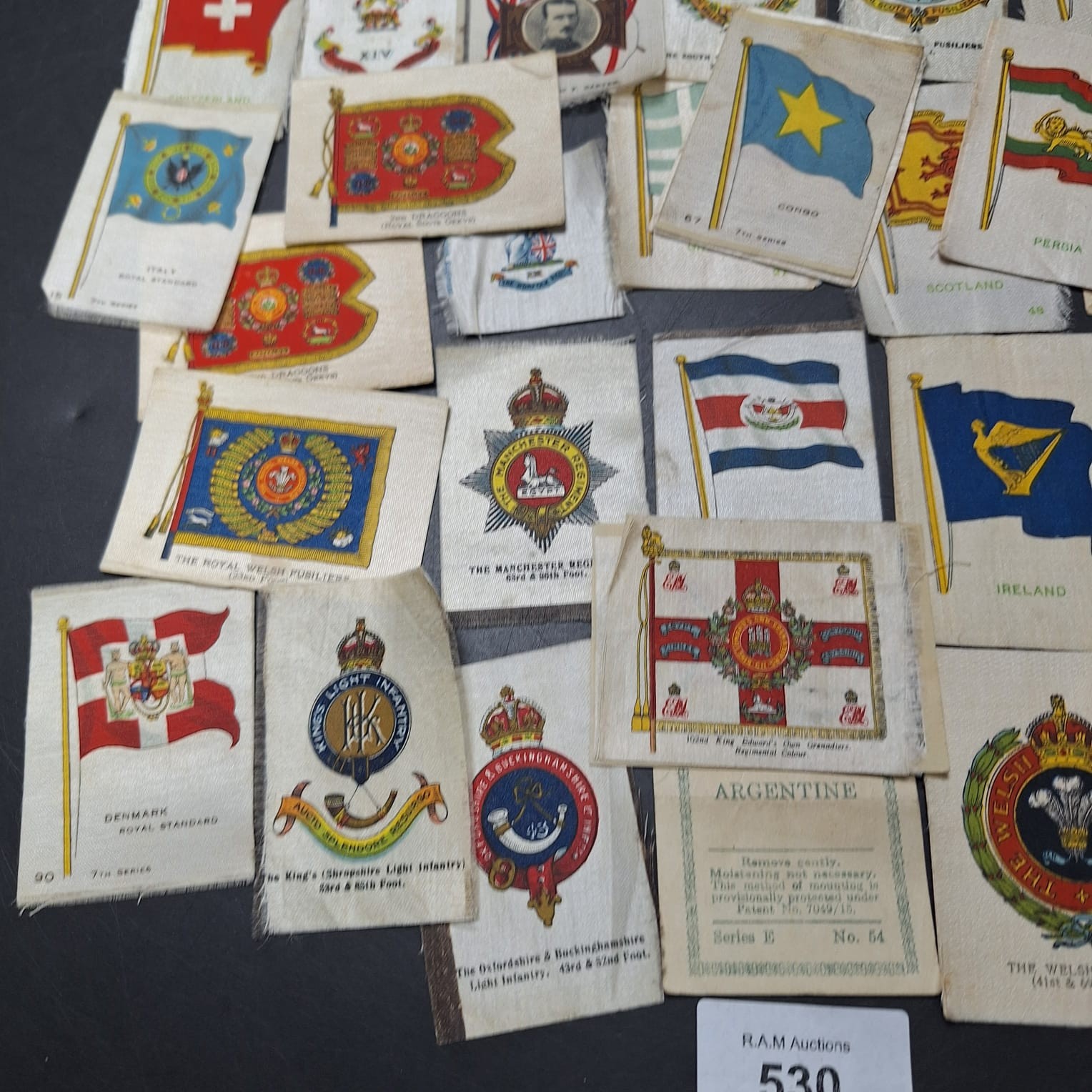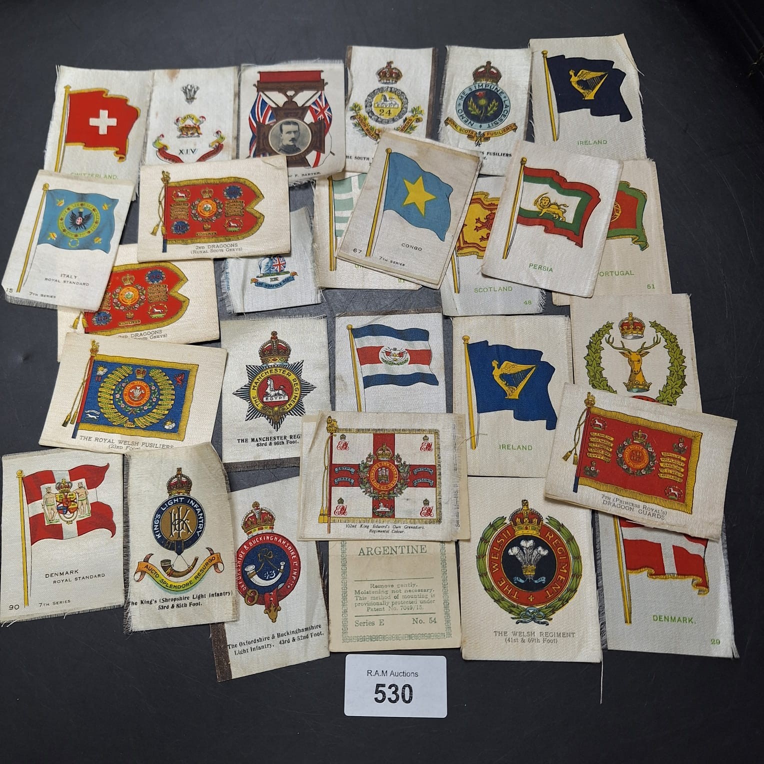 Collection of silk cigarette cards featuring national flags and regimental insignia.