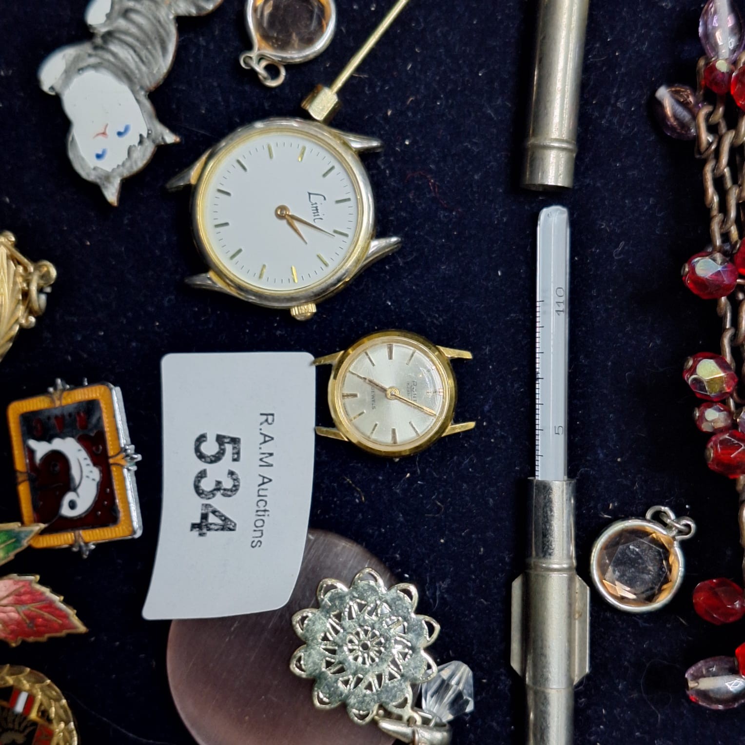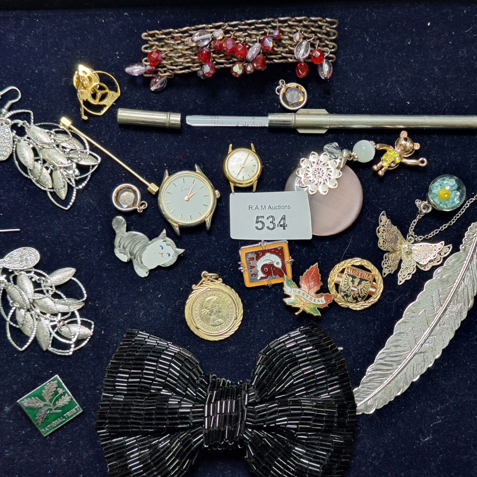 Assorted jewelry including earrings, brooches, a bookmark, bracelet, pendants, and two wristwatches, one marked “Limo”, alongside a “NATIONAL TRUST” badge.