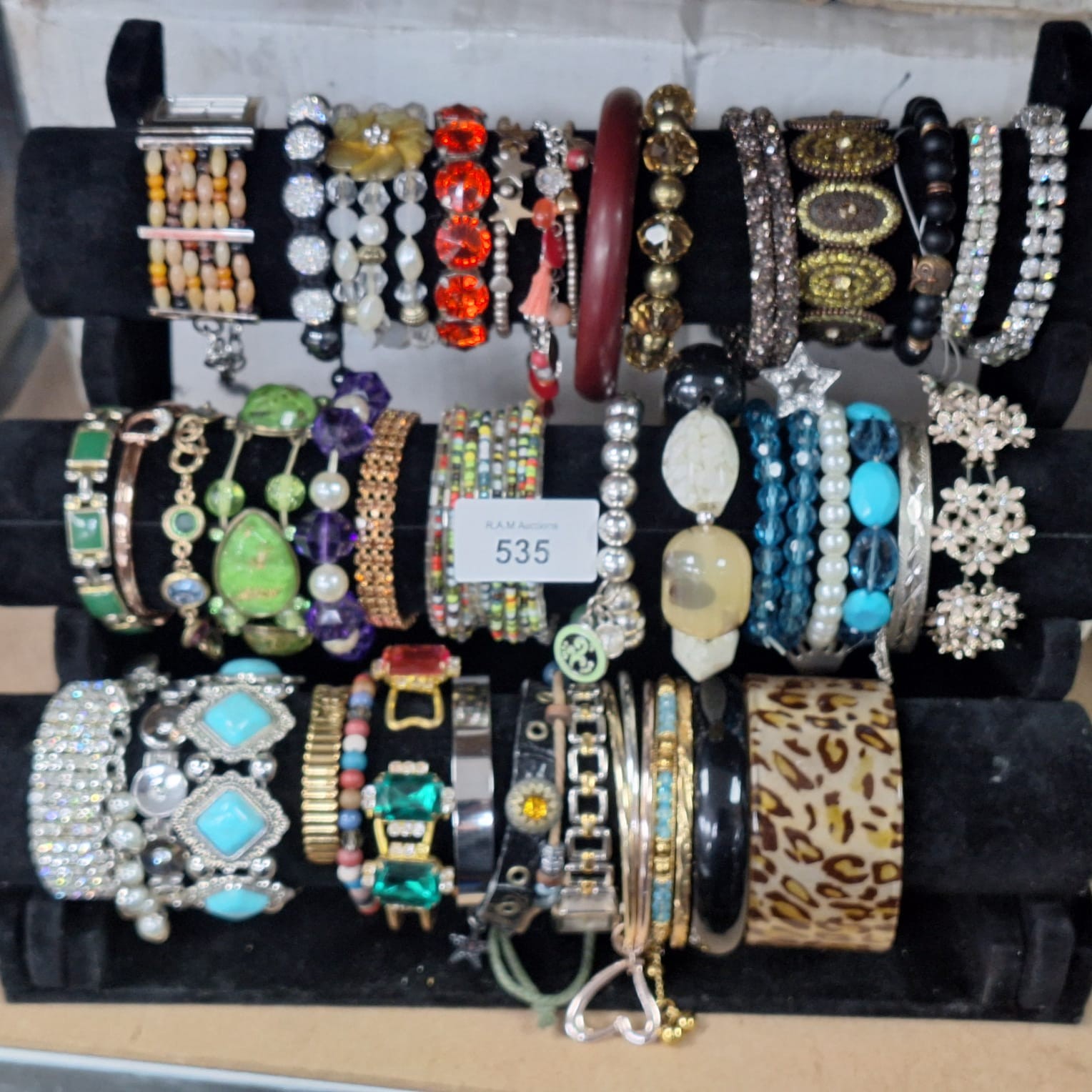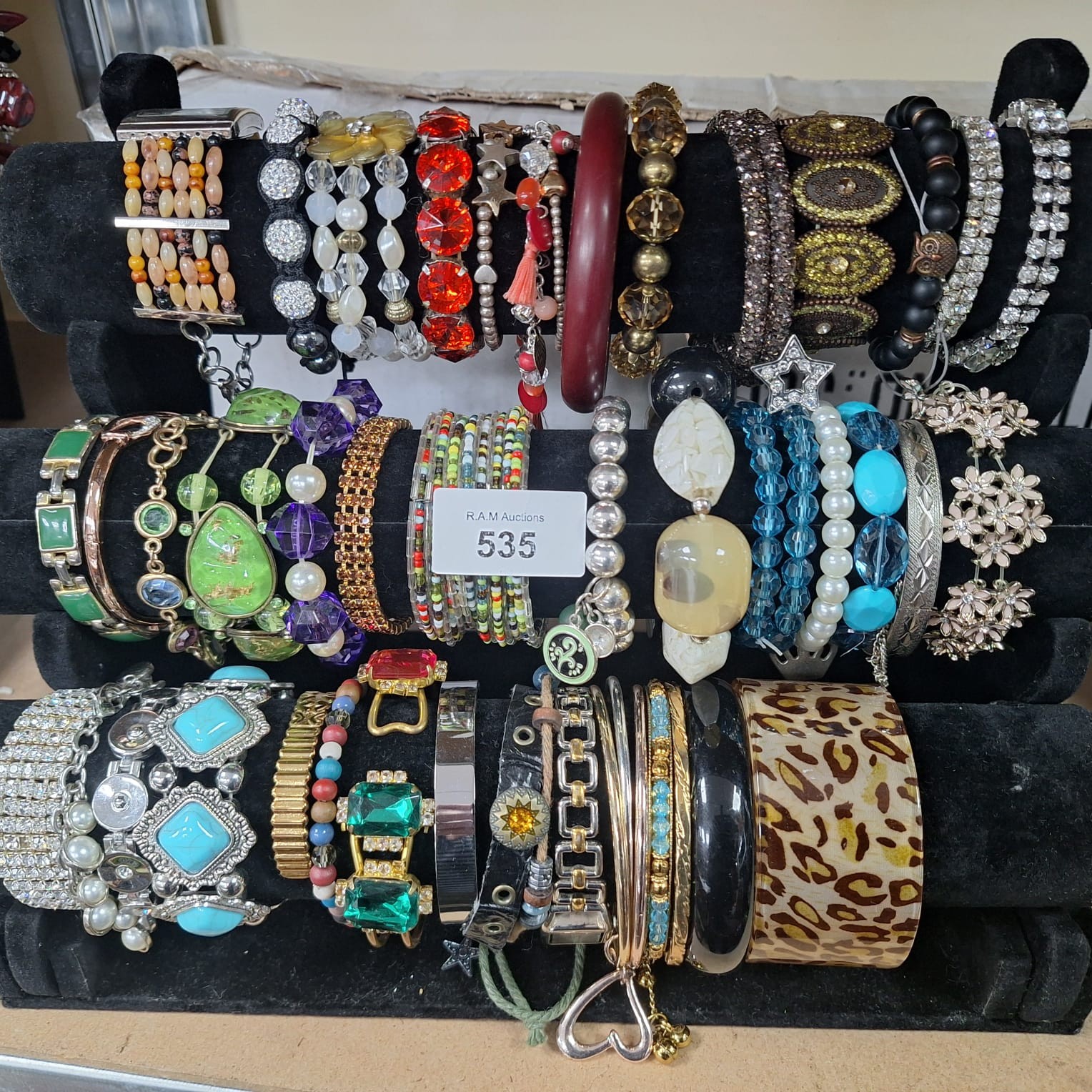 A varied collection of bracelets crafted from metal, beads, and plastic, featuring diverse styles and colors.