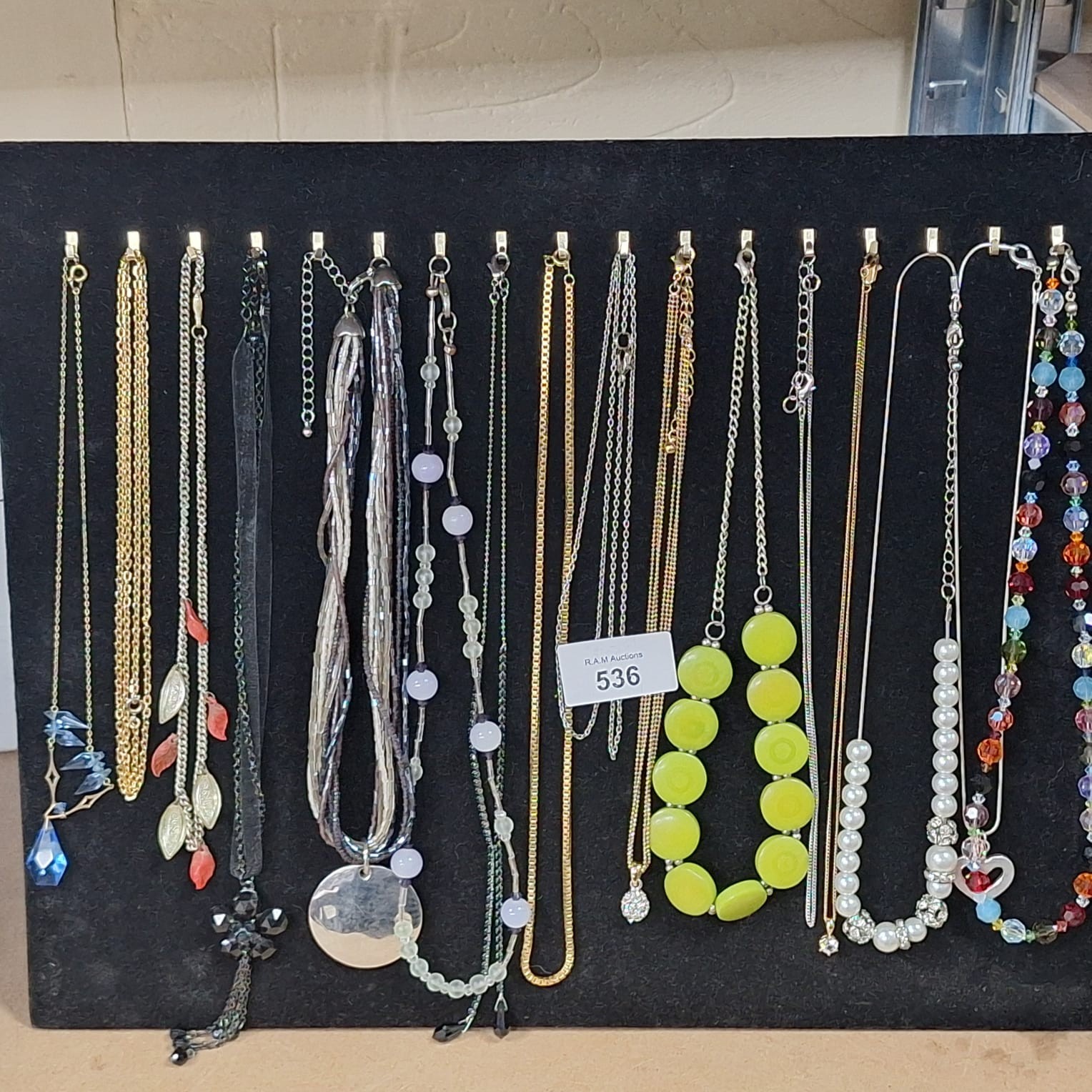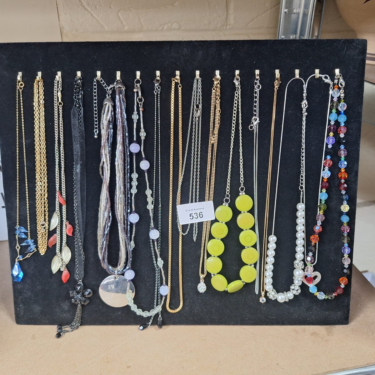 A collection of necklaces featuring metal chains, beads, and cords with various pendants.