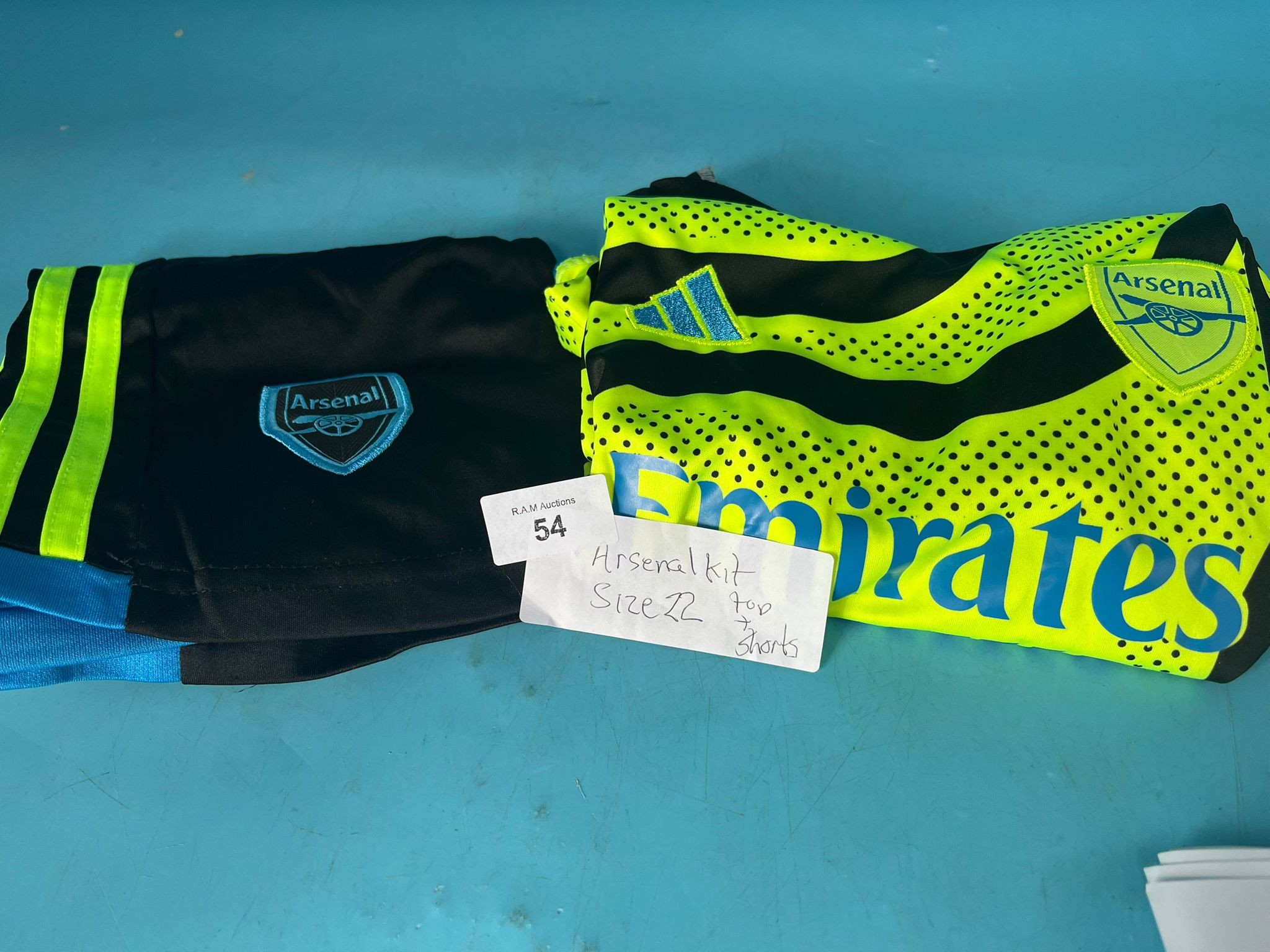 Neon yellow and black Arsenal football kit with crest and sponsor.