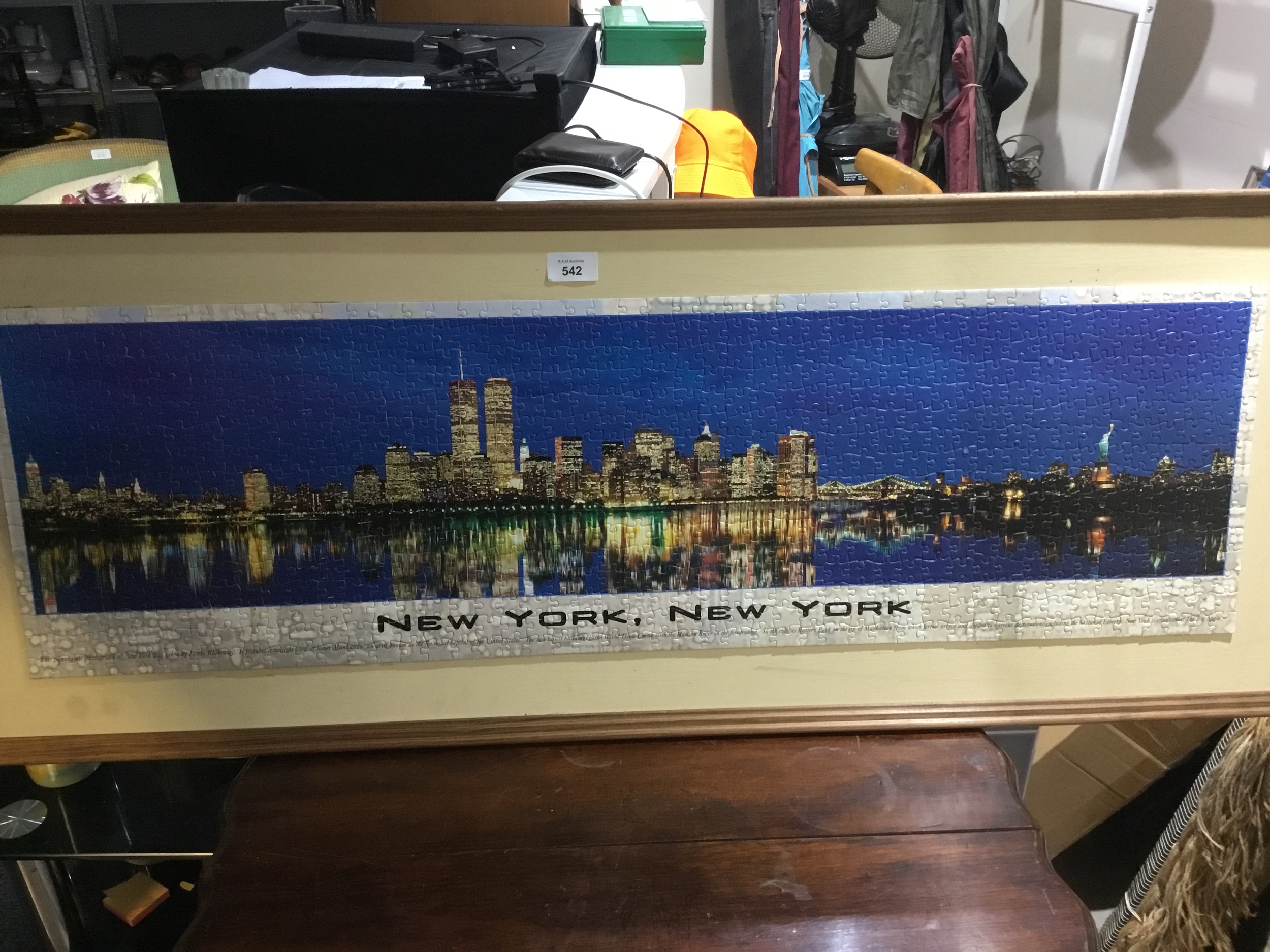 Framed jigsaw puzzle of a nighttime New York City cityscape with the Twin Towers.