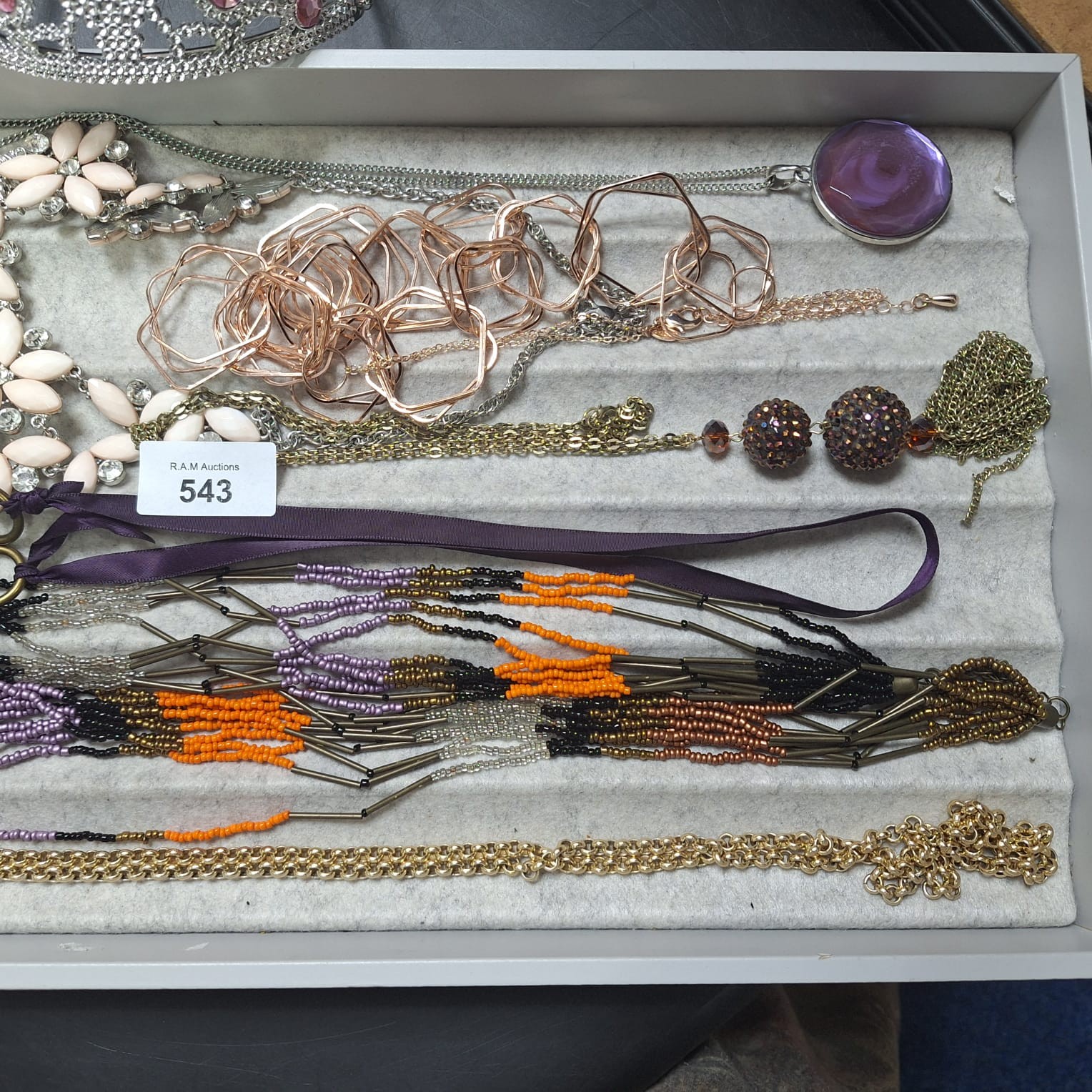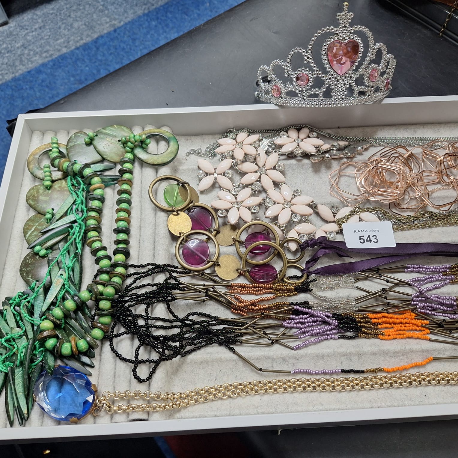 A collection of costume jewelry including a tiara, various necklaces with rhinestones, geometric metal pieces, beads, cabochons, and a large blue stone pendant.