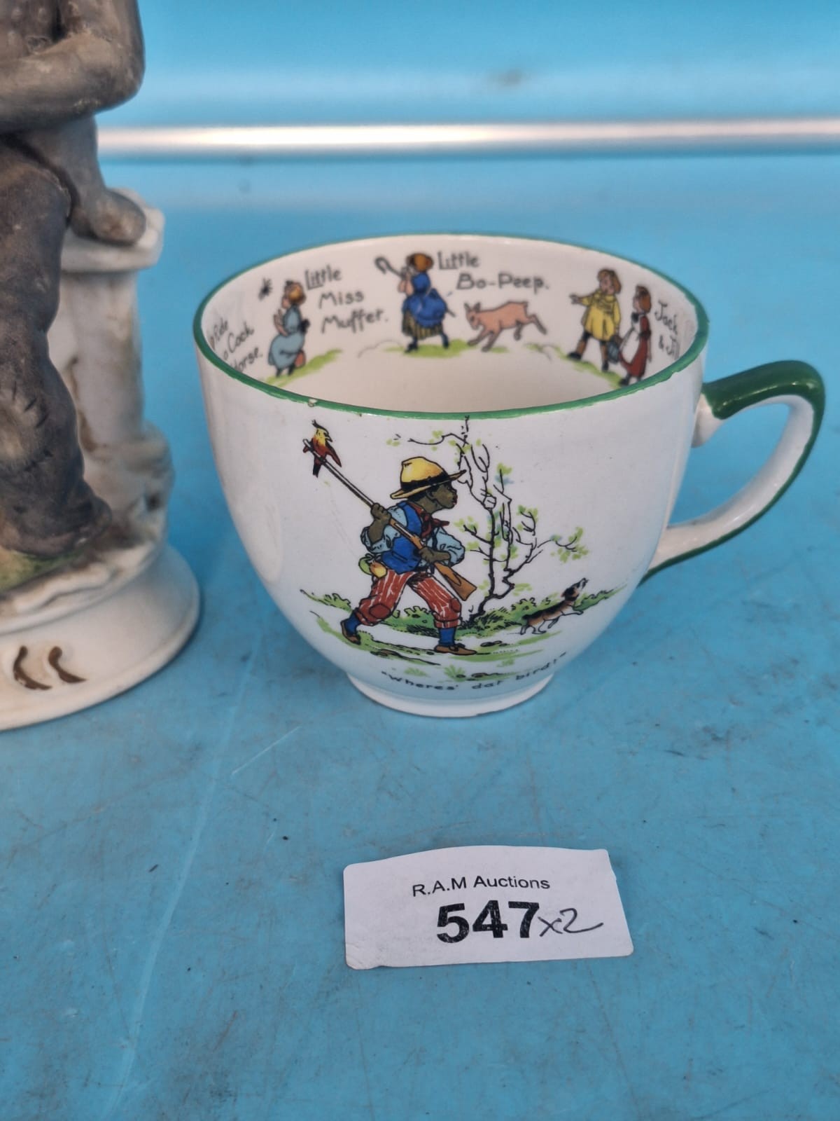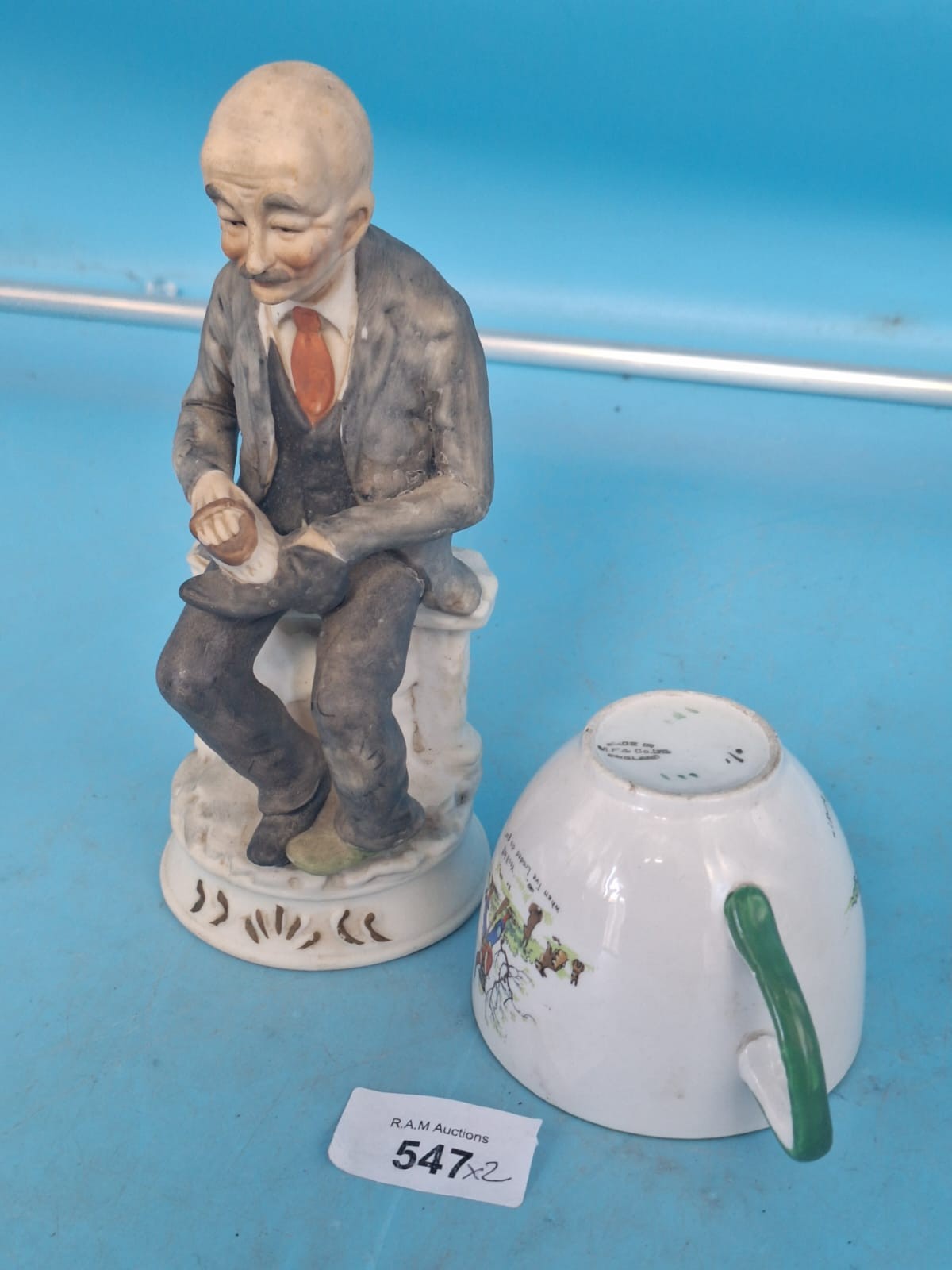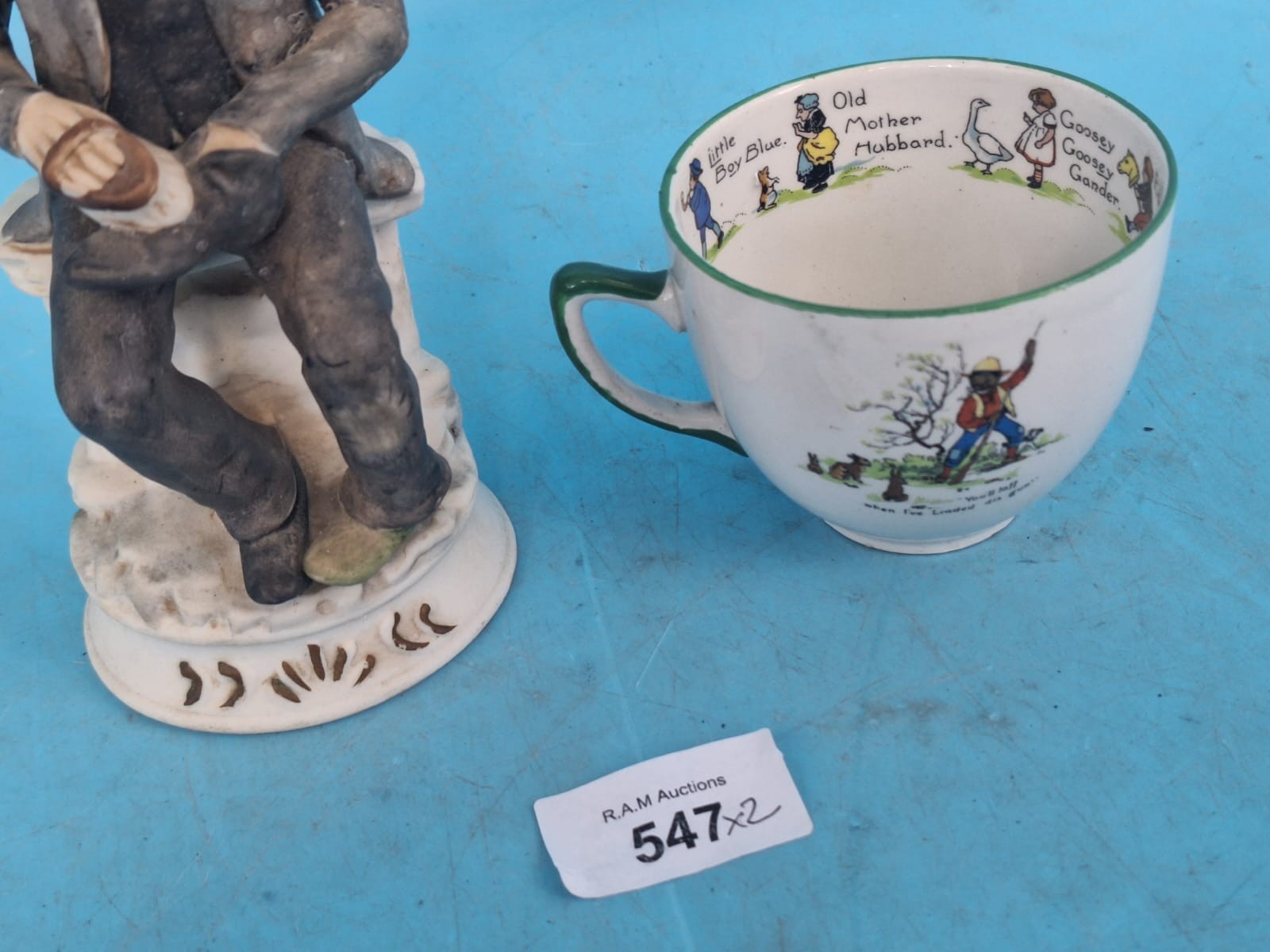 Ceramic cup with nursery rhyme illustrations and a seated elderly man figurine.