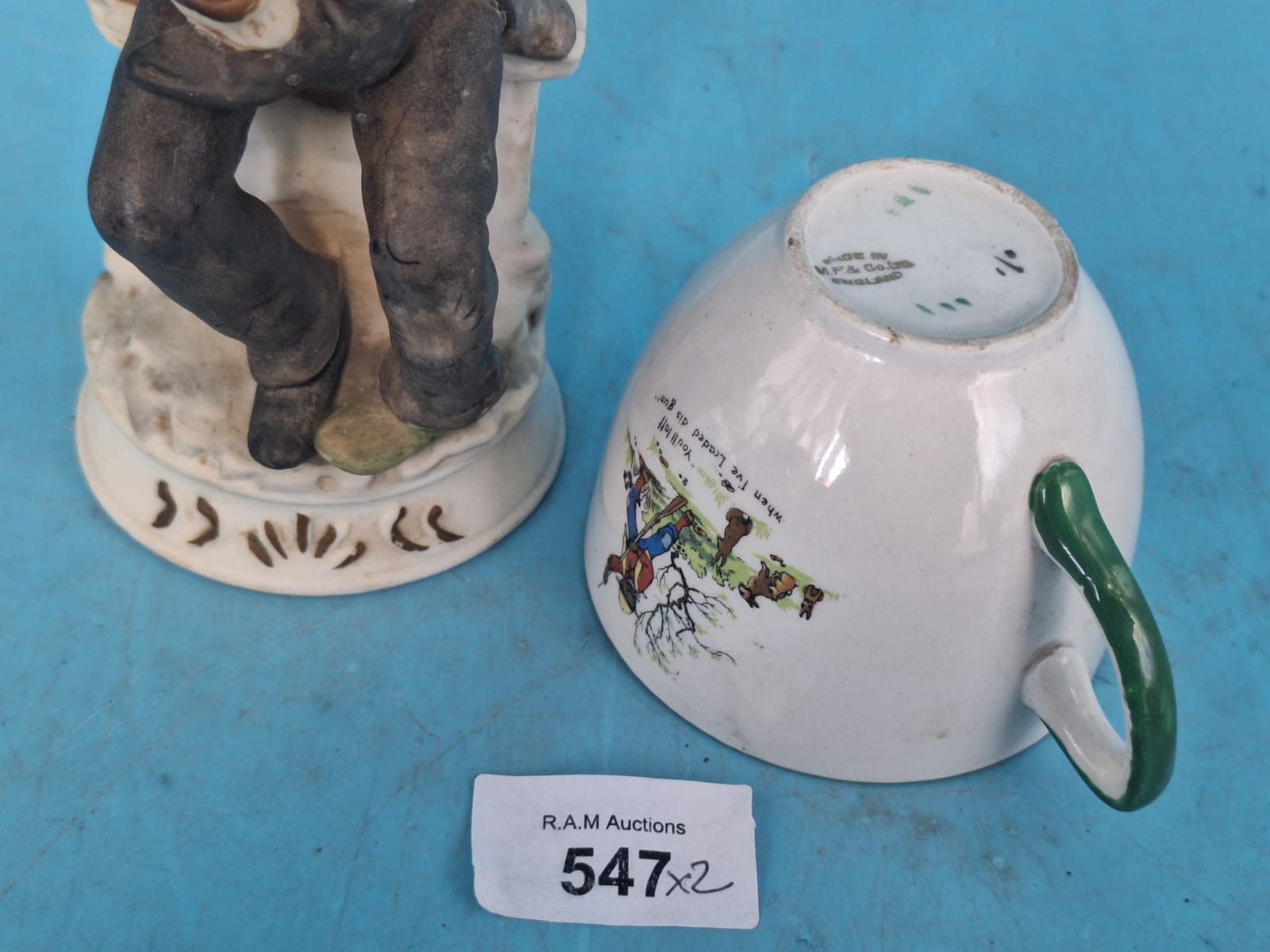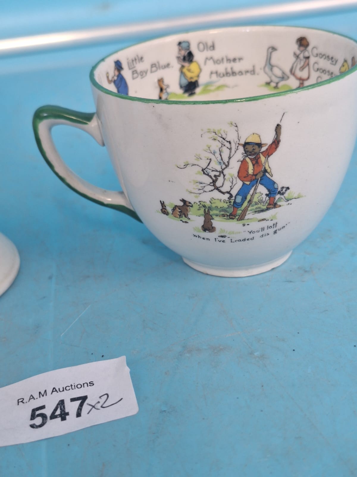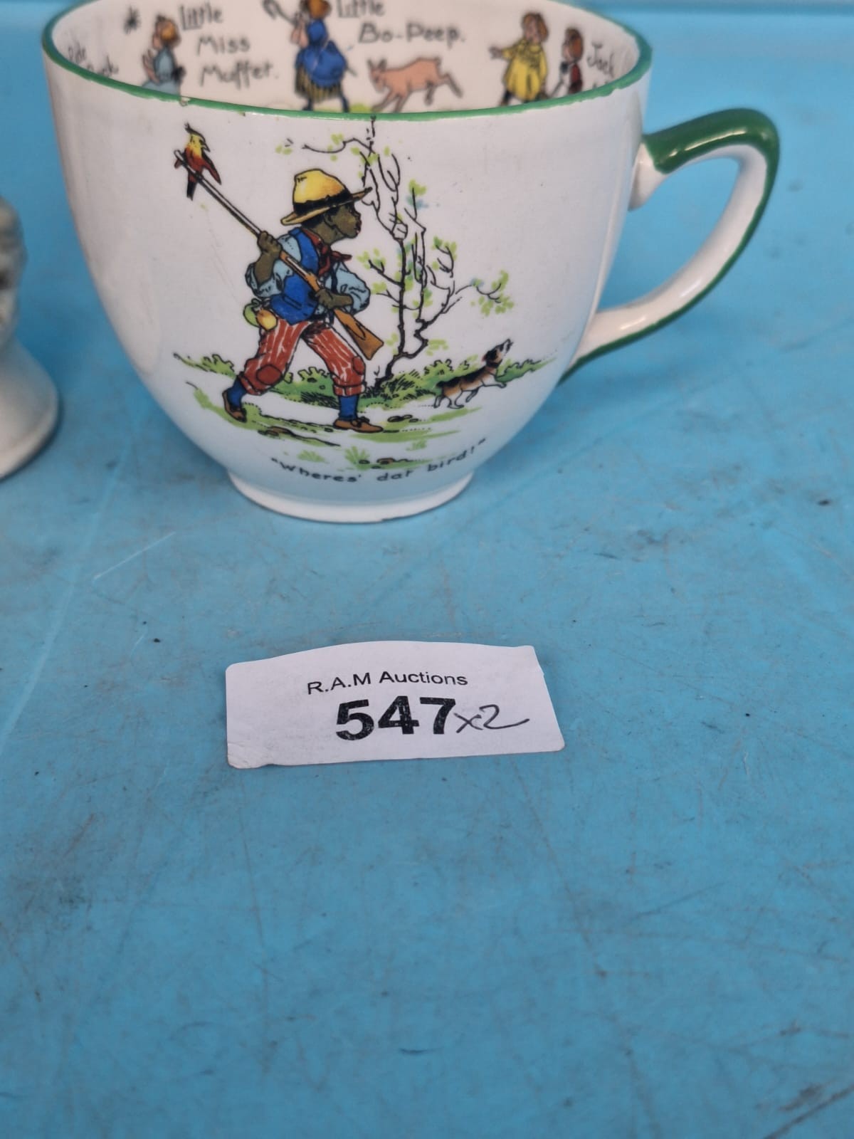Ceramic cup with nursery rhyme illustrations and a seated elderly man figurine.