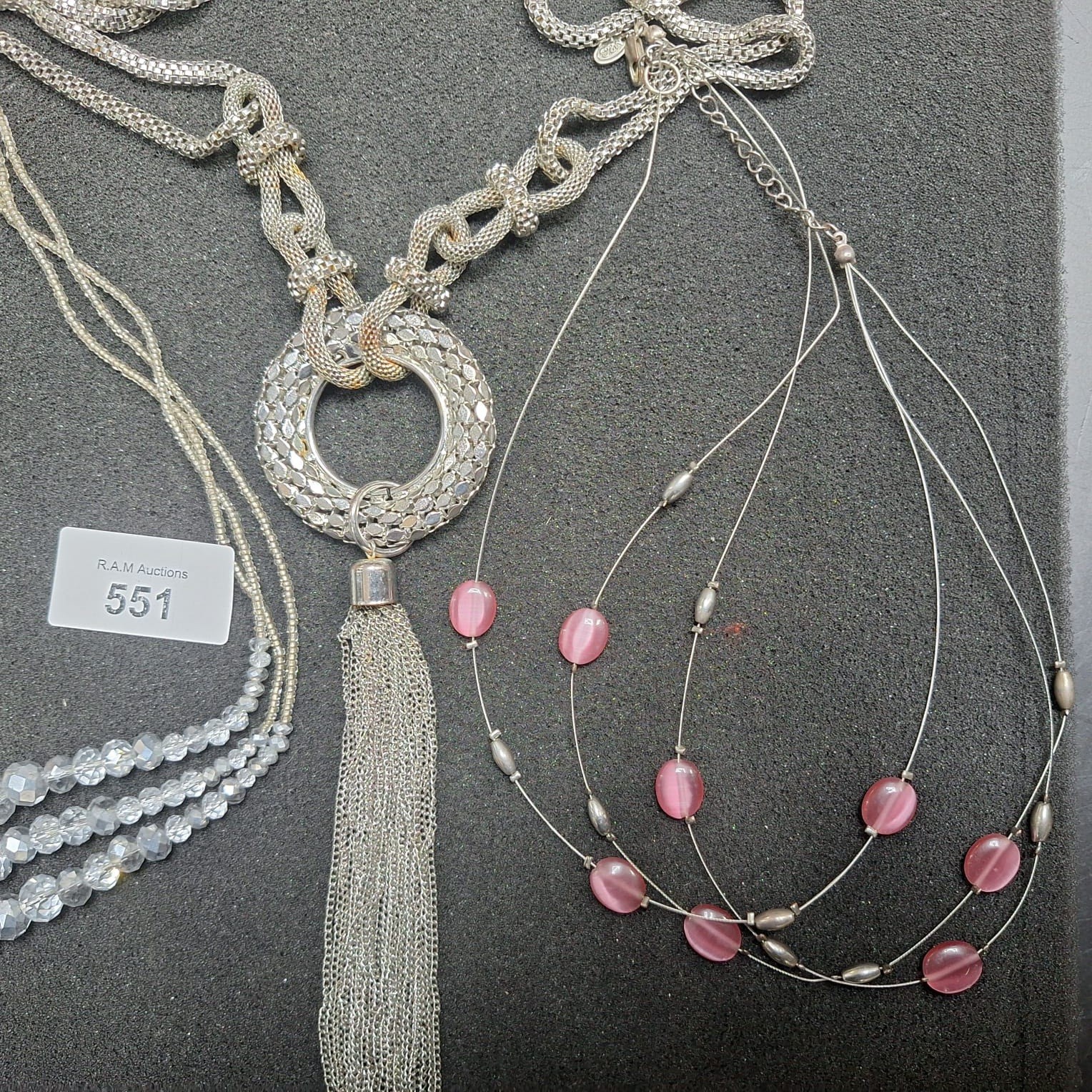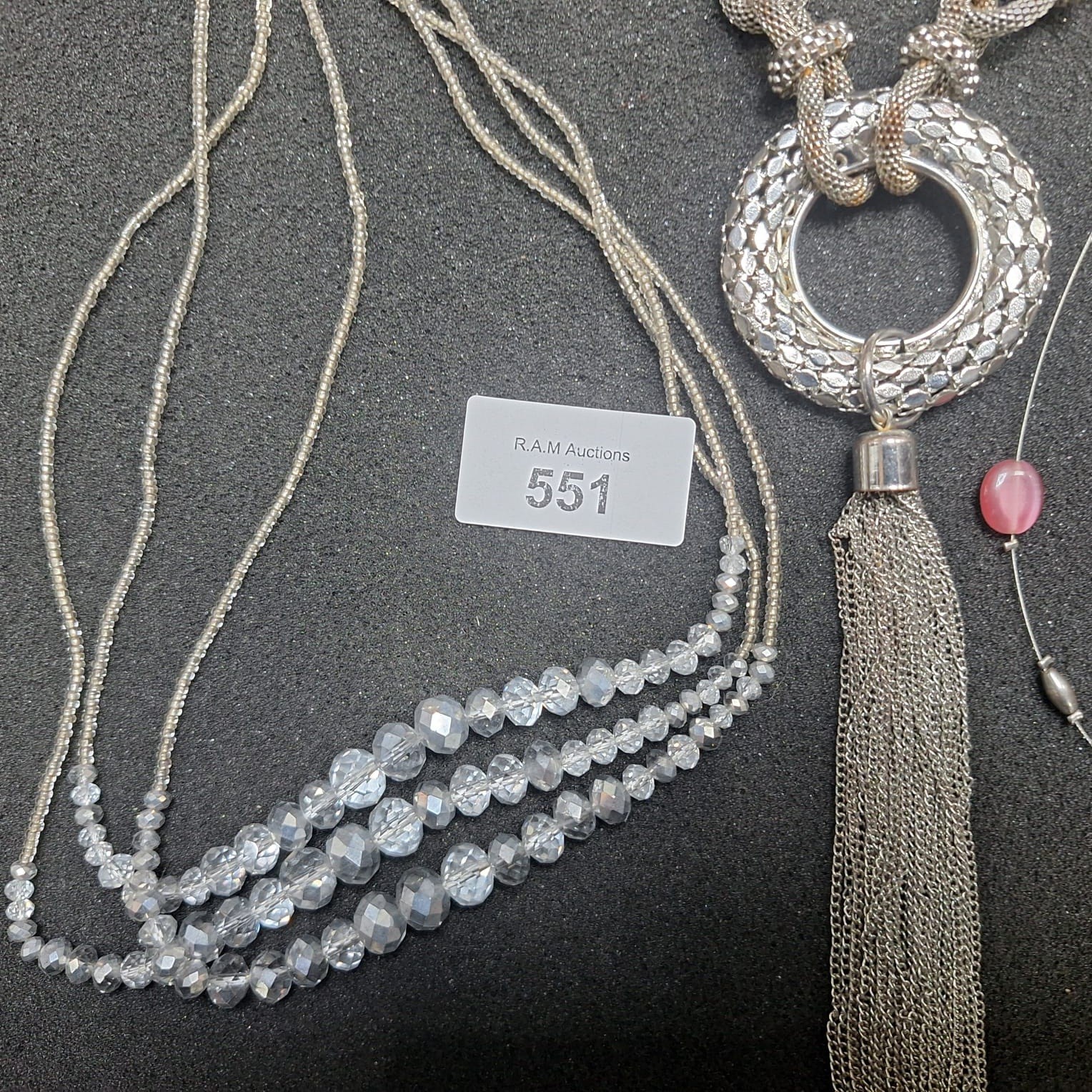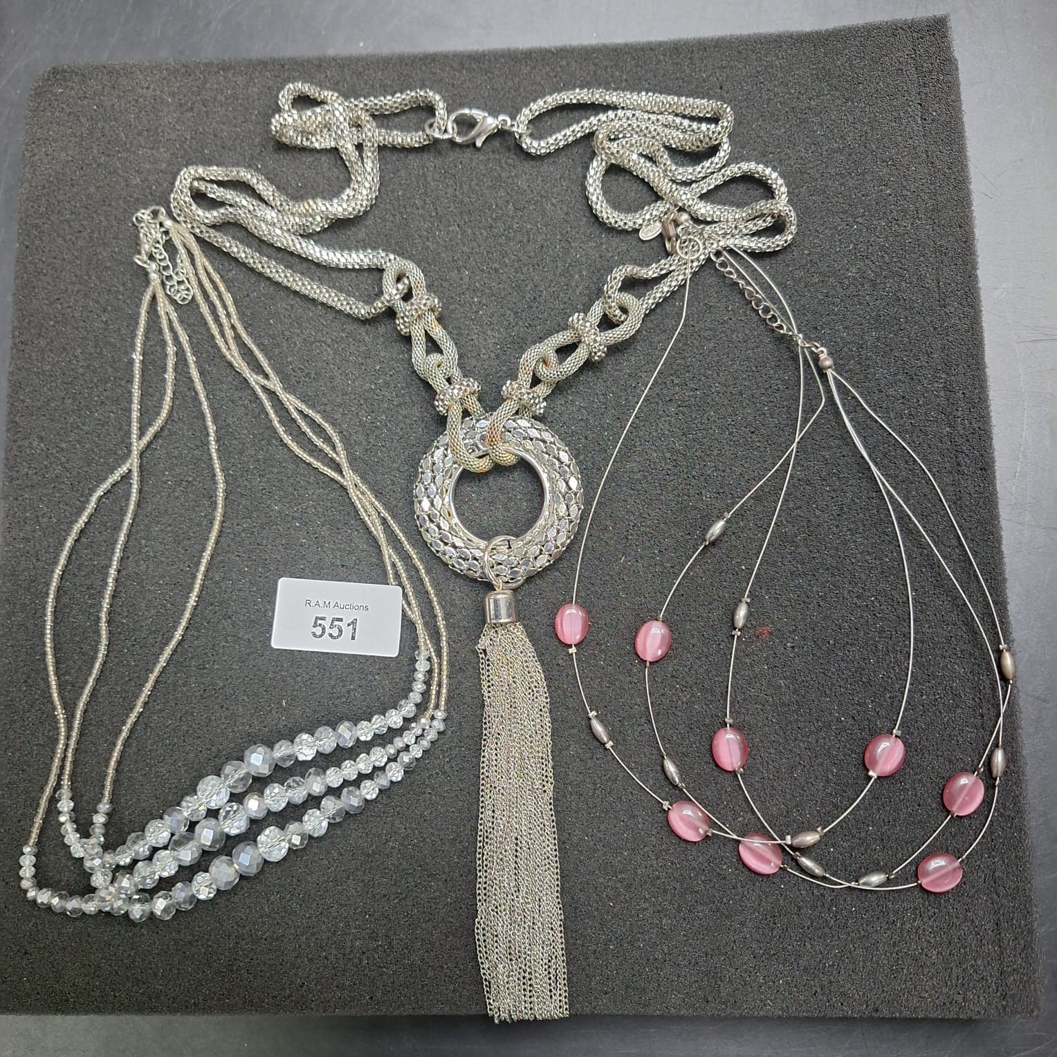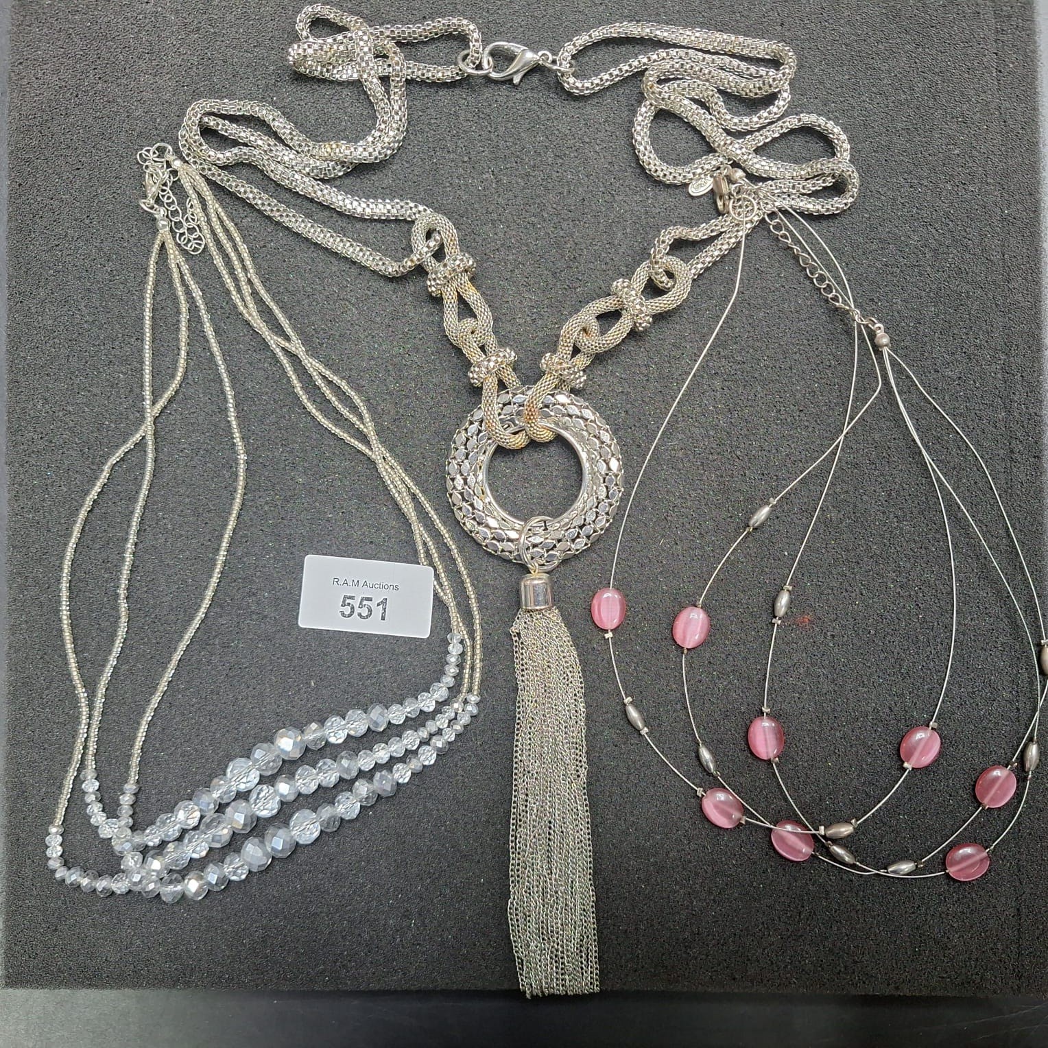 A silver-toned metal pendant necklace with a chain tassel layered with a multi-strand pink bead necklace and a three-strand faceted clear glass bead necklace.