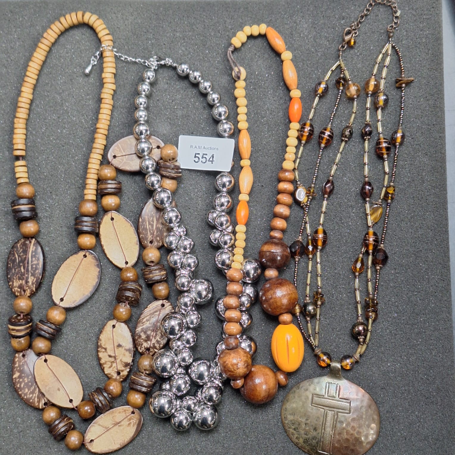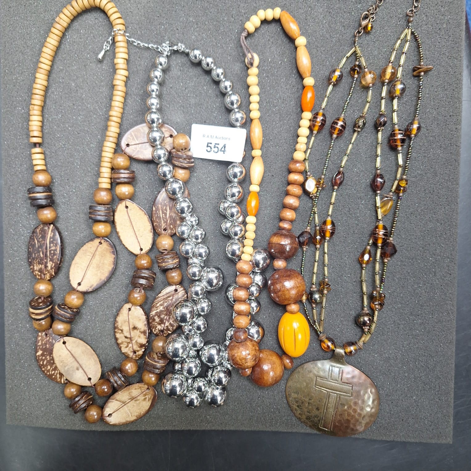 Lot of five necklaces featuring wooden, metal, and mixed-media beads.