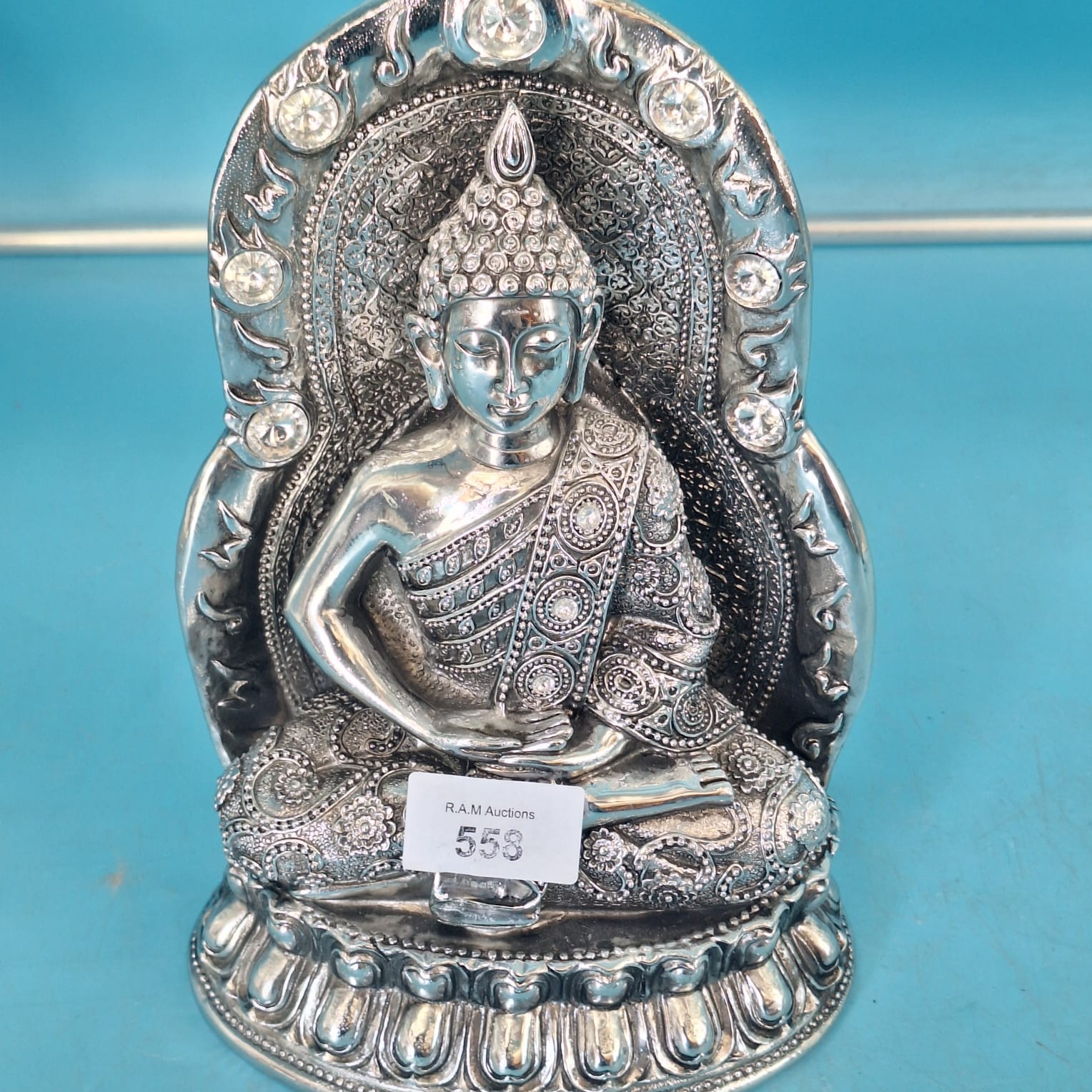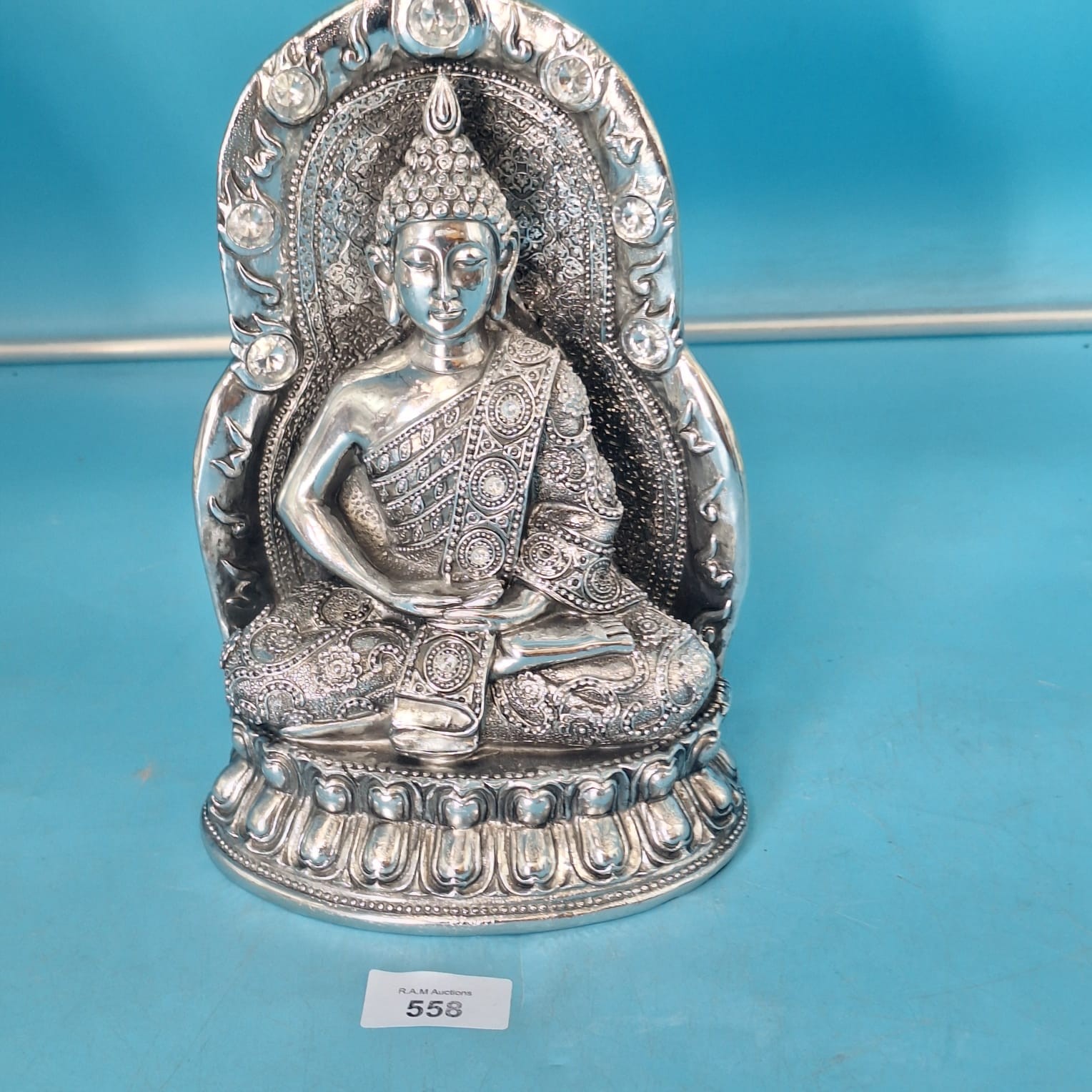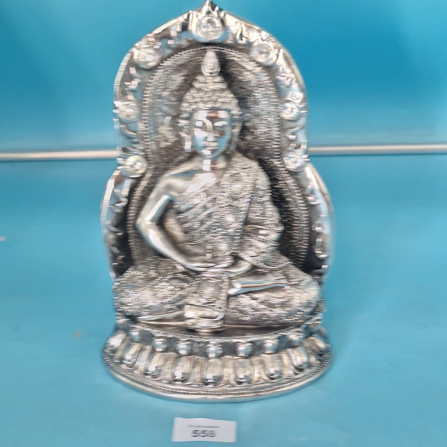 Silver-colored metal statue of a seated Buddha with an ornate, embellished back piece and tiered lotus base.