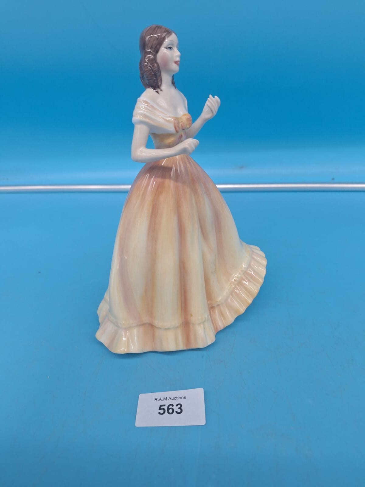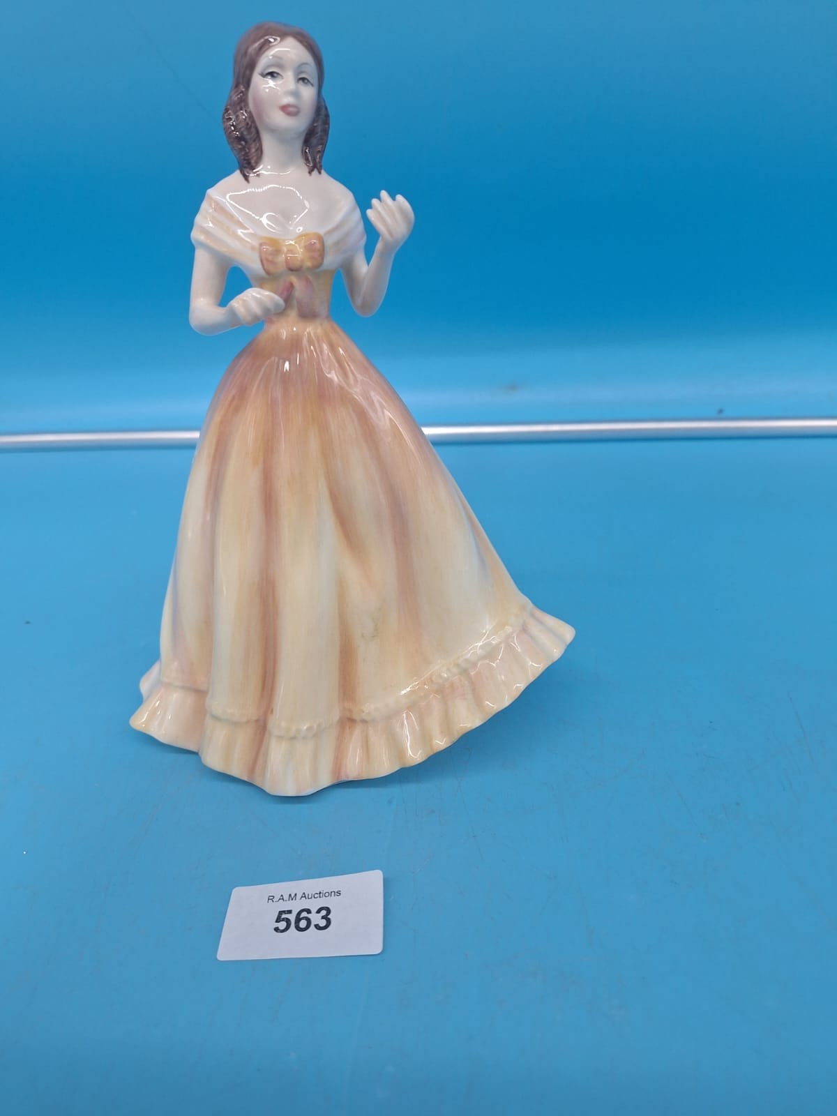 Porcelain figurine of a woman in a floor-length gown with a bow detail.