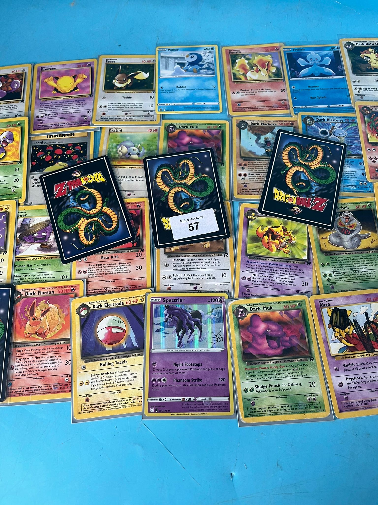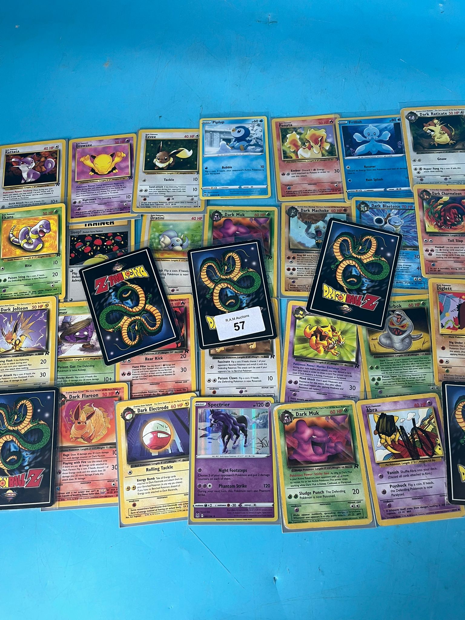 A collection of Pokémon trading cards featuring various characters on a blue surface.