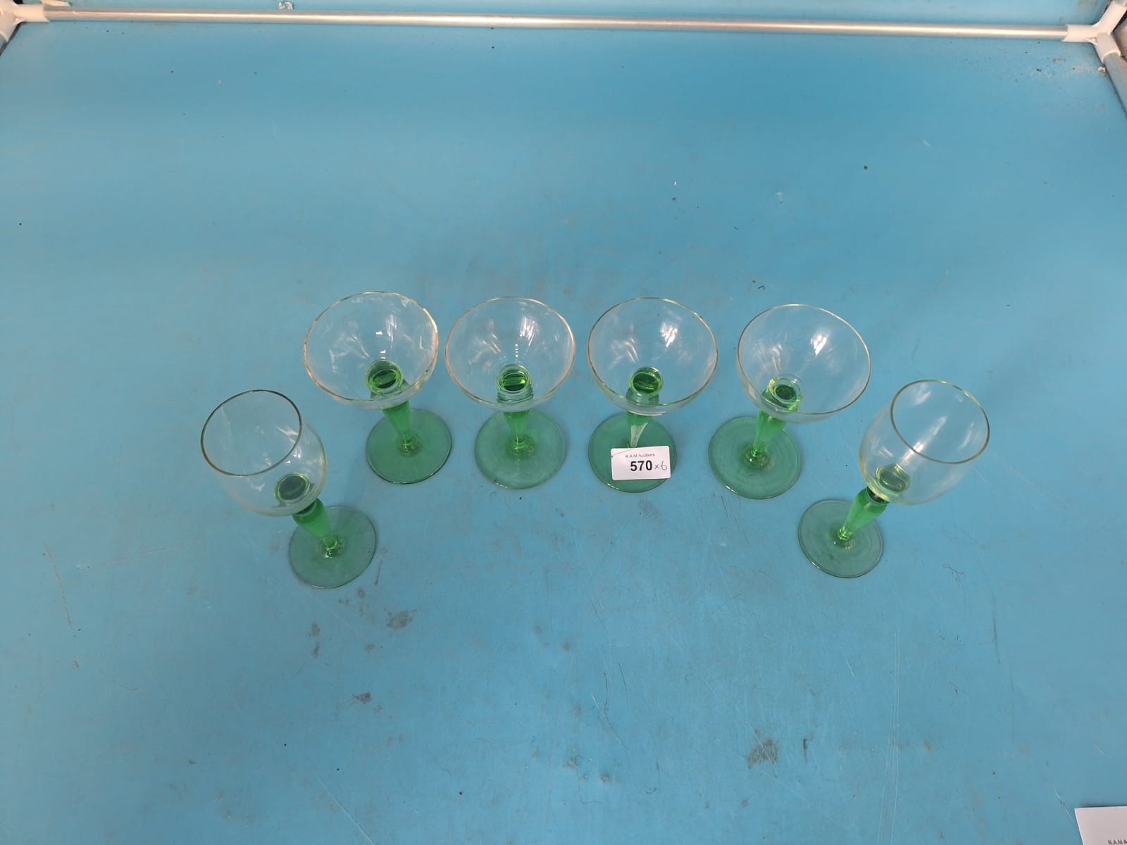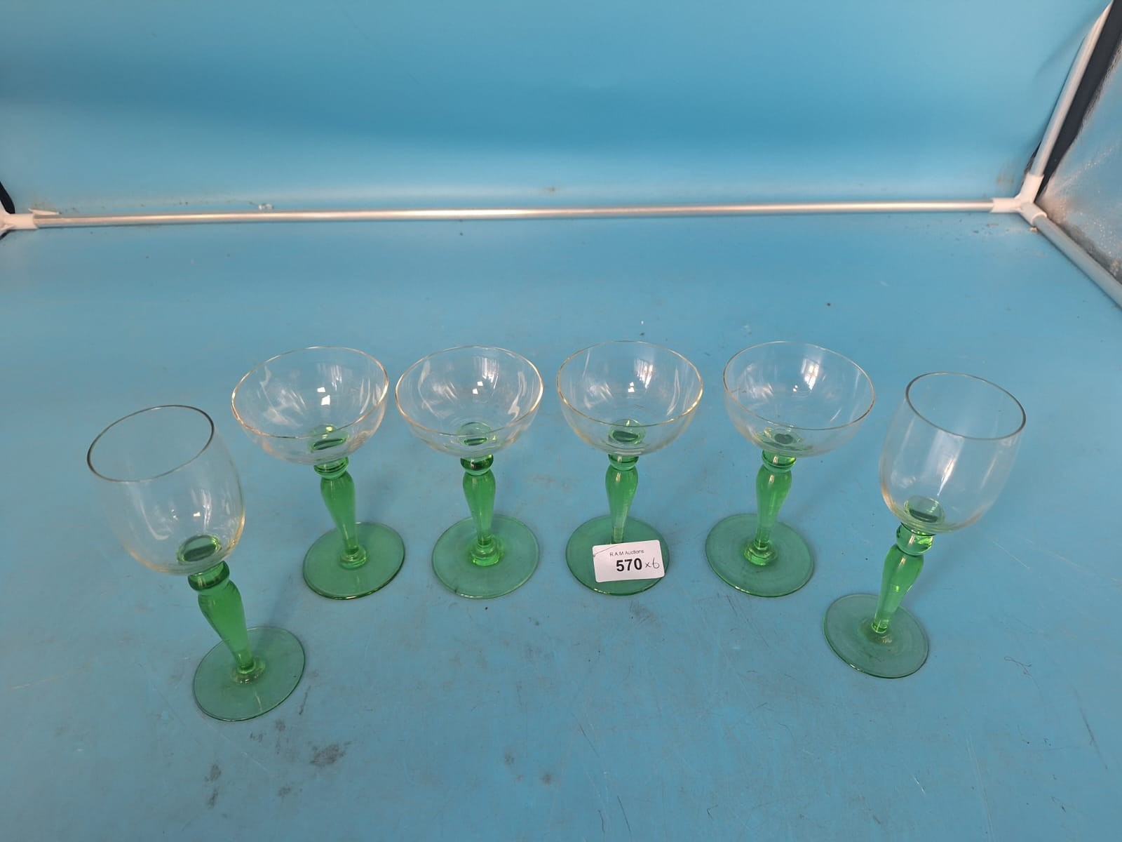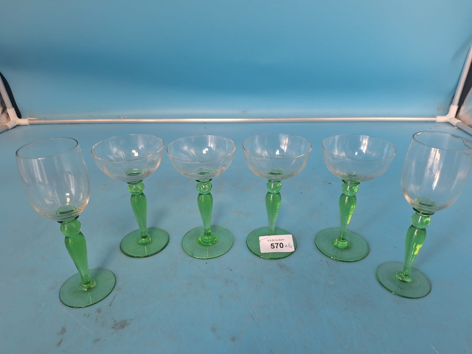 Set of six glass drinking vessels with light green stemmed bases and clear glass bowls.