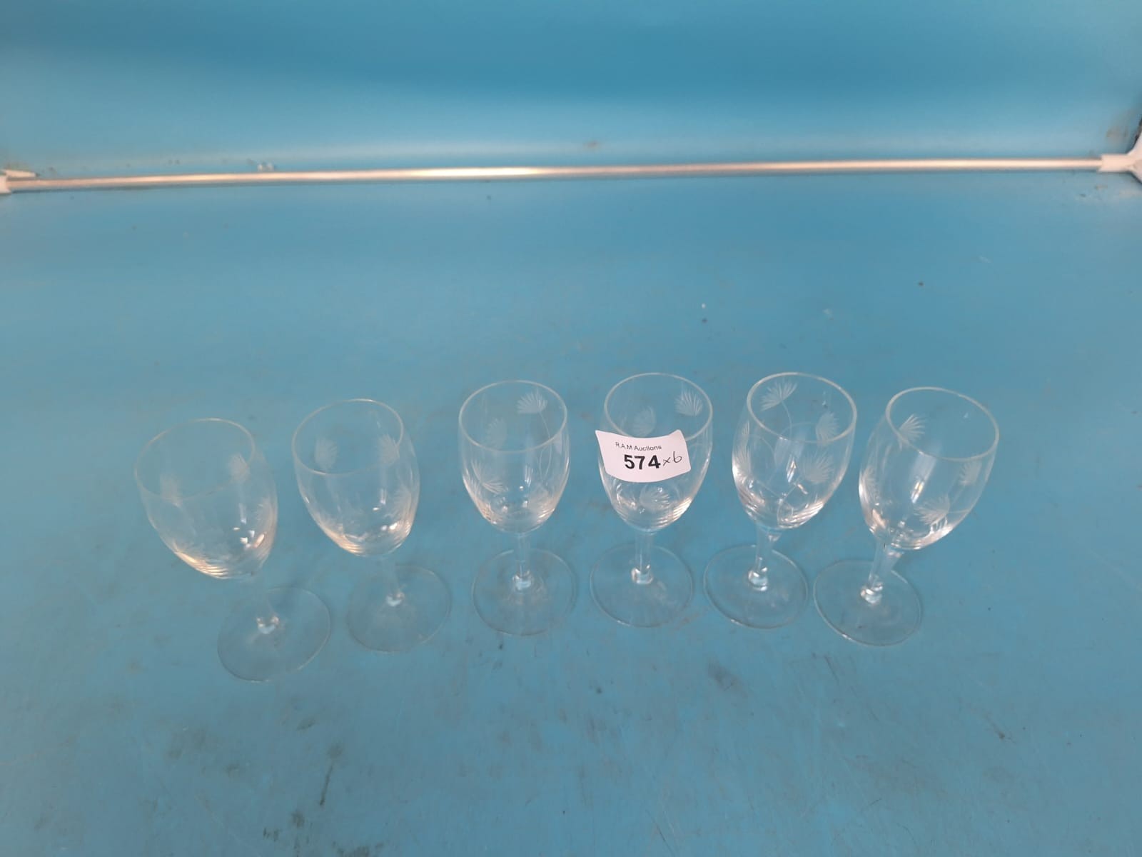Clear glass stemmed liqueur glasses with an etched stylized floral or feather-like pattern.