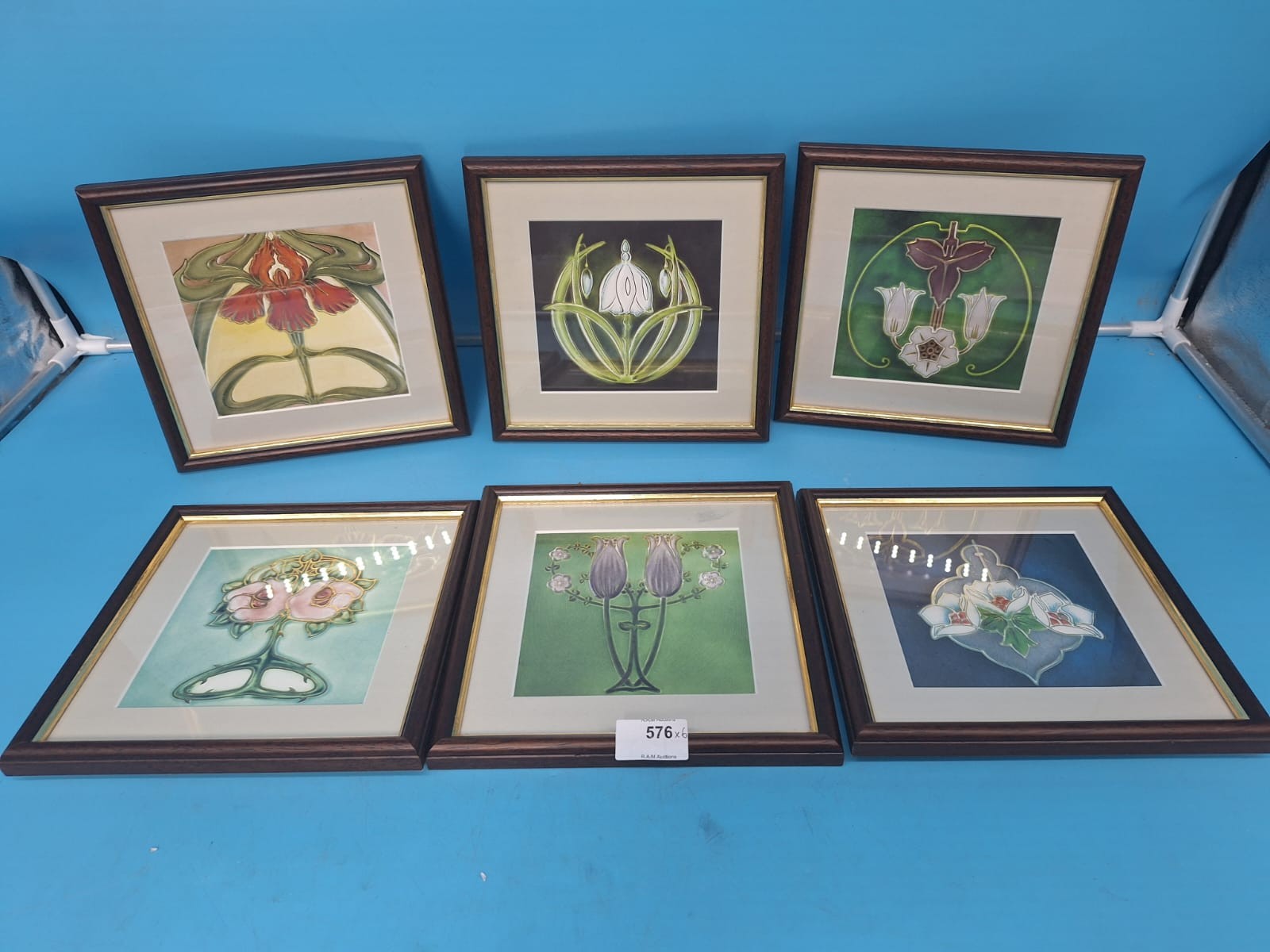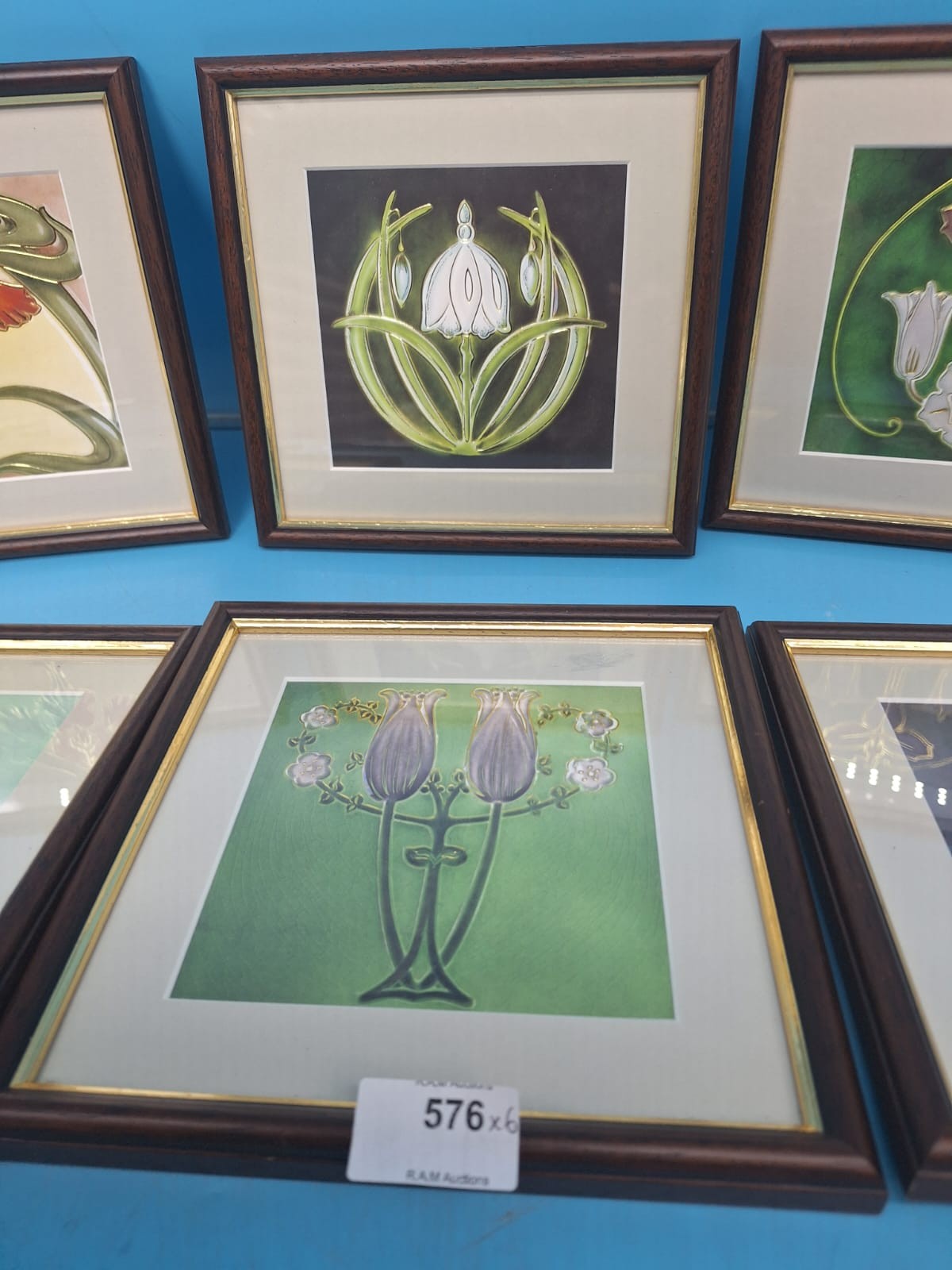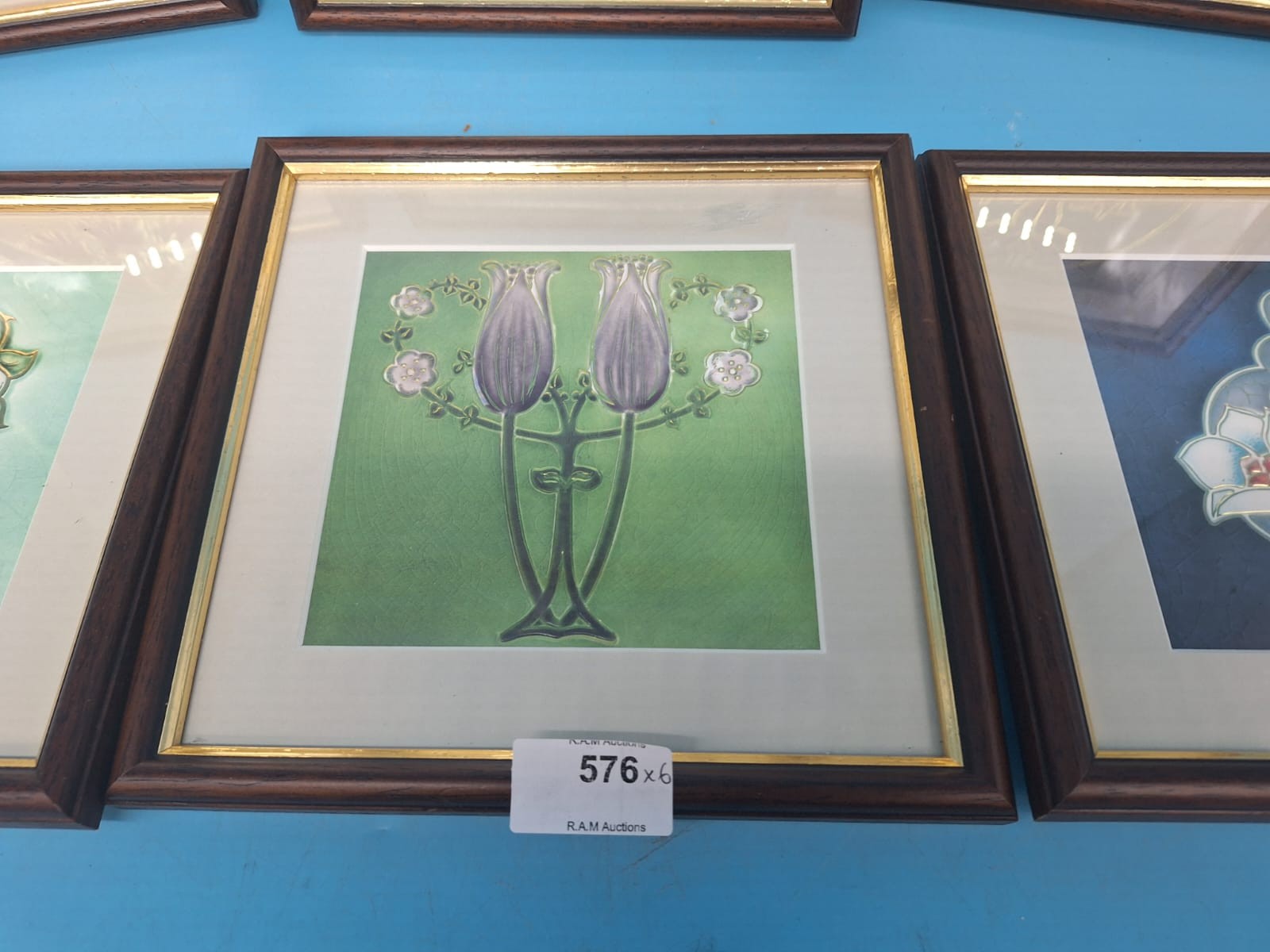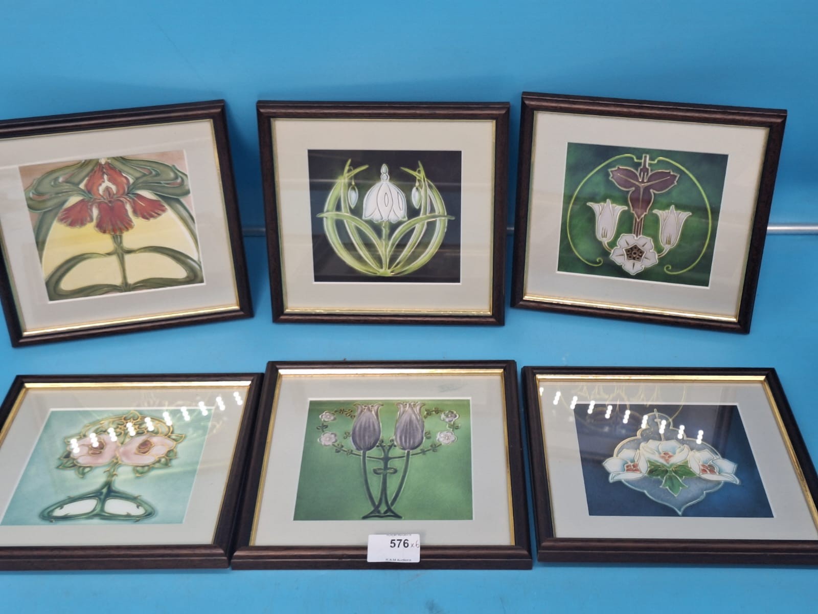 Stylized floral Art Nouveau prints on square tiles in dark brown wood frames with gold inner borders.