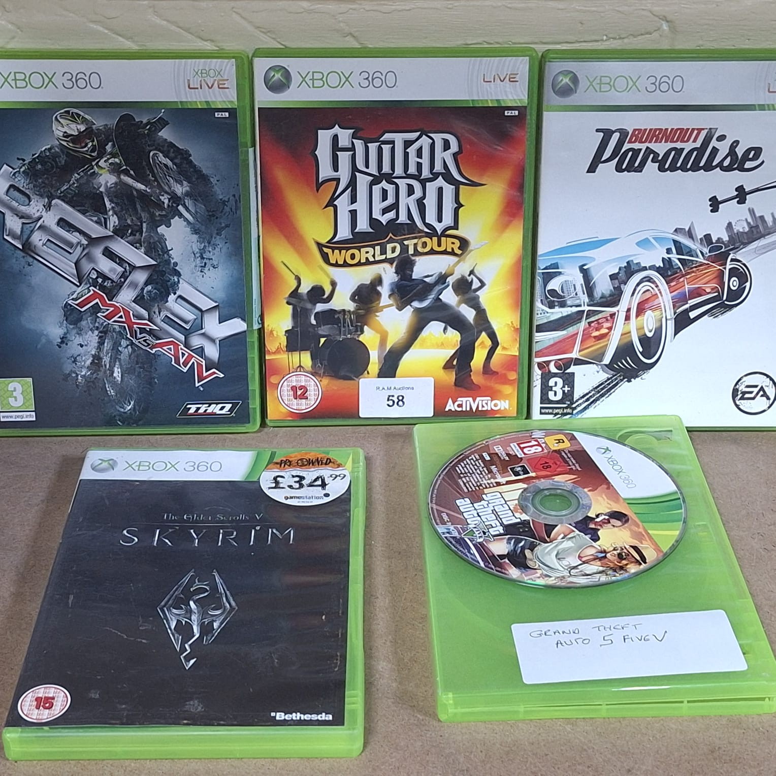 Used Xbox 360 game cases and discs for Grand Theft Auto 5, Skyrim: The Elder Scrolls V, Burnout Paradise, Guitar Hero World Tour, and Speed Max.
