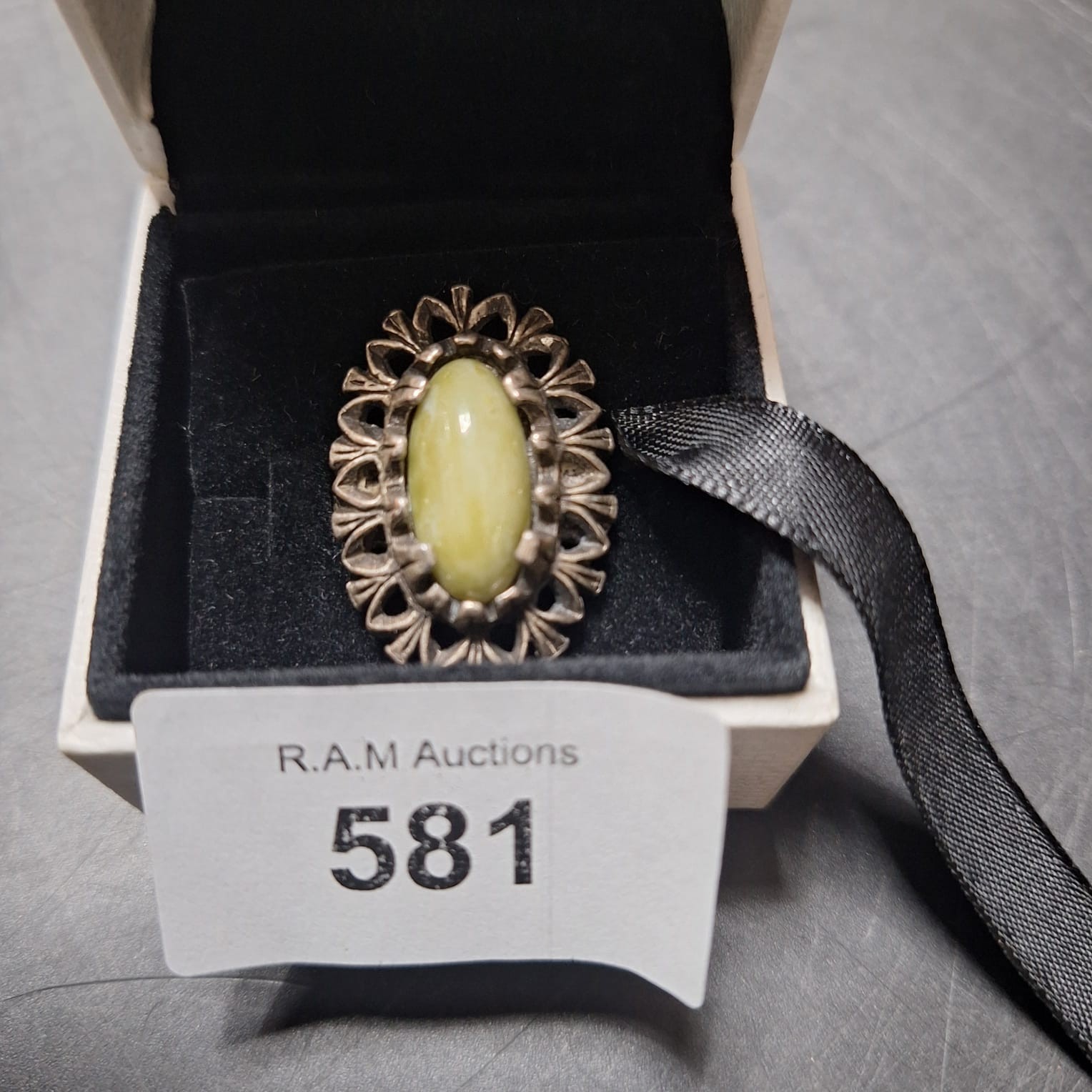 A pale yellowish-green oval cabochon stone in an ornate floral silver-toned setting.