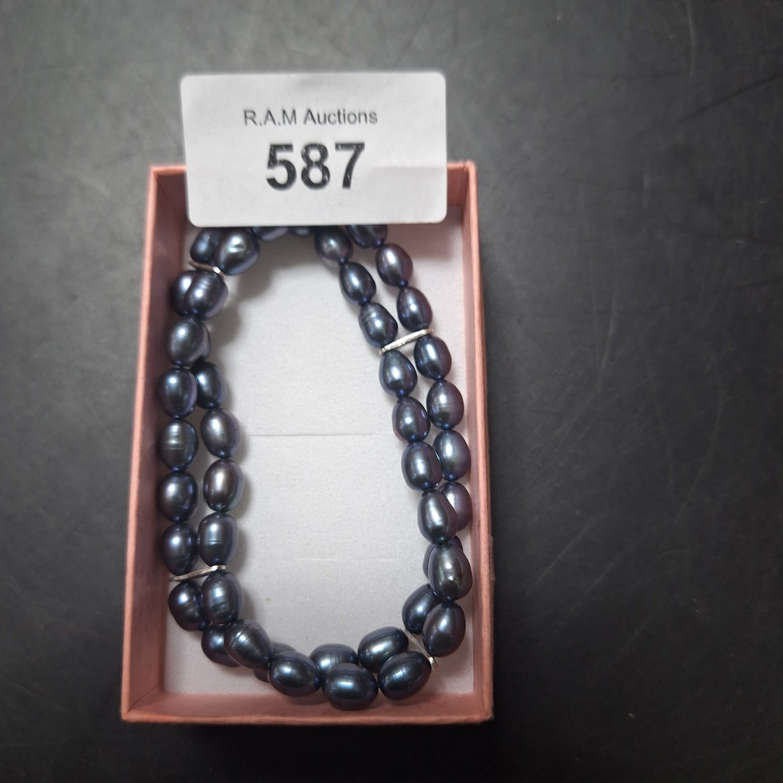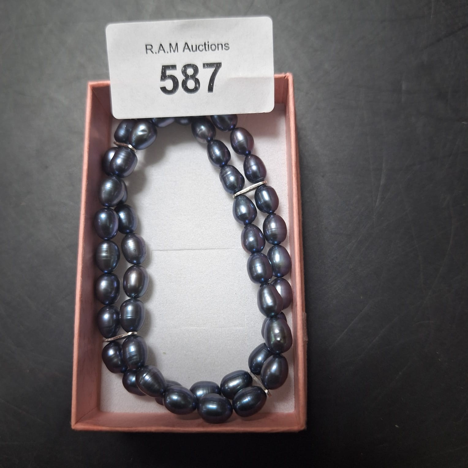 A double-strand bracelet featuring lustrous, oval, dark gray/blue pearls interspersed with small silver-toned beads, presented in a pink box.