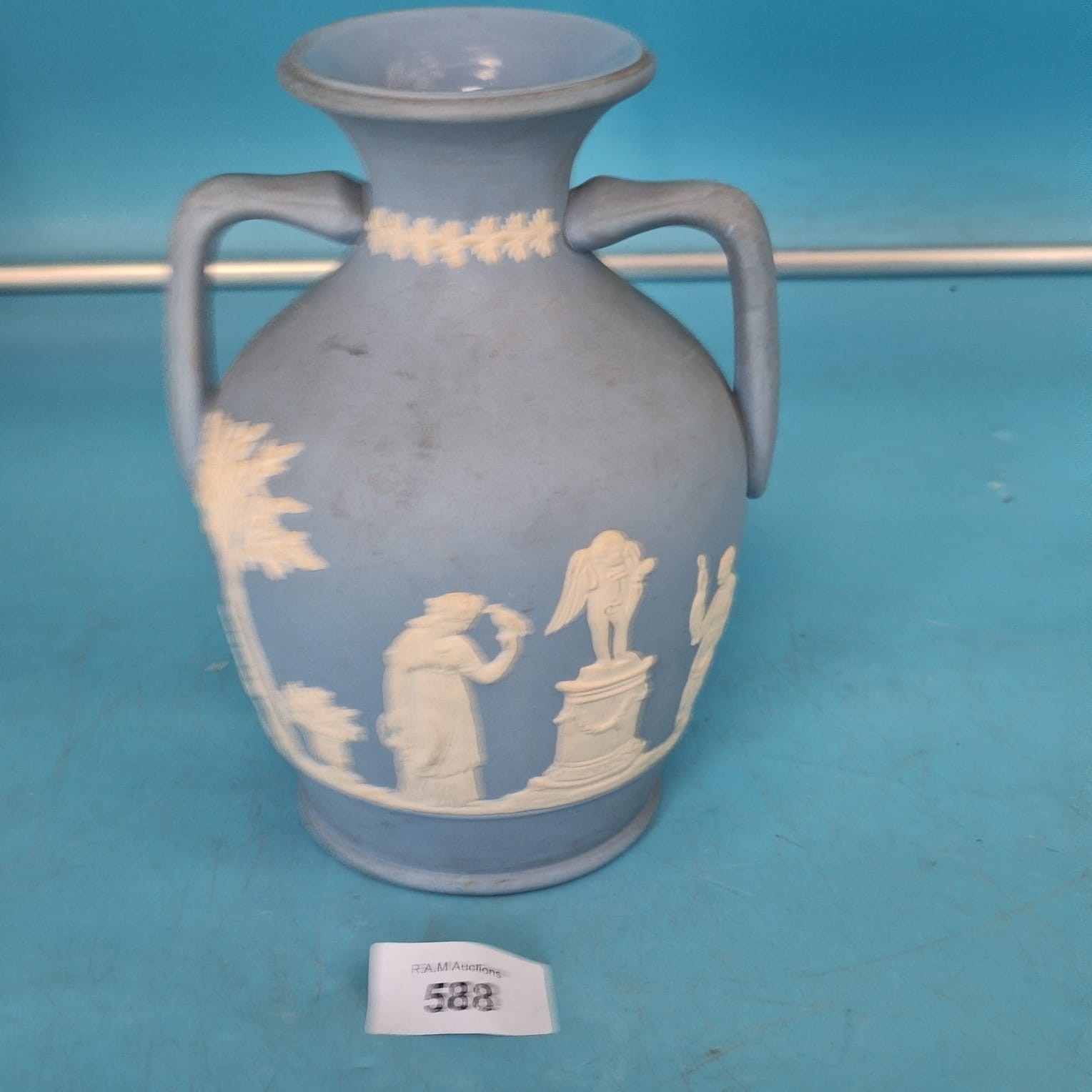 Pale blue ovular ceramic vase with two handles, featuring raised white relief classical figures and leaf detailing.