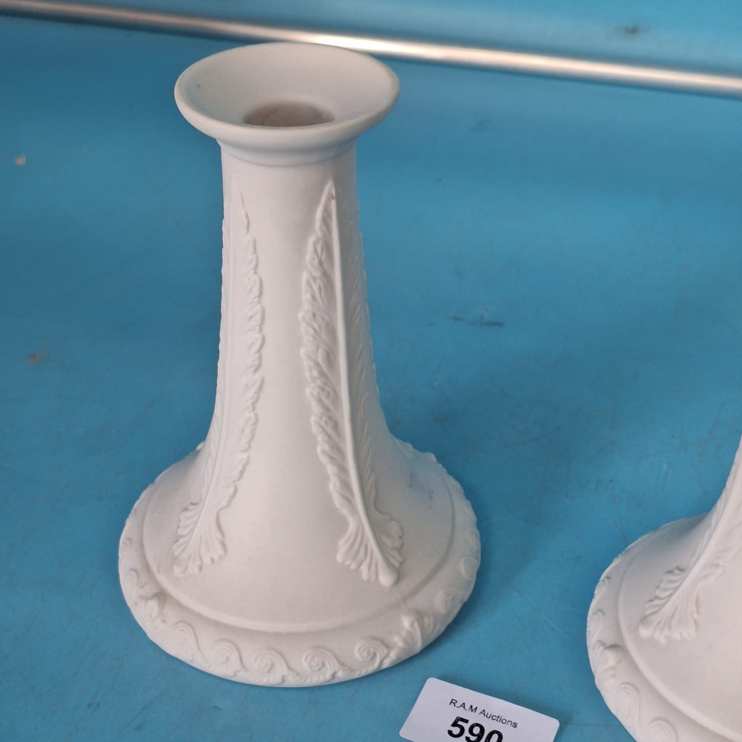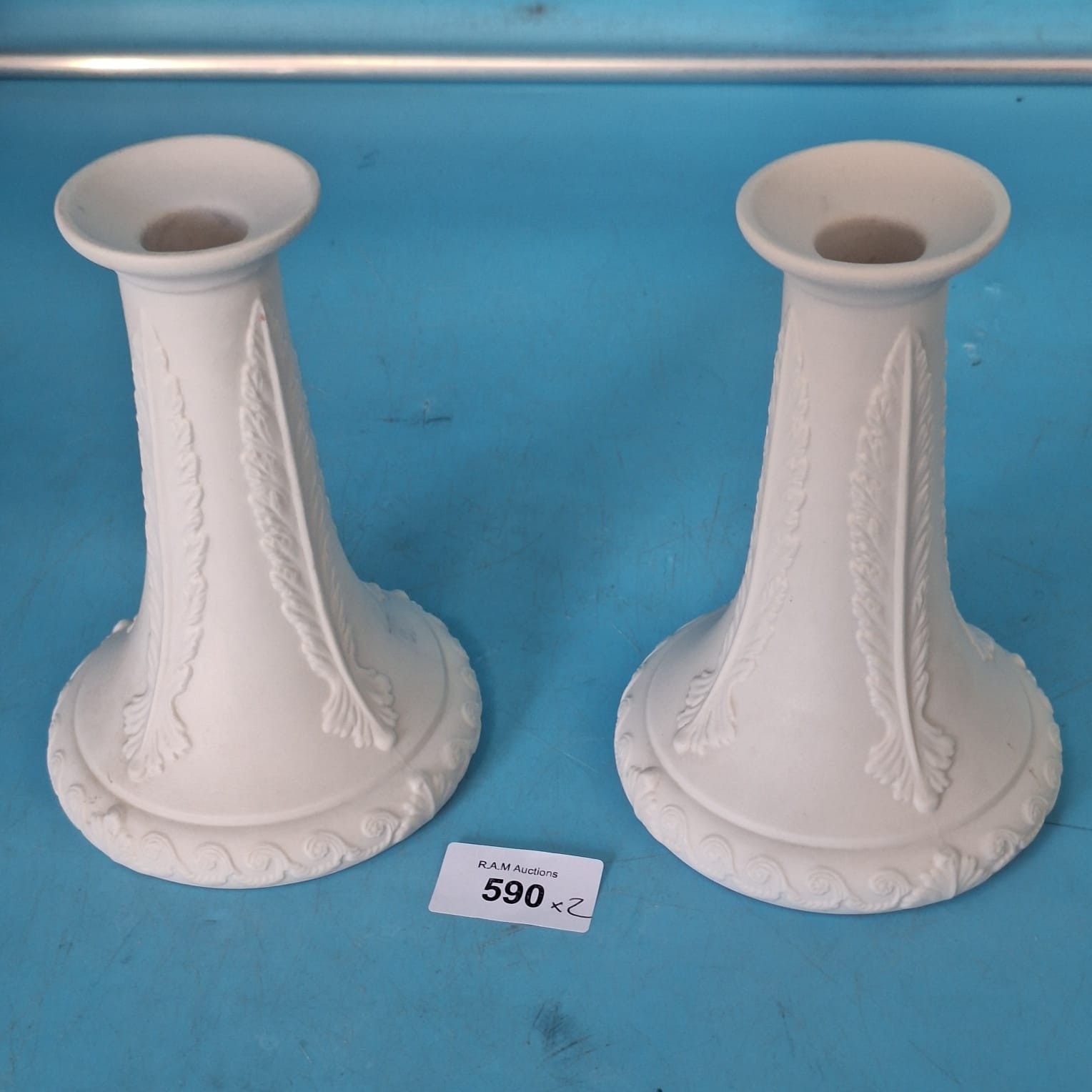 White porcelain candle holders with embossed leaf patterns and decorative borders.