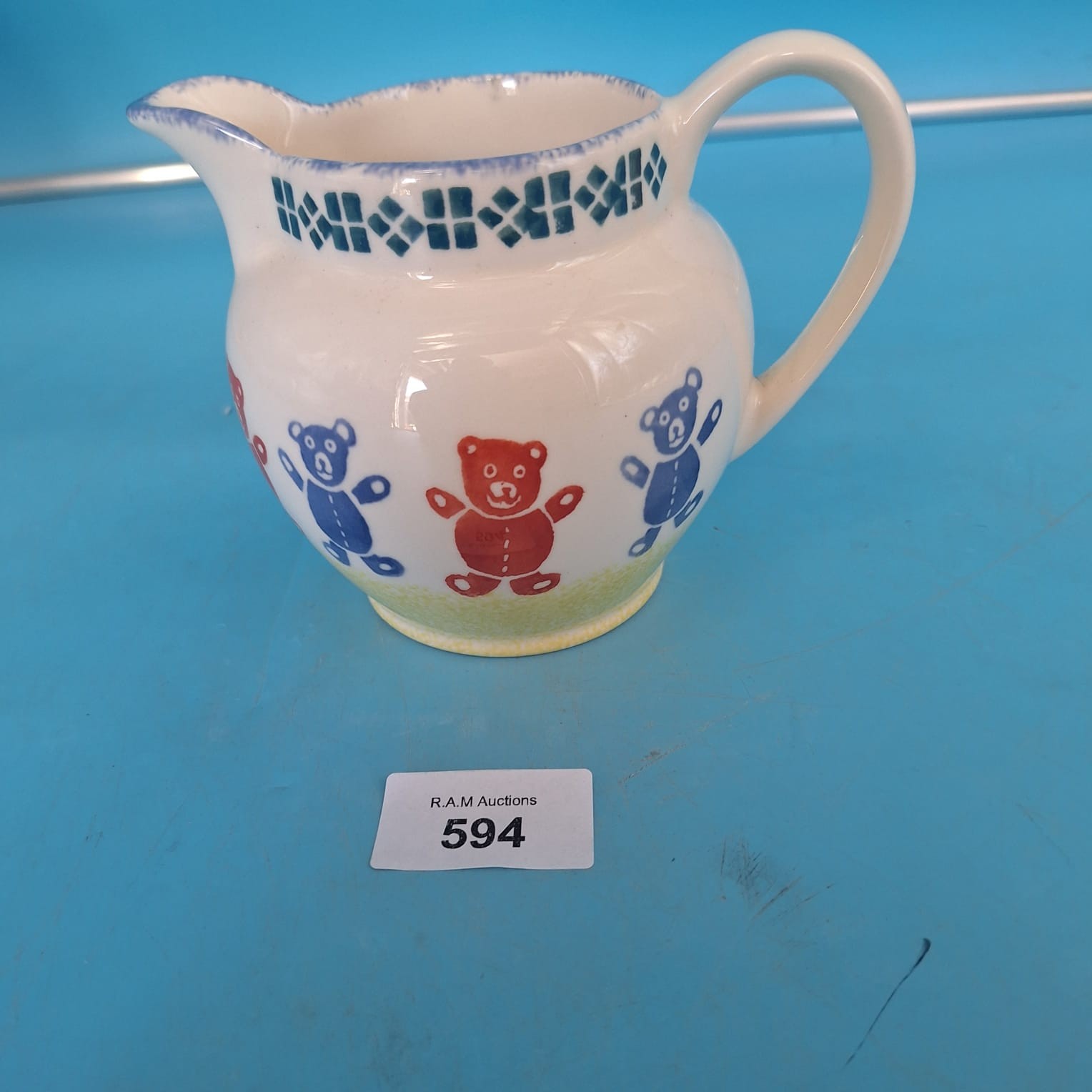 Cream ceramic creamer with geometric pattern and stylized teddy bears.