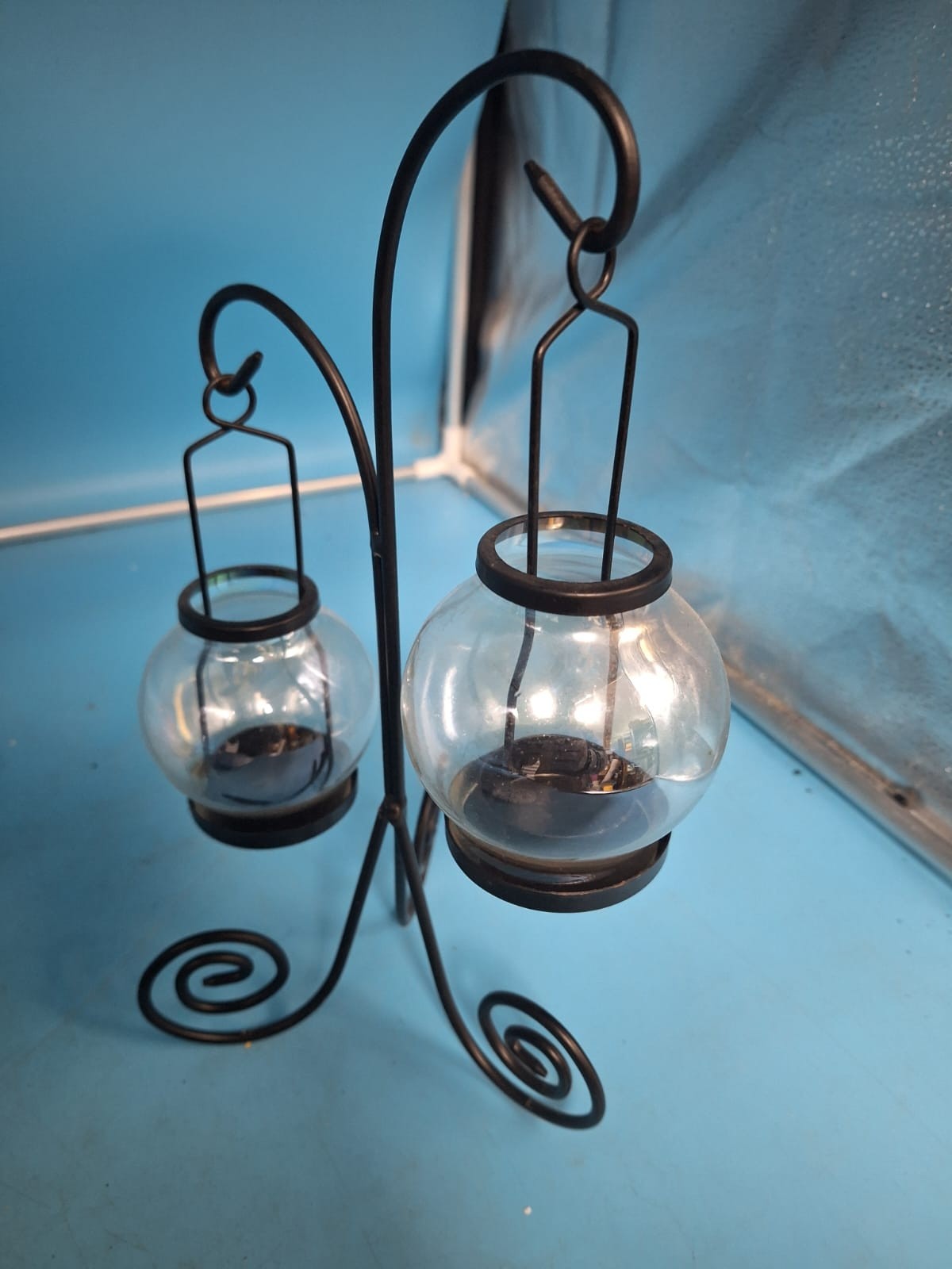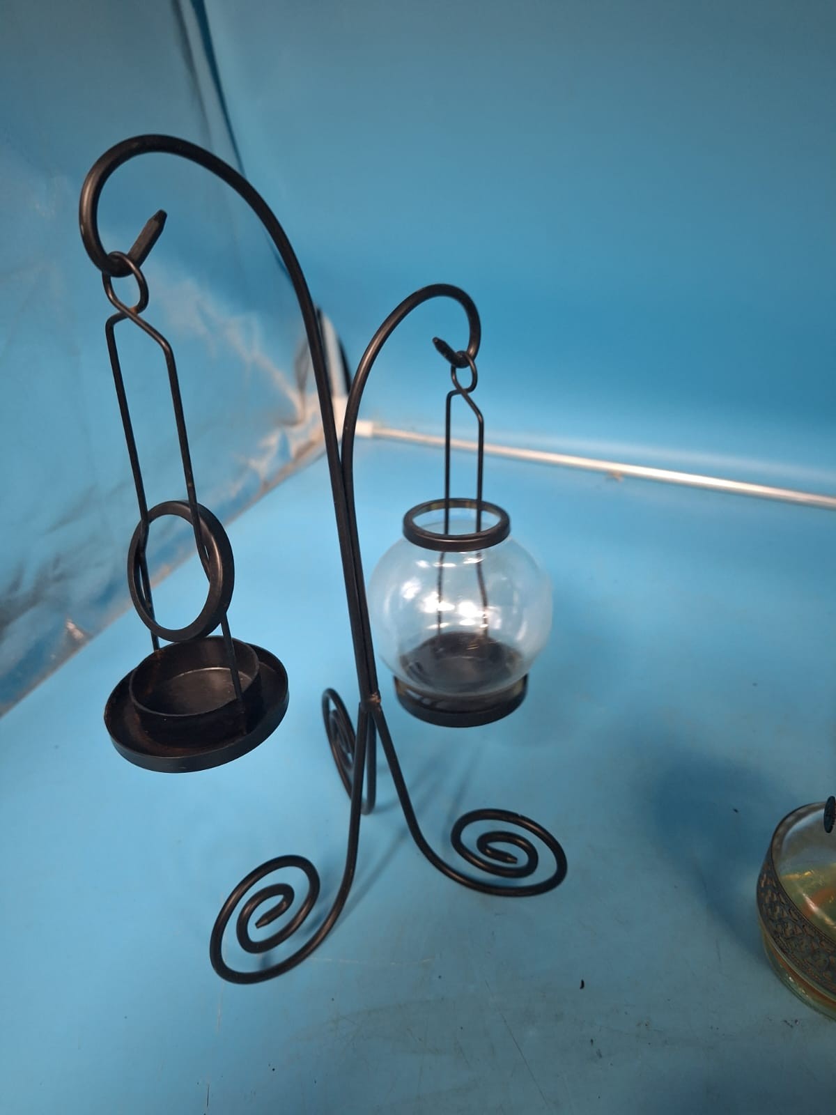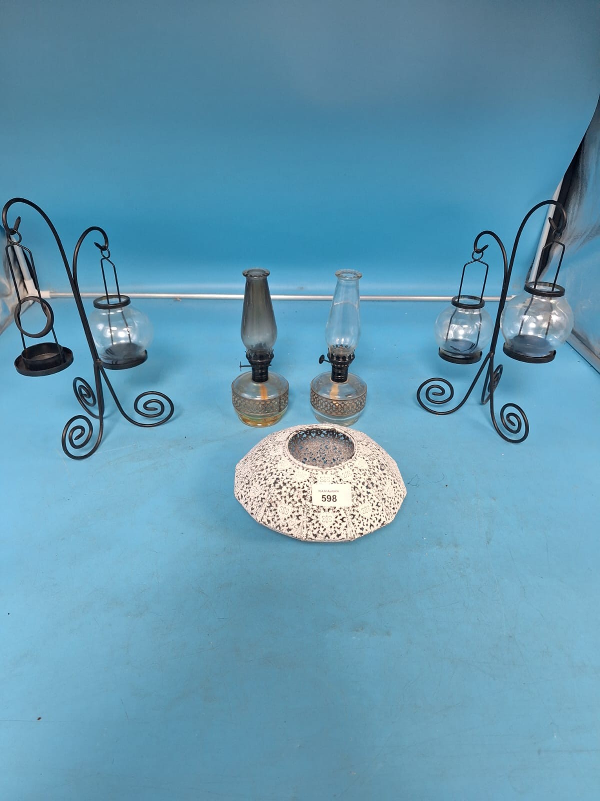 Black metal candle holders with glass globes, oil lamps with glass chimneys, and a decorative bowl.