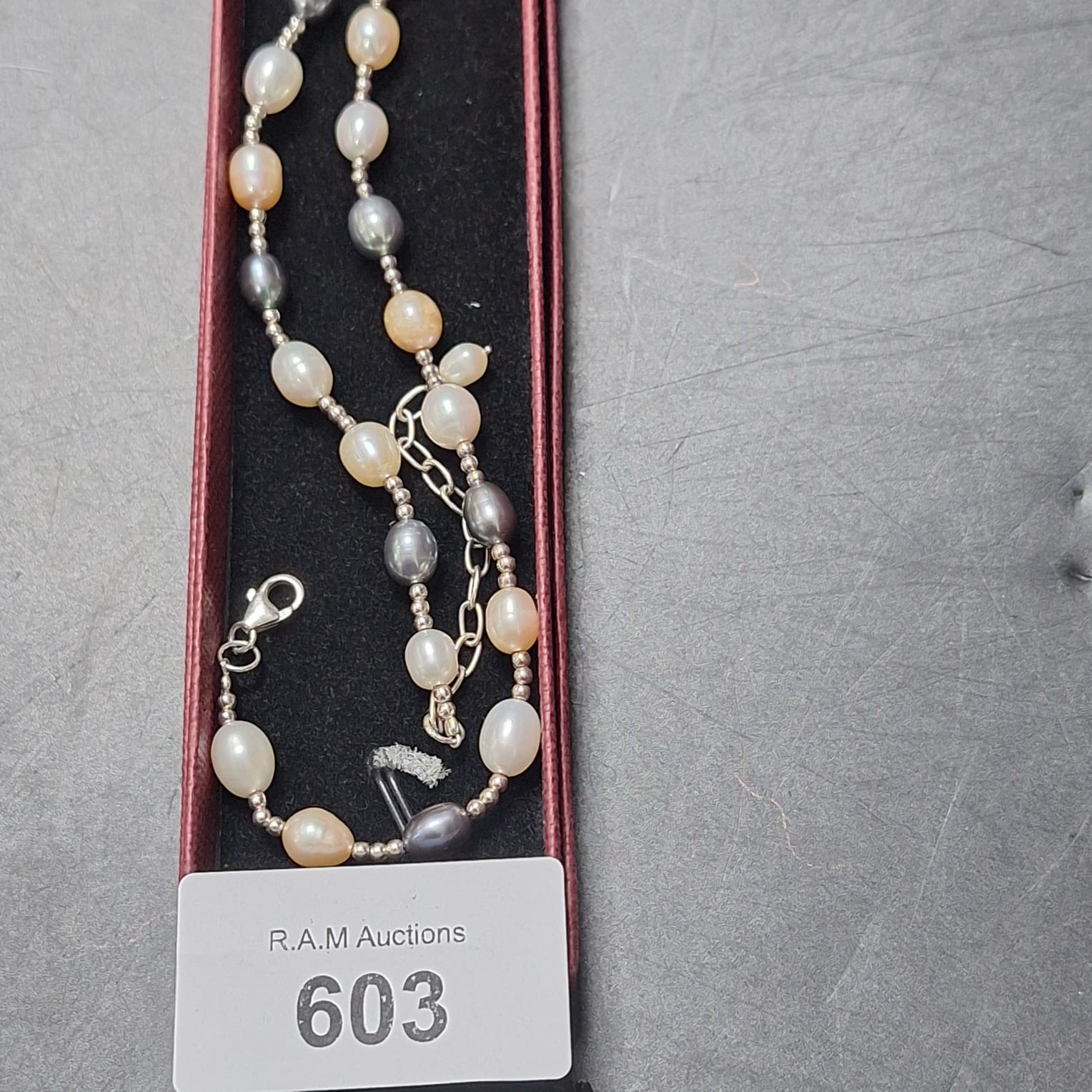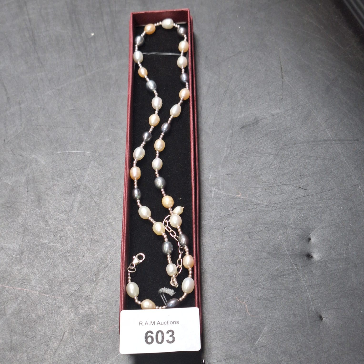 A multicolor pearl necklace with a silver clasp presented in a burgundy box.