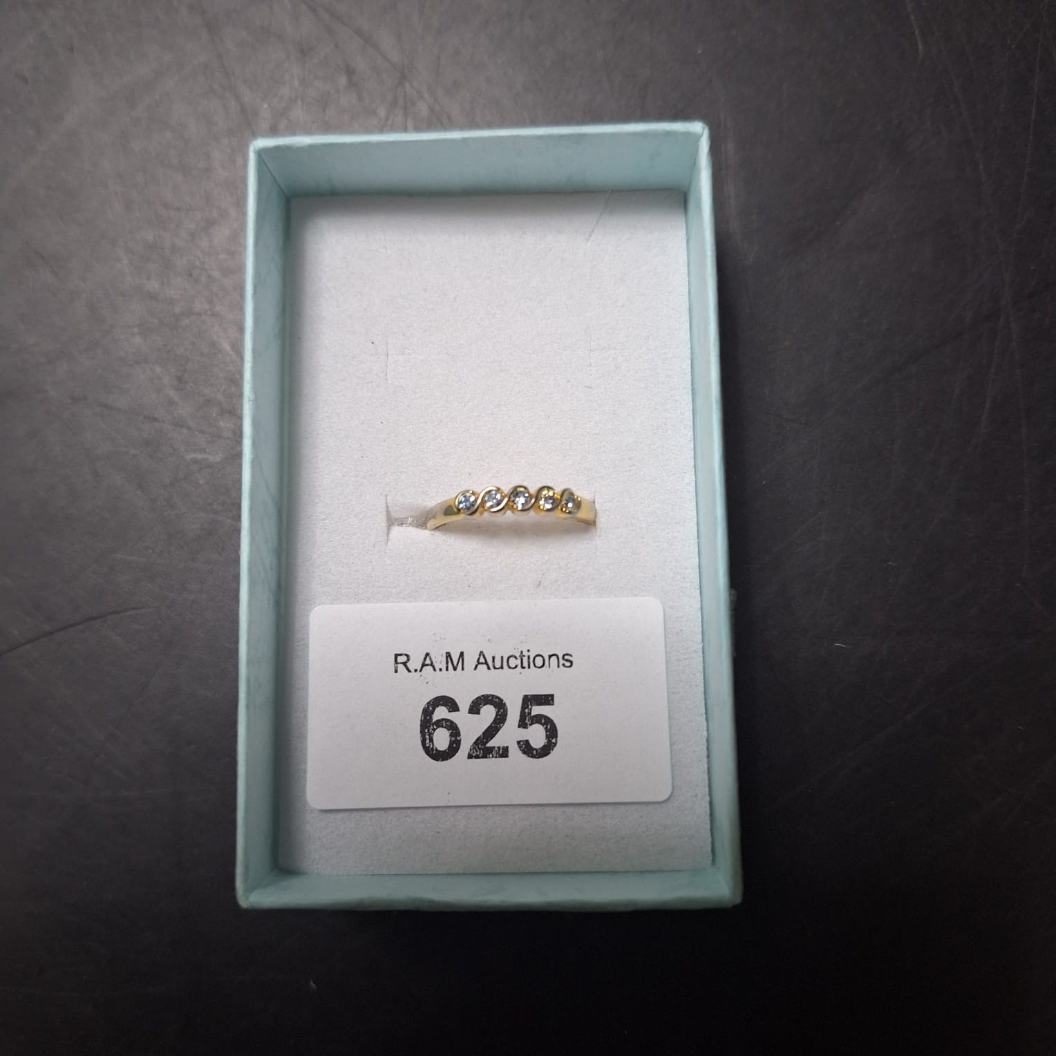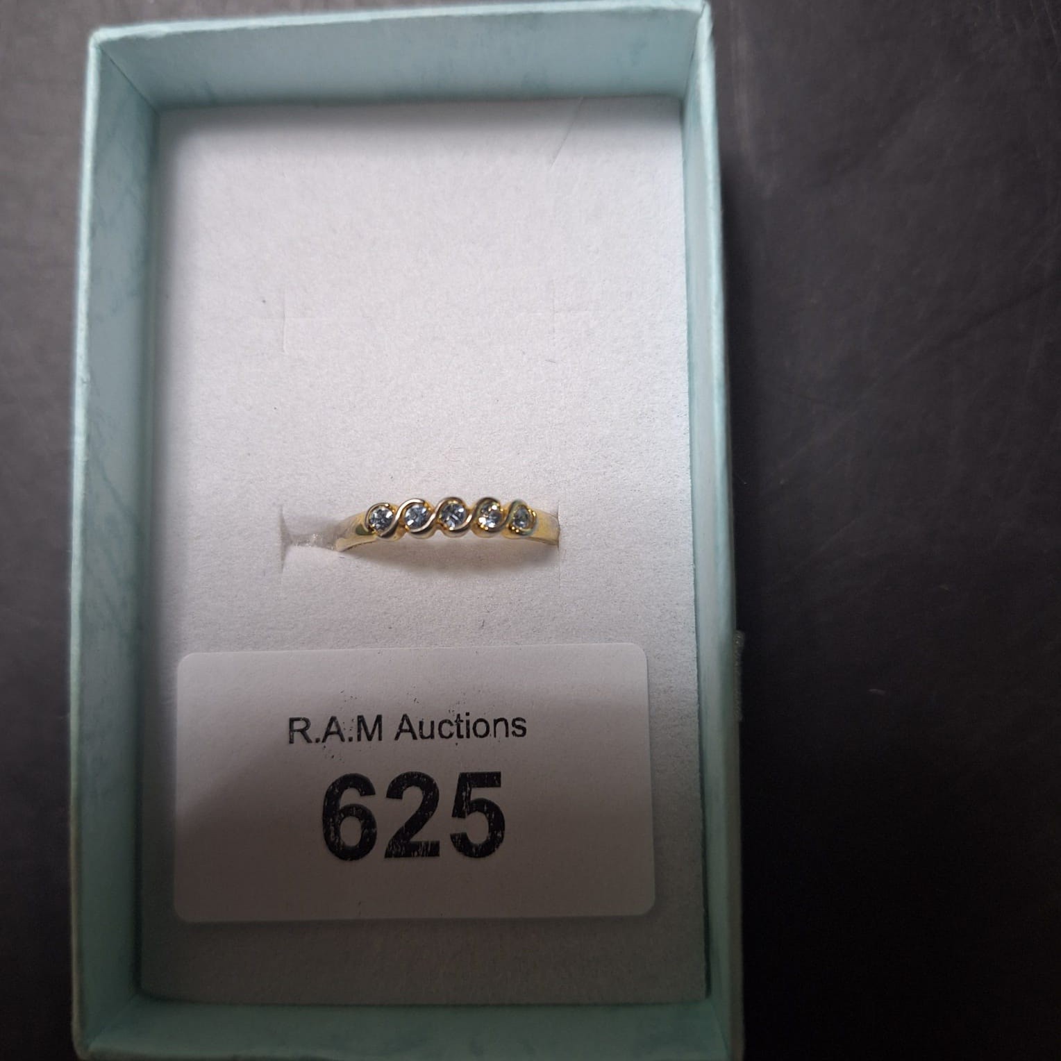 A gold-colored band ring featuring five small clear stones in a wavy, twisted setting.