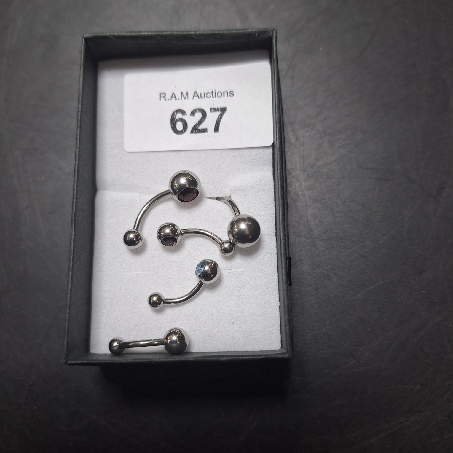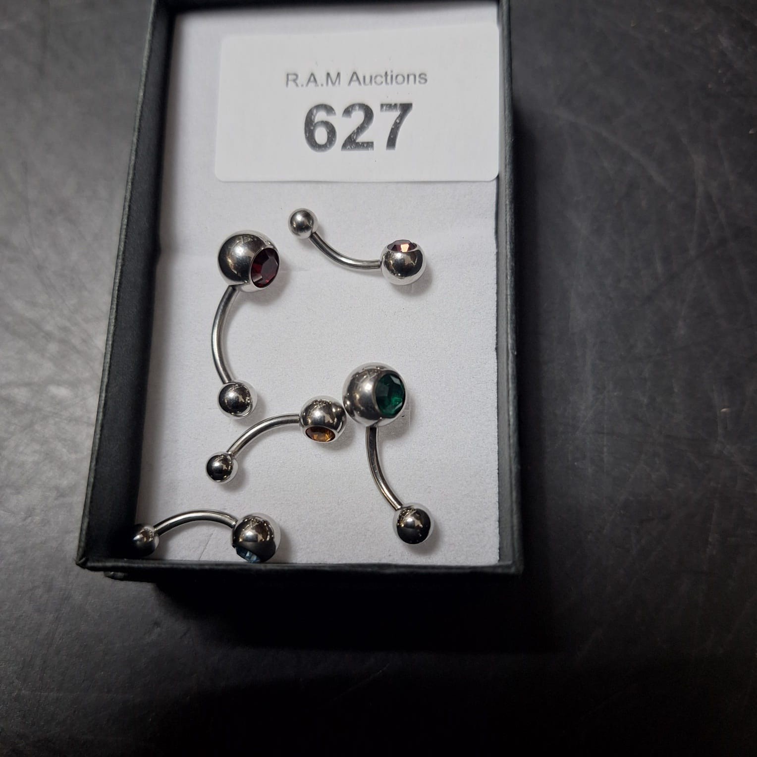 Silver-toned curved barbell body piercings with gemstone-set balls.