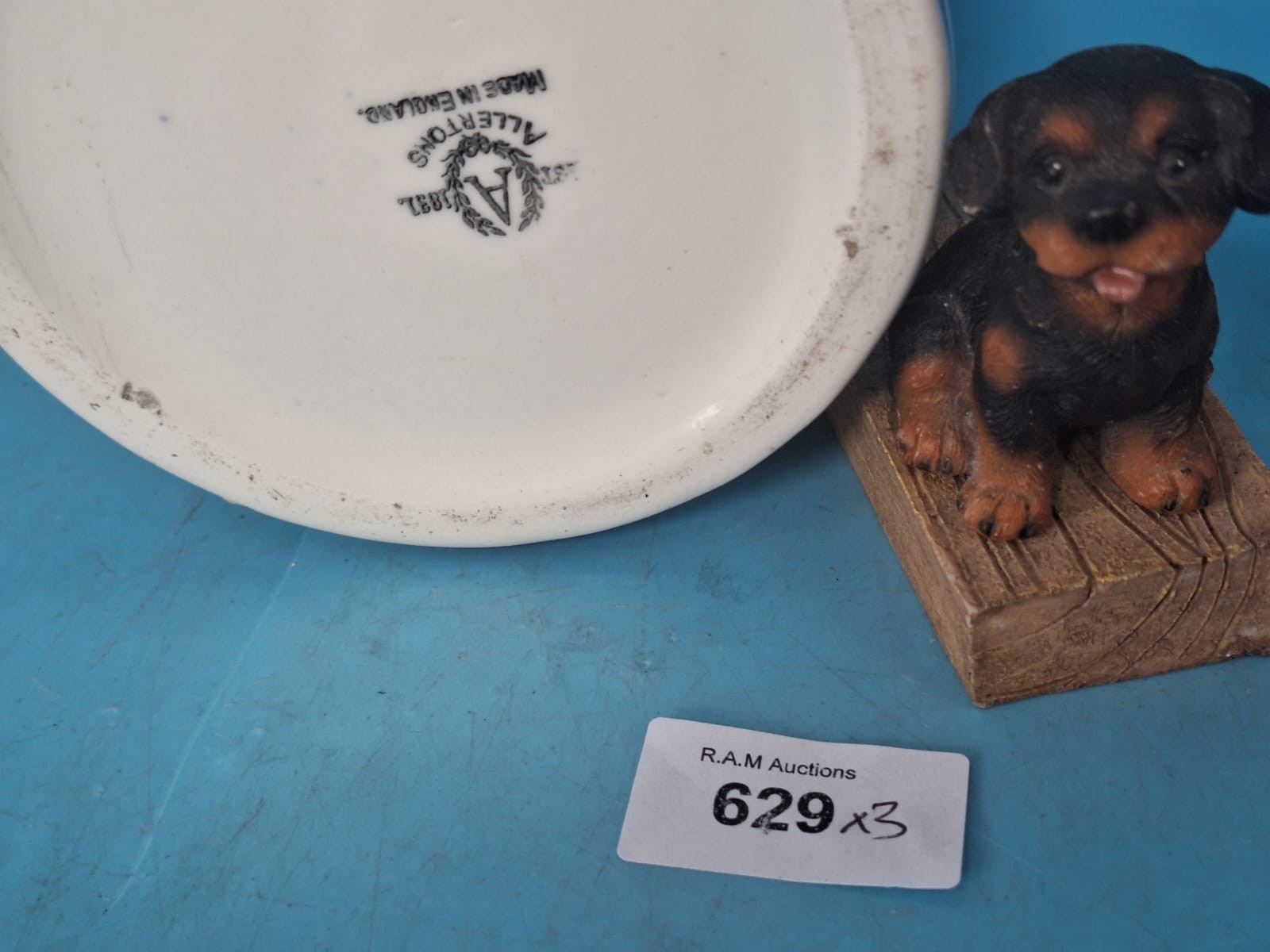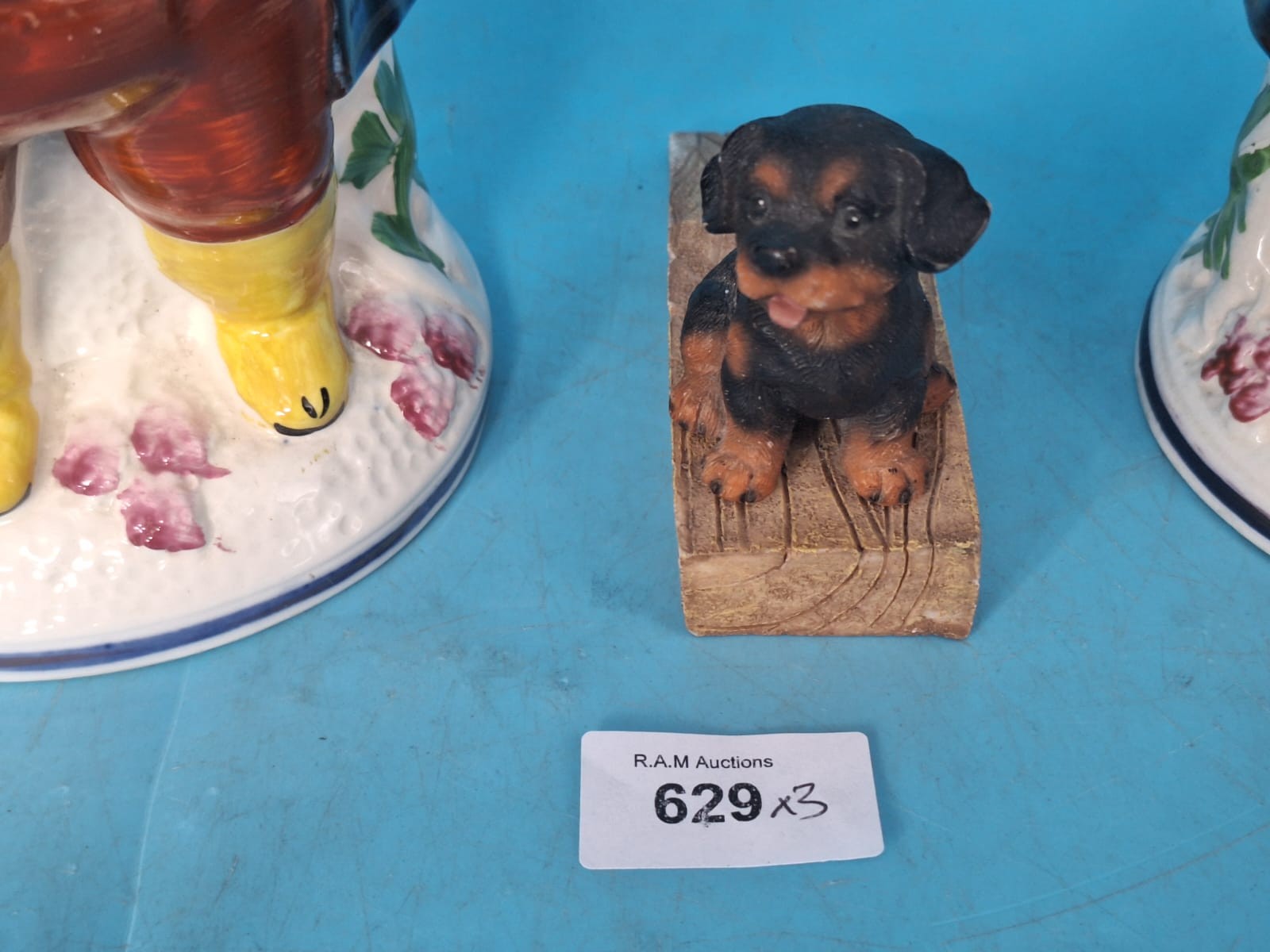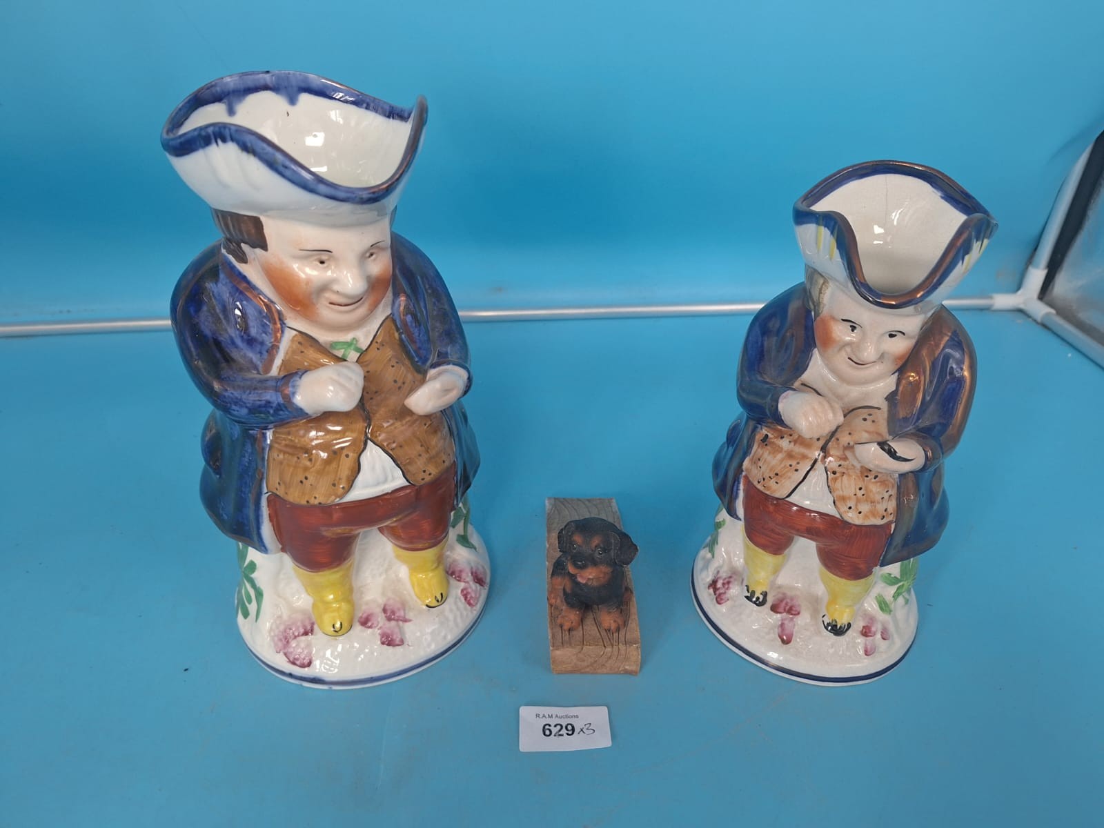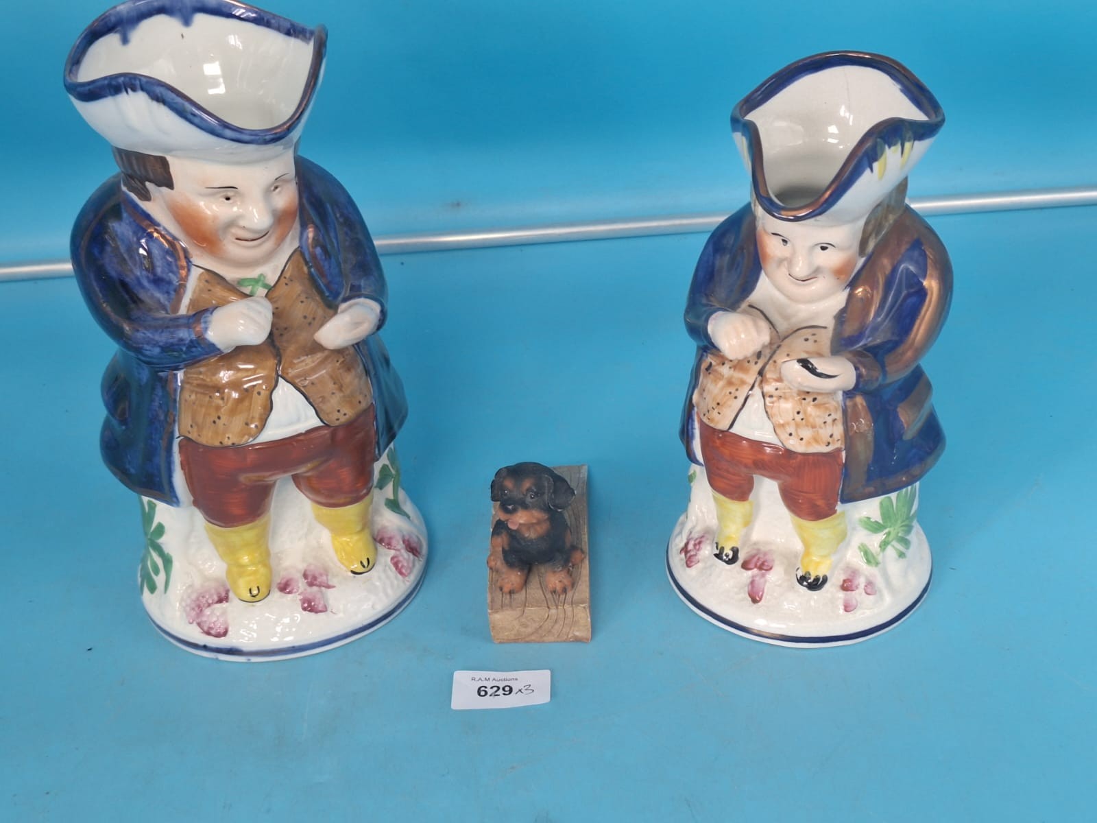Allertons blue ceramic jugs shaped as colonial men with a dachshund figurine.