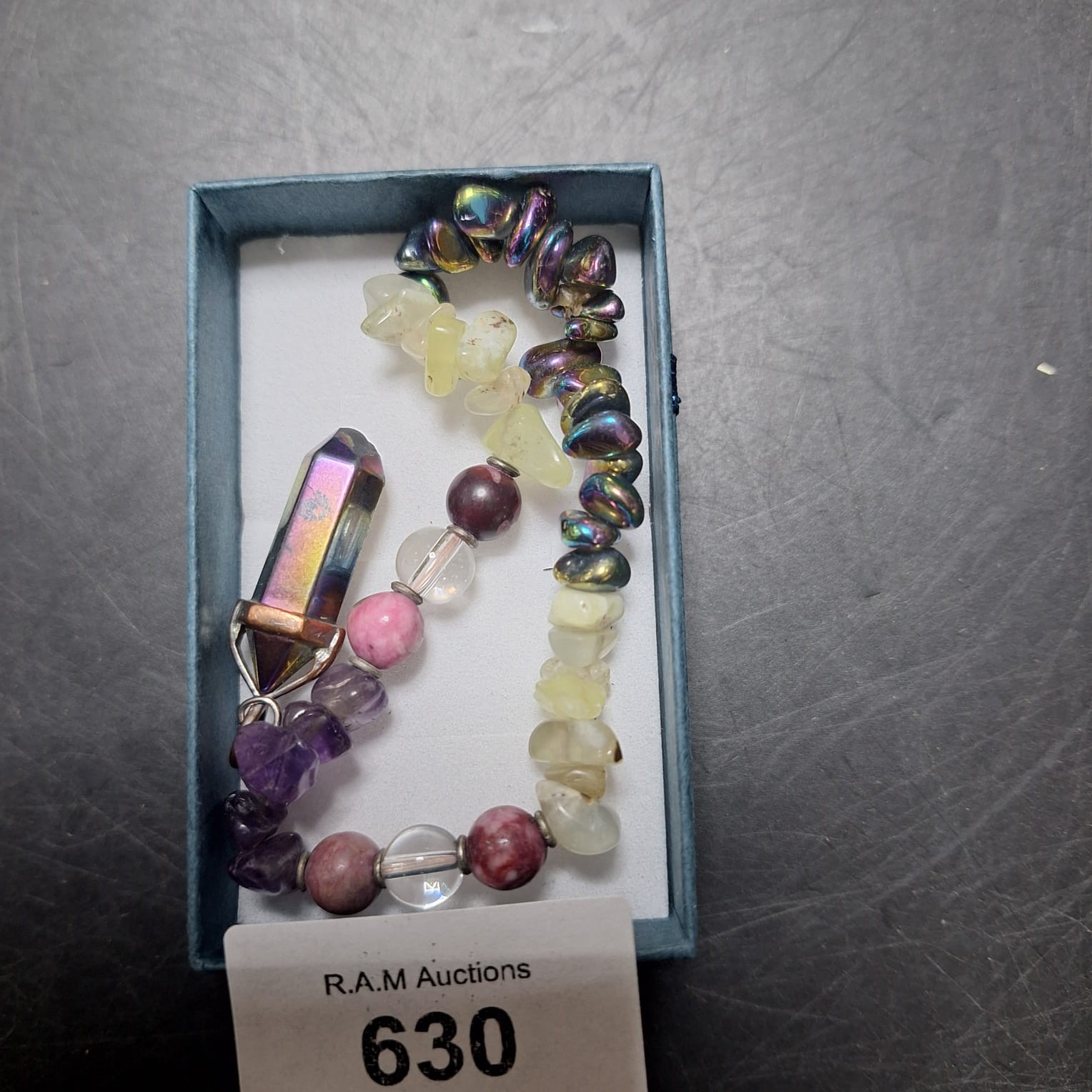 A bracelet and pendant set featuring a variety of iridescent and clear quartz beads on silver-toned wire, with a faceted iridescent pendant.