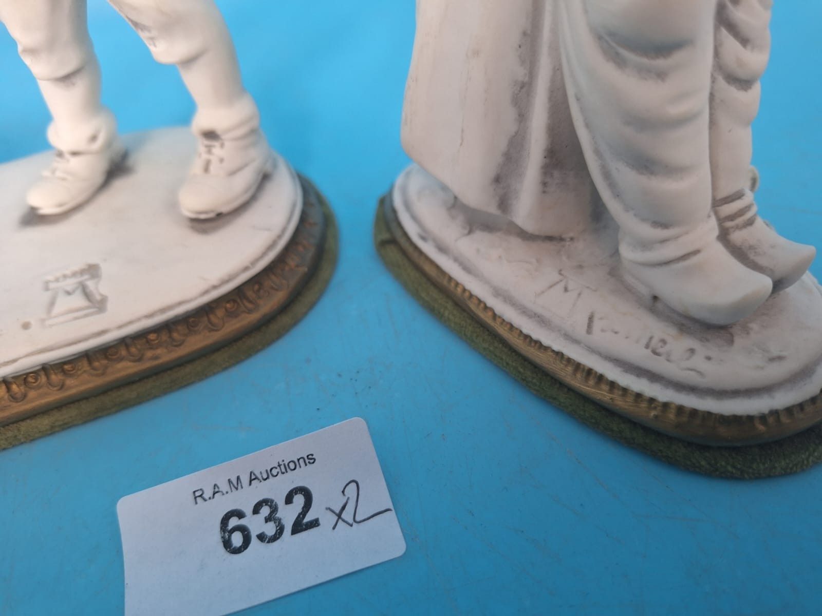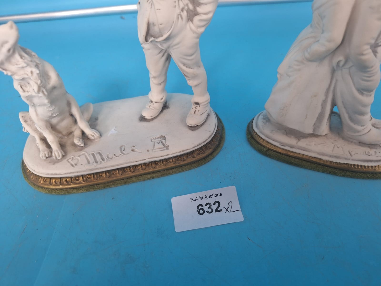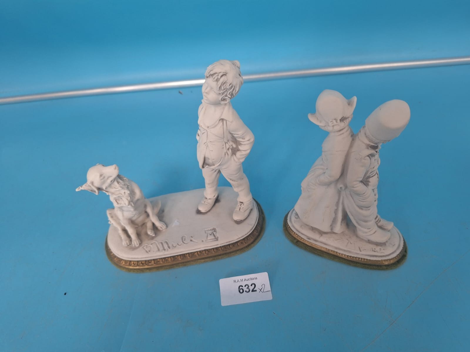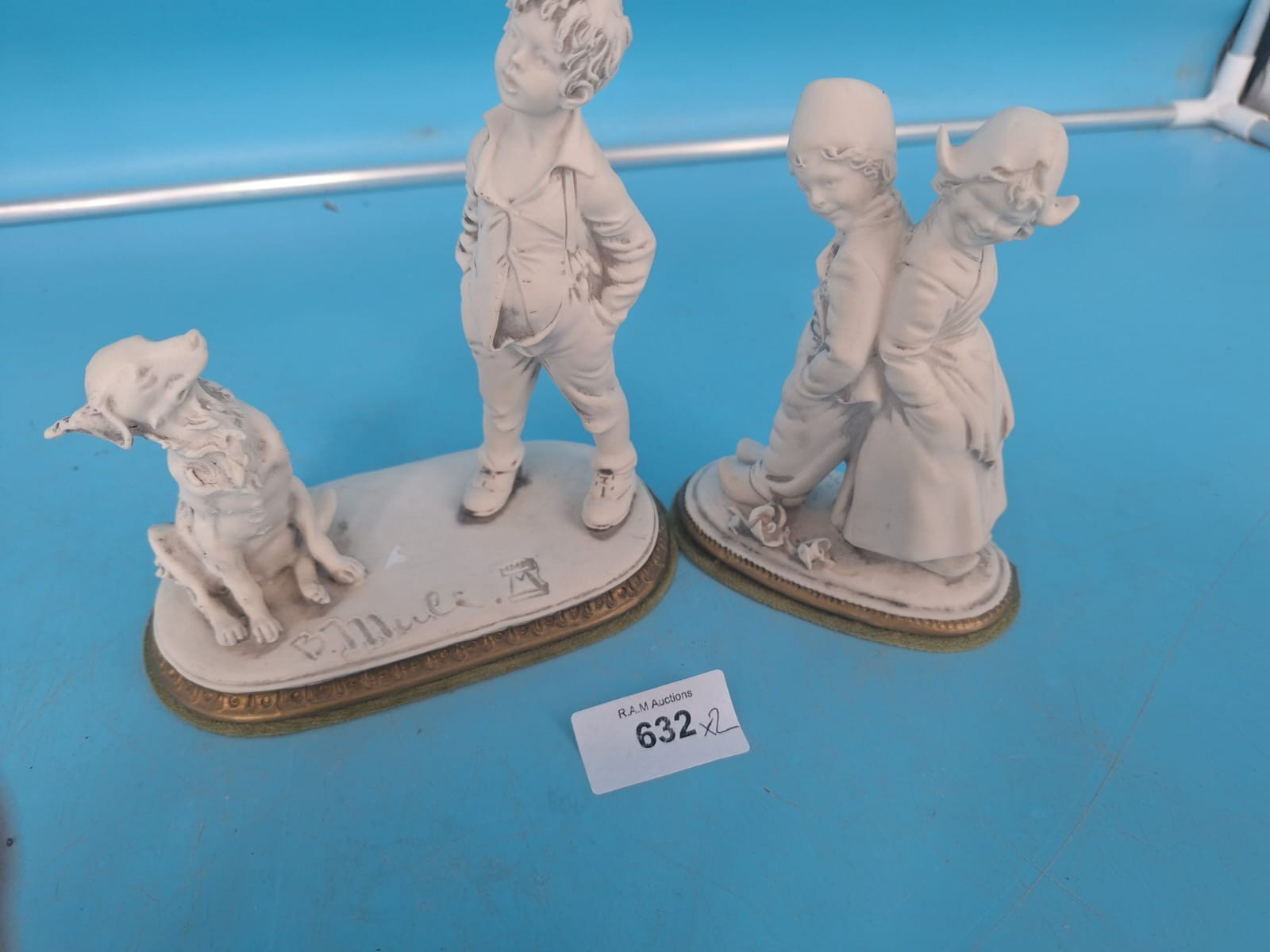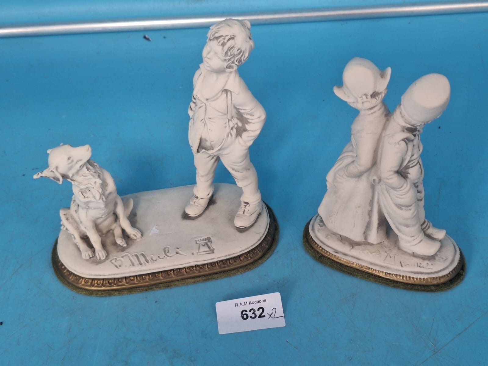 Figurines of a boy with a dog and two children on oval bases with gold trim, marked “P.Muel.”