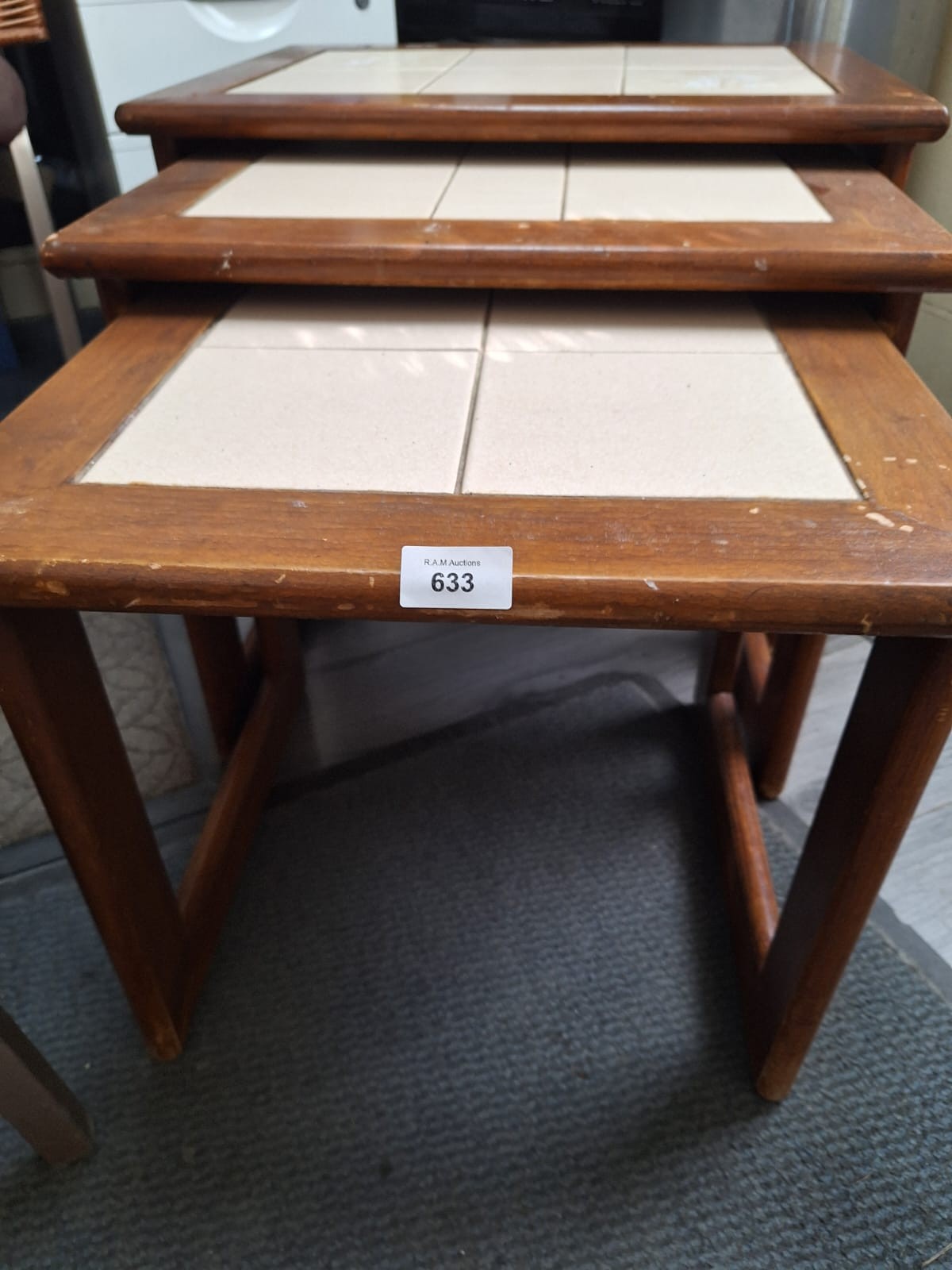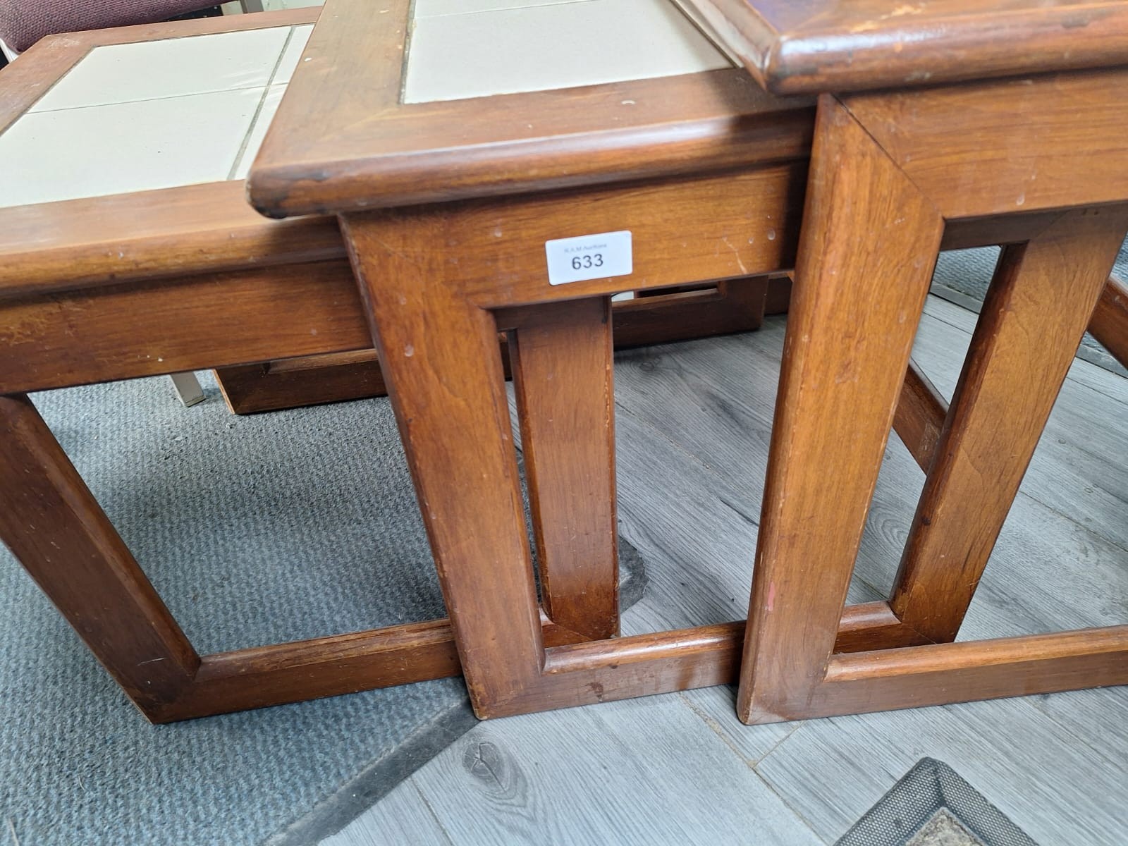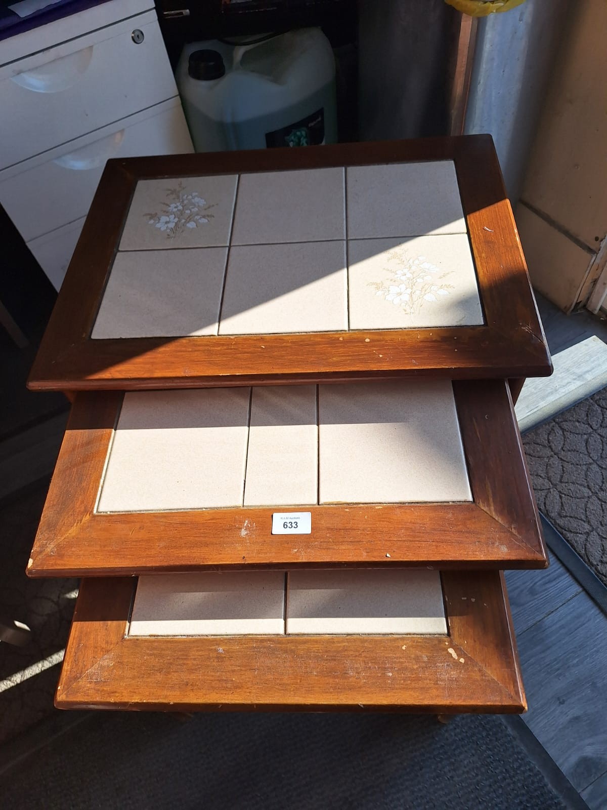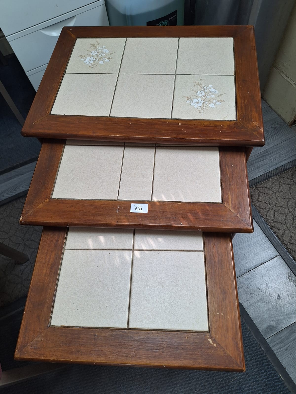 Nest of three rectangular coffee tables with off-white tiled tops featuring a floral pattern and dark brown wooden frames.