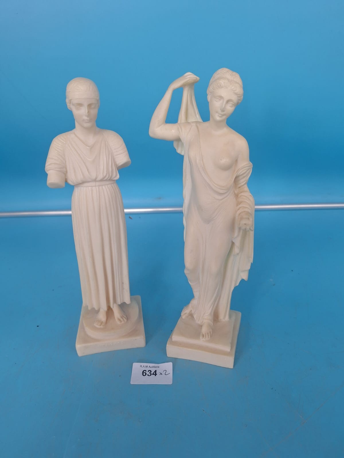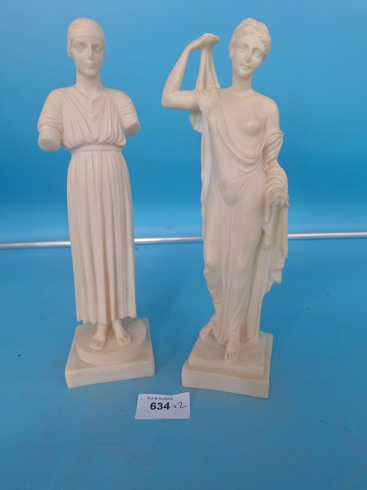 Off-white alabaster figurines depicting draped female figures in classical styles, one with missing arms.