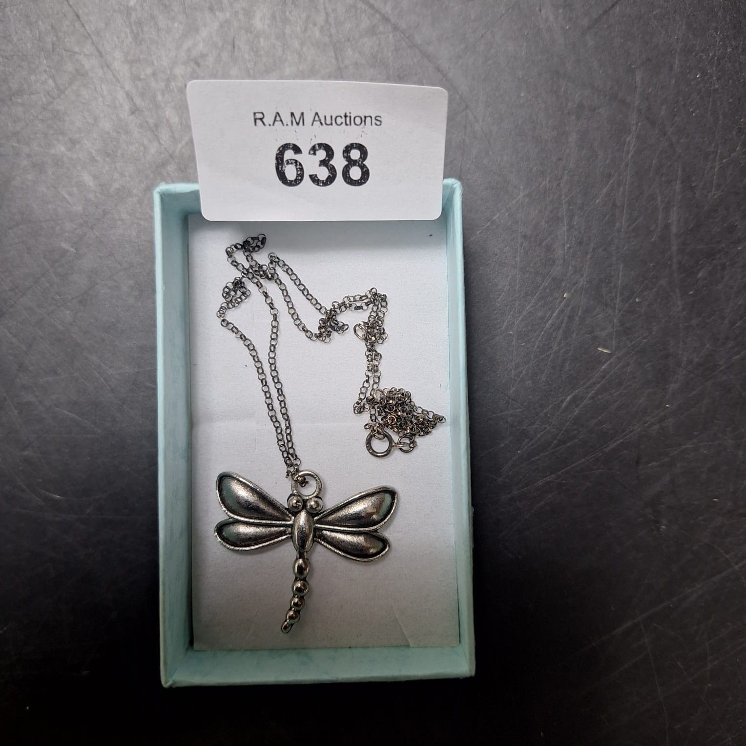 Silver-toned metal dragonfly pendant necklace with a beaded body on a delicate chain, presented in a light teal box.
